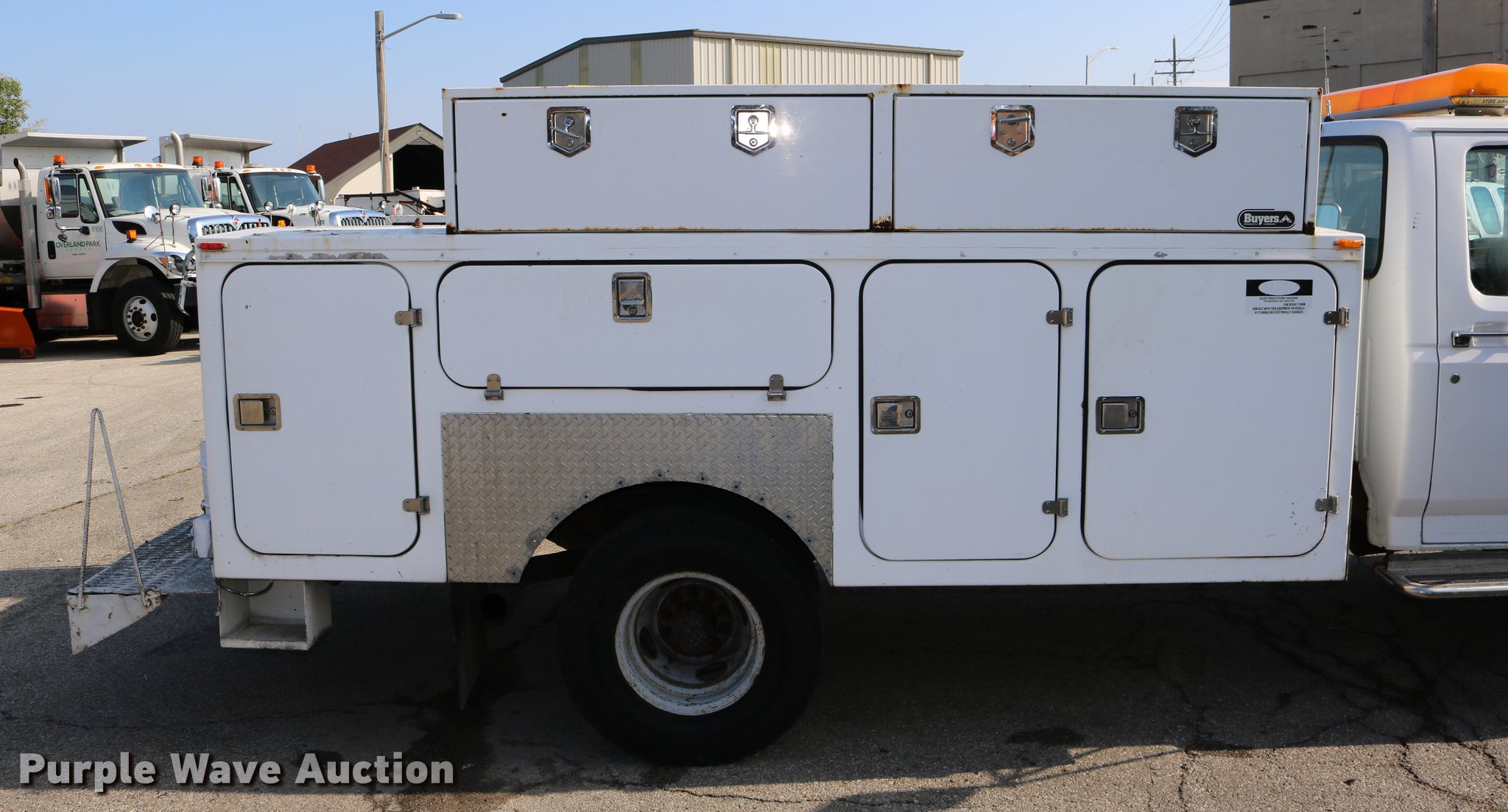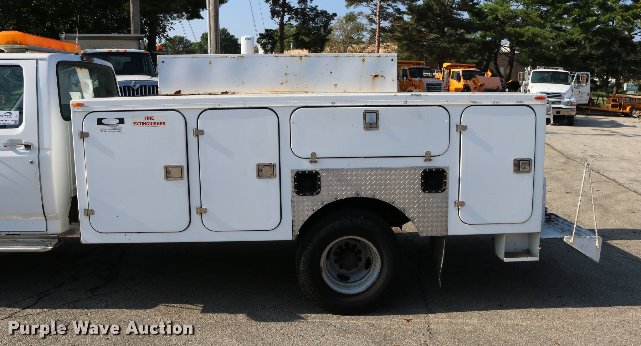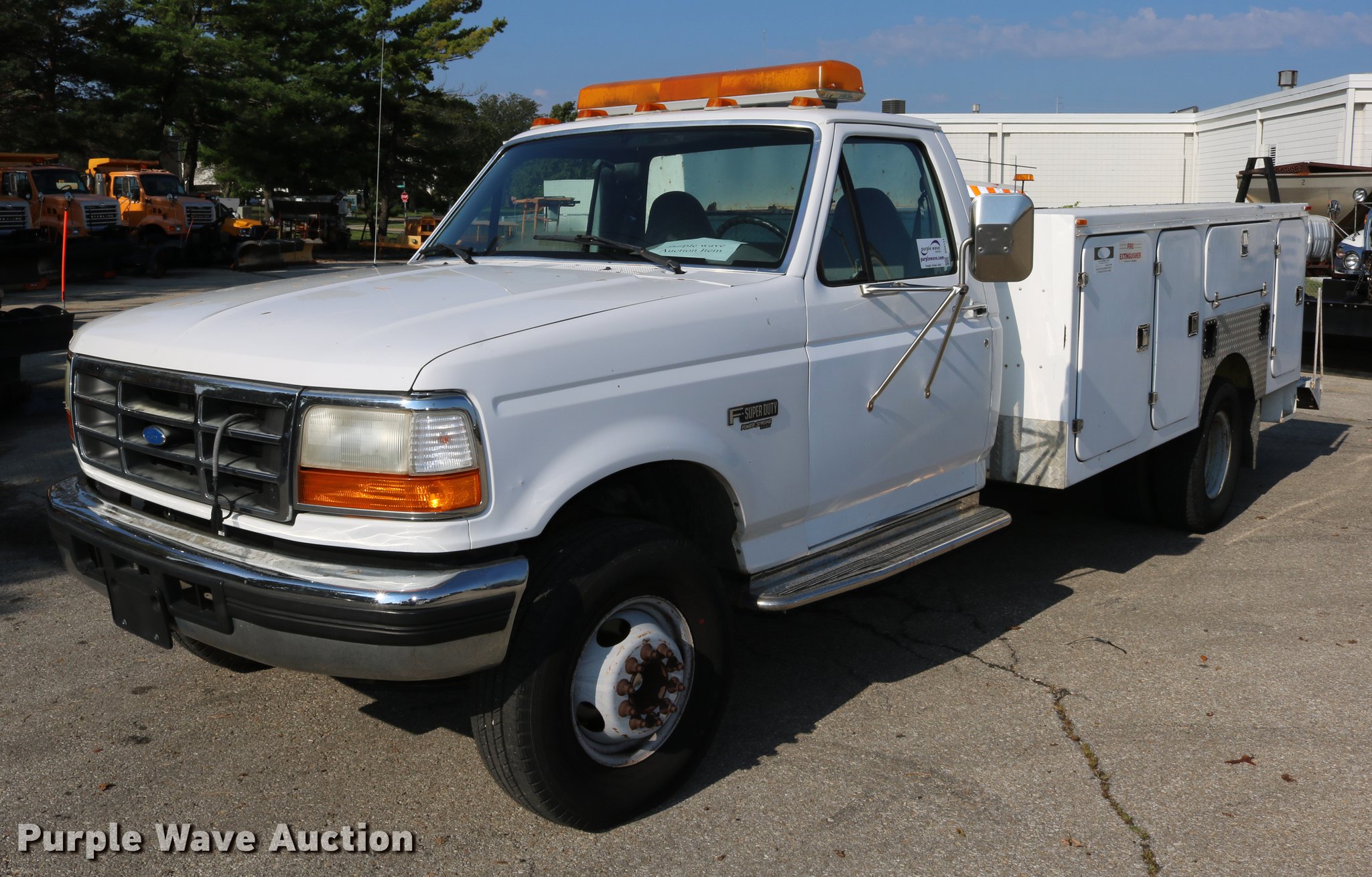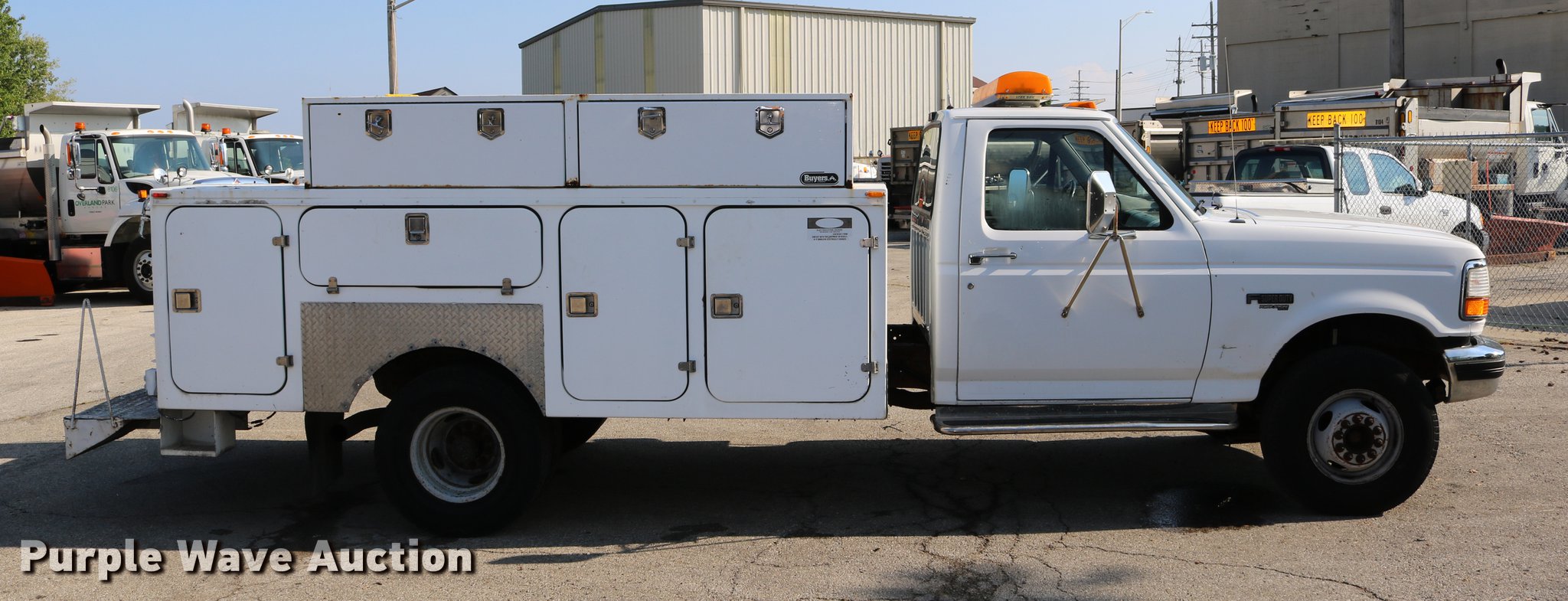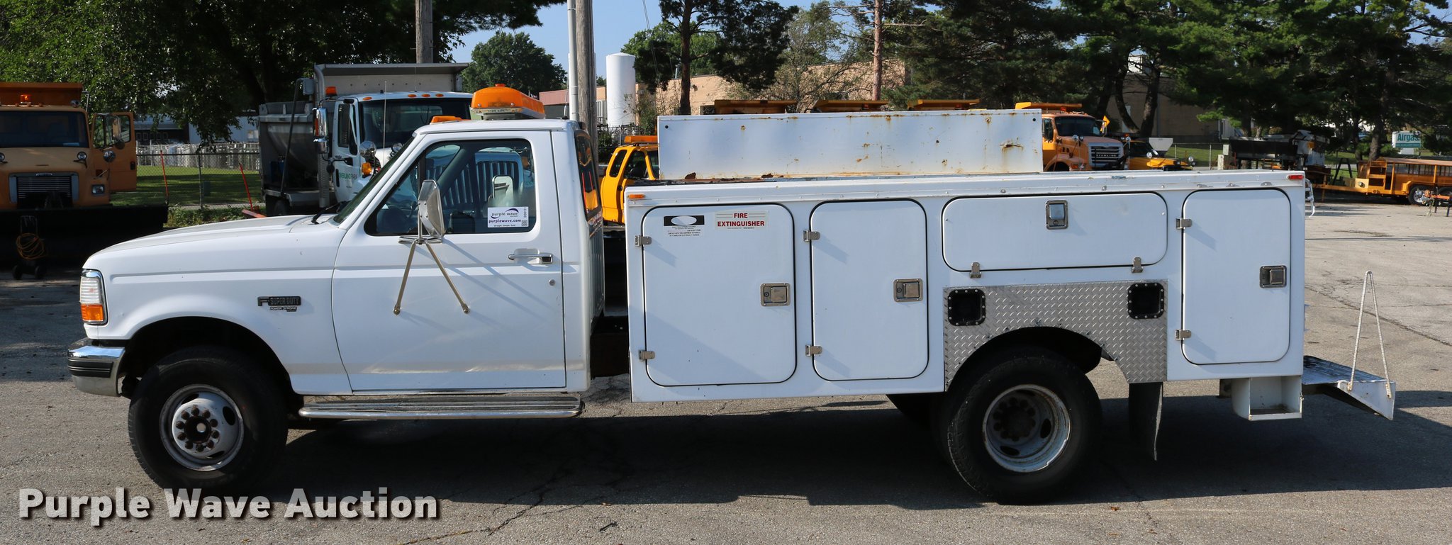 Purple Wave is selling a used Service Truck in Kansas. This item is a 1996 Ford F450 Super Duty utility truck with the following: 73,495 miles on odometer, 7.3L V8 OHV 16V turbo diesel engine, Automatic transmission, Single axle, AC and heat, AM/FM, Brake controller, Backup alarm, Light bar, Block heater, Fibre Body utility bed, Shelving, Slide-out drawers, Dual fuel tanks, Pintle hitch, Trailer wiring, Spring suspension, Hydraulic brakes, 161" wheelbase, 235/85R16 tires, GVWR 15,000 lbs, Unit# 8131