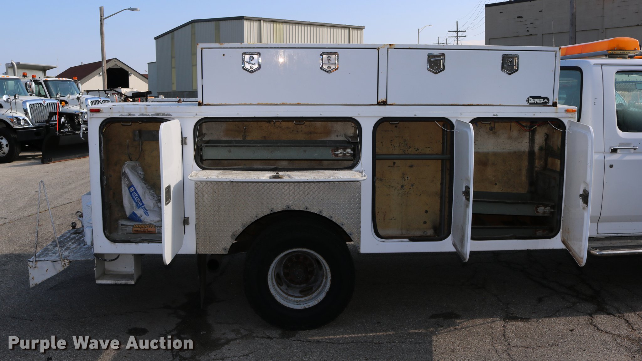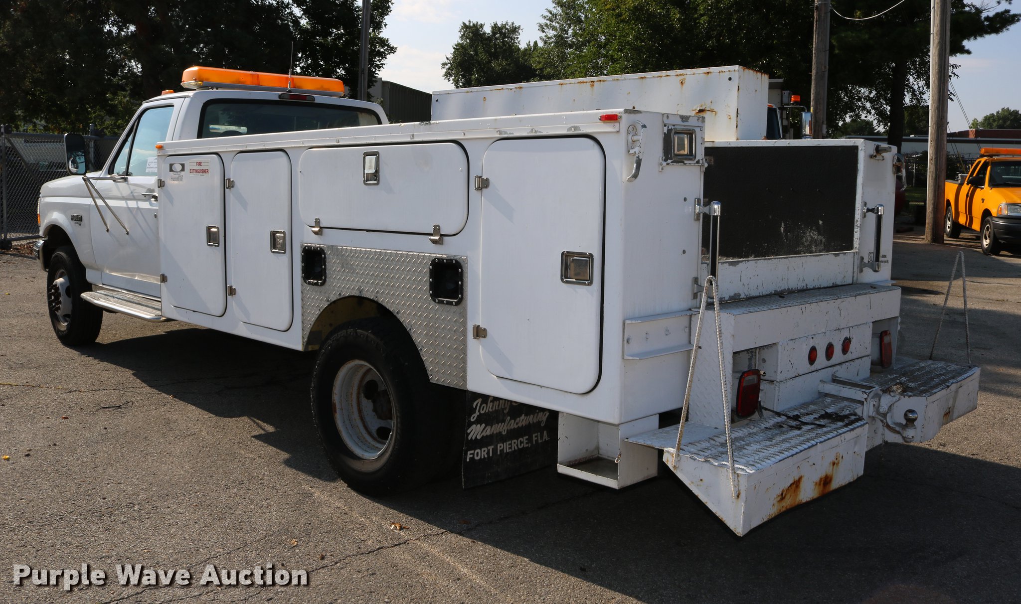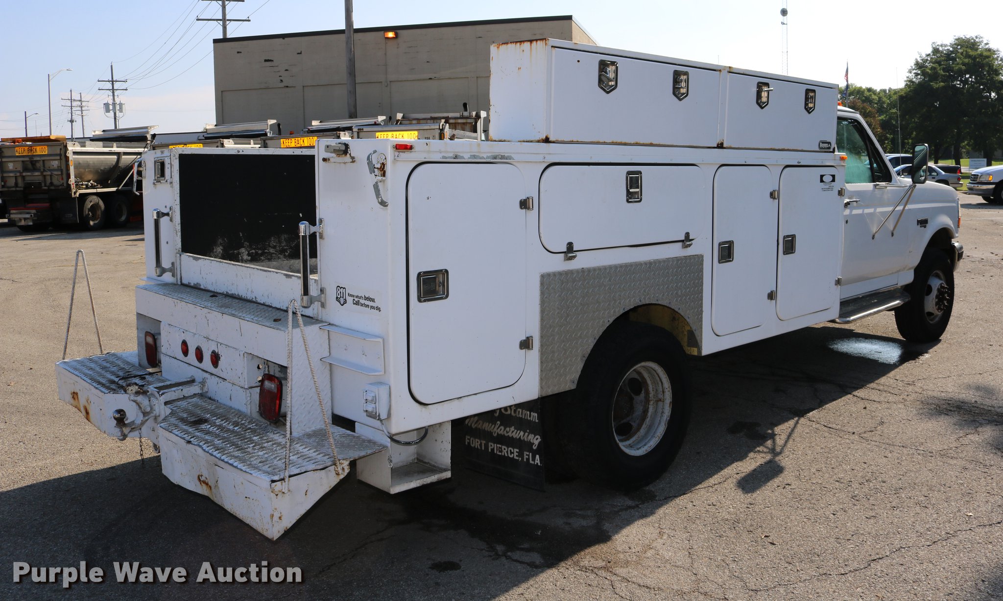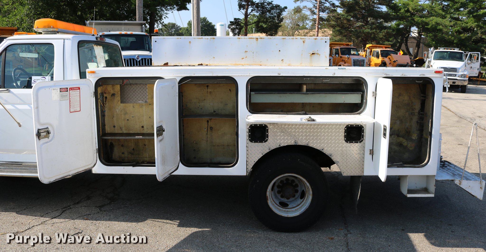 Purple Wave is selling a used Service Truck in Kansas. This item is a 1996 Ford F450 Super Duty utility truck with the following: 73,495 miles on odometer, 7.3L V8 OHV 16V turbo diesel engine, Automatic transmission, Single axle, AC and heat, AM/FM, Brake controller, Backup alarm, Light bar, Block heater, Fibre Body utility bed, Shelving, Slide-out drawers, Dual fuel tanks, Pintle hitch, Trailer wiring, Spring suspension, Hydraulic brakes, 161" wheelbase, 235/85R16 tires, GVWR 15,000 lbs, Unit# 8131