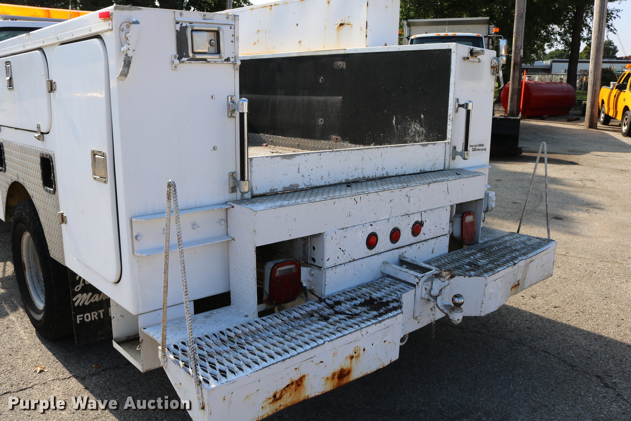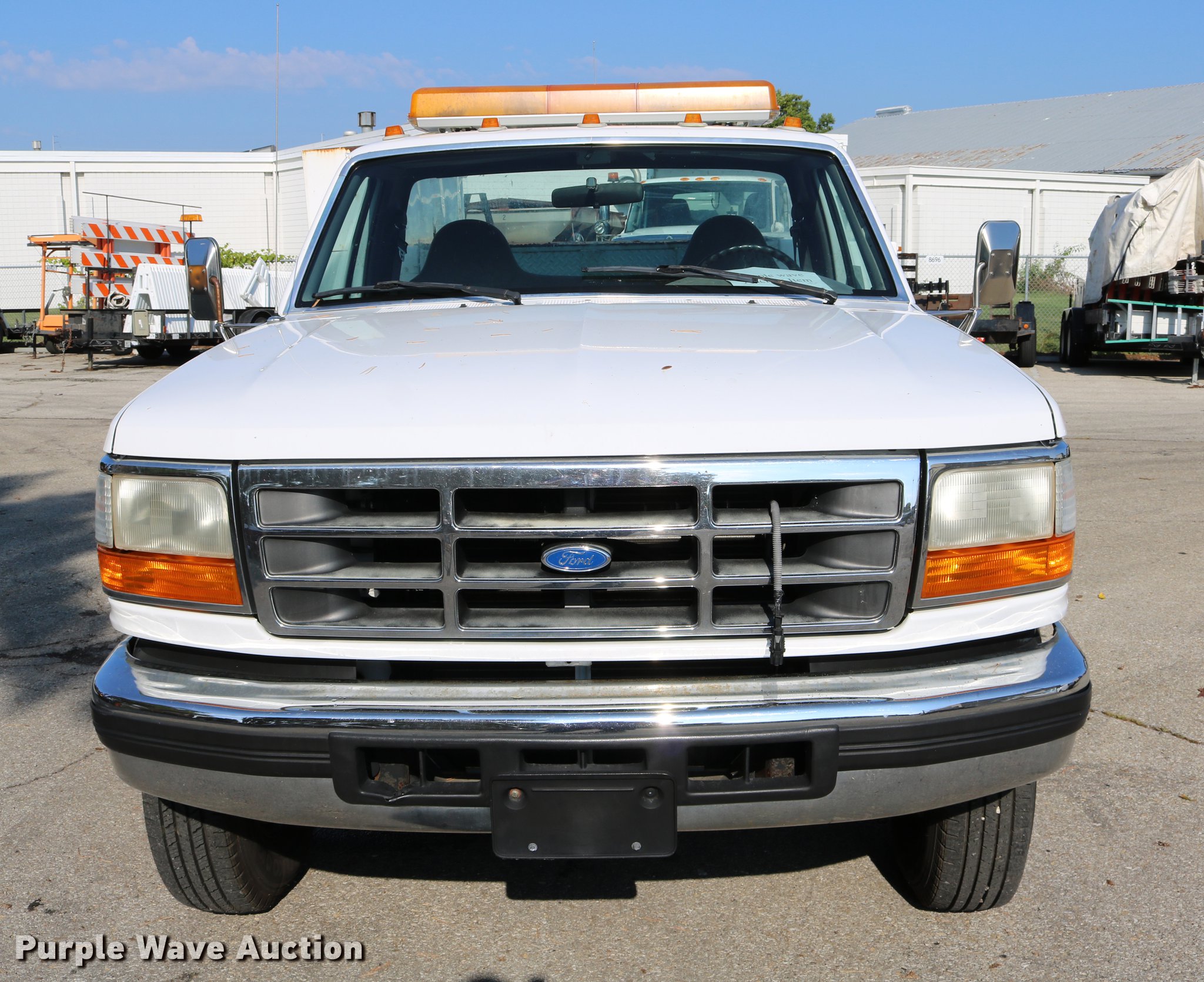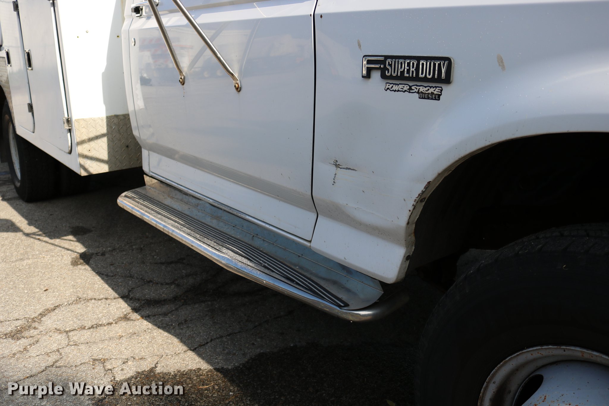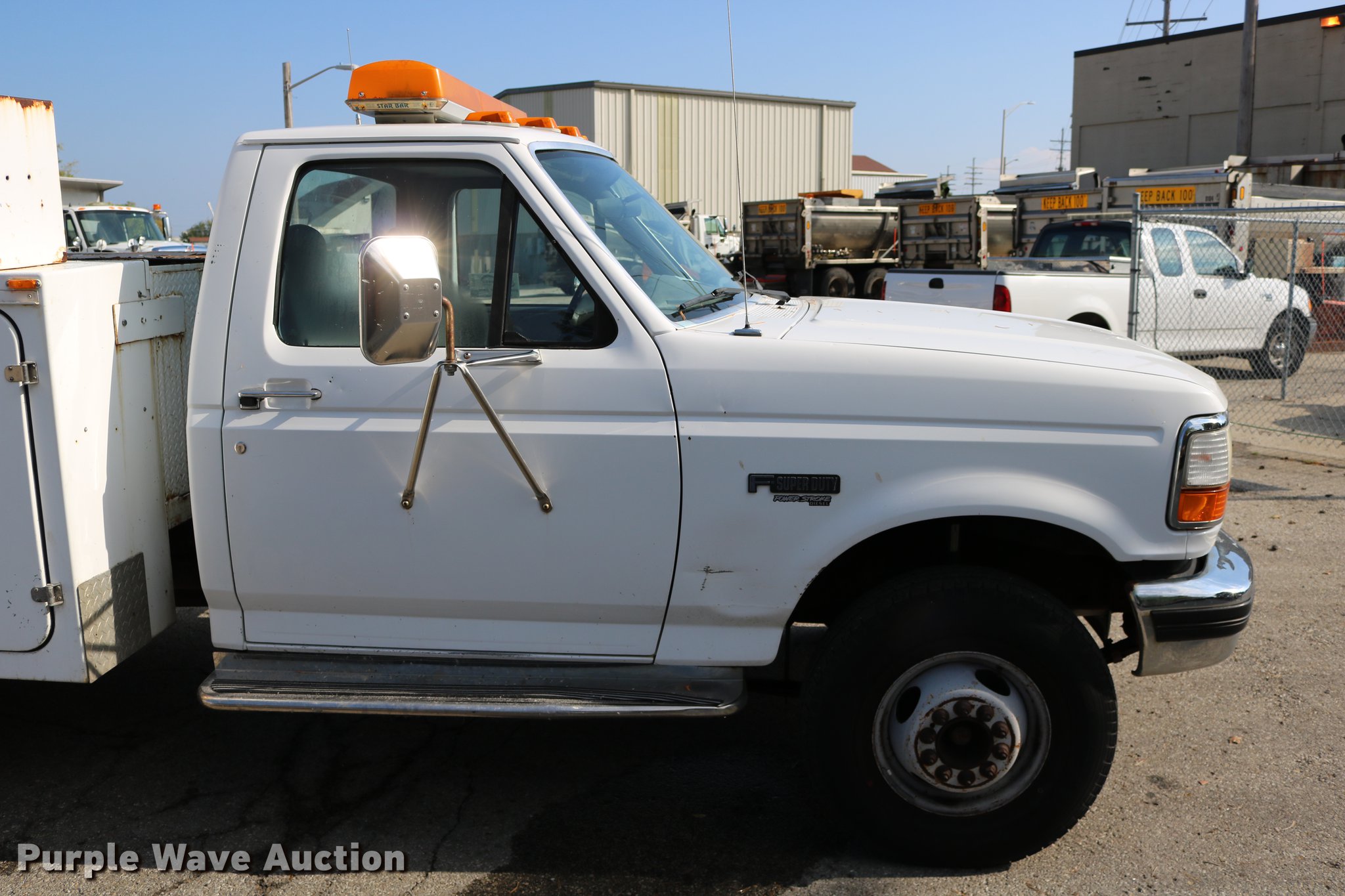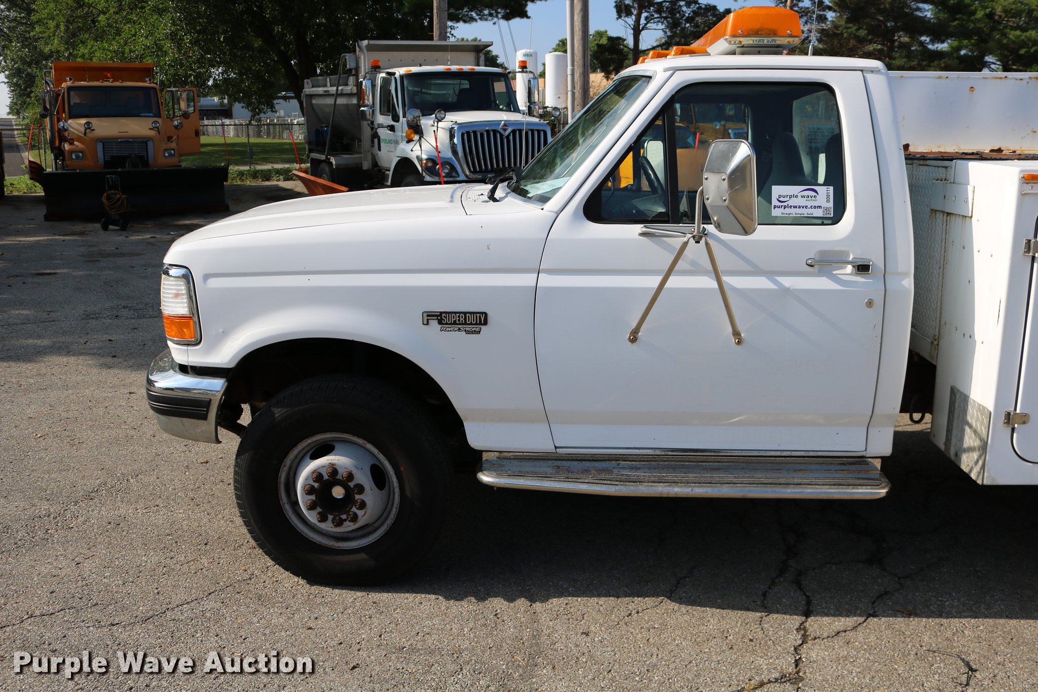 Purple Wave is selling a used Service Truck in Kansas. This item is a 1996 Ford F450 Super Duty utility truck with the following: 73,495 miles on odometer, 7.3L V8 OHV 16V turbo diesel engine, Automatic transmission, Single axle, AC and heat, AM/FM, Brake controller, Backup alarm, Light bar, Block heater, Fibre Body utility bed, Shelving, Slide-out drawers, Dual fuel tanks, Pintle hitch, Trailer wiring, Spring suspension, Hydraulic brakes, 161" wheelbase, 235/85R16 tires, GVWR 15,000 lbs, Unit# 8131