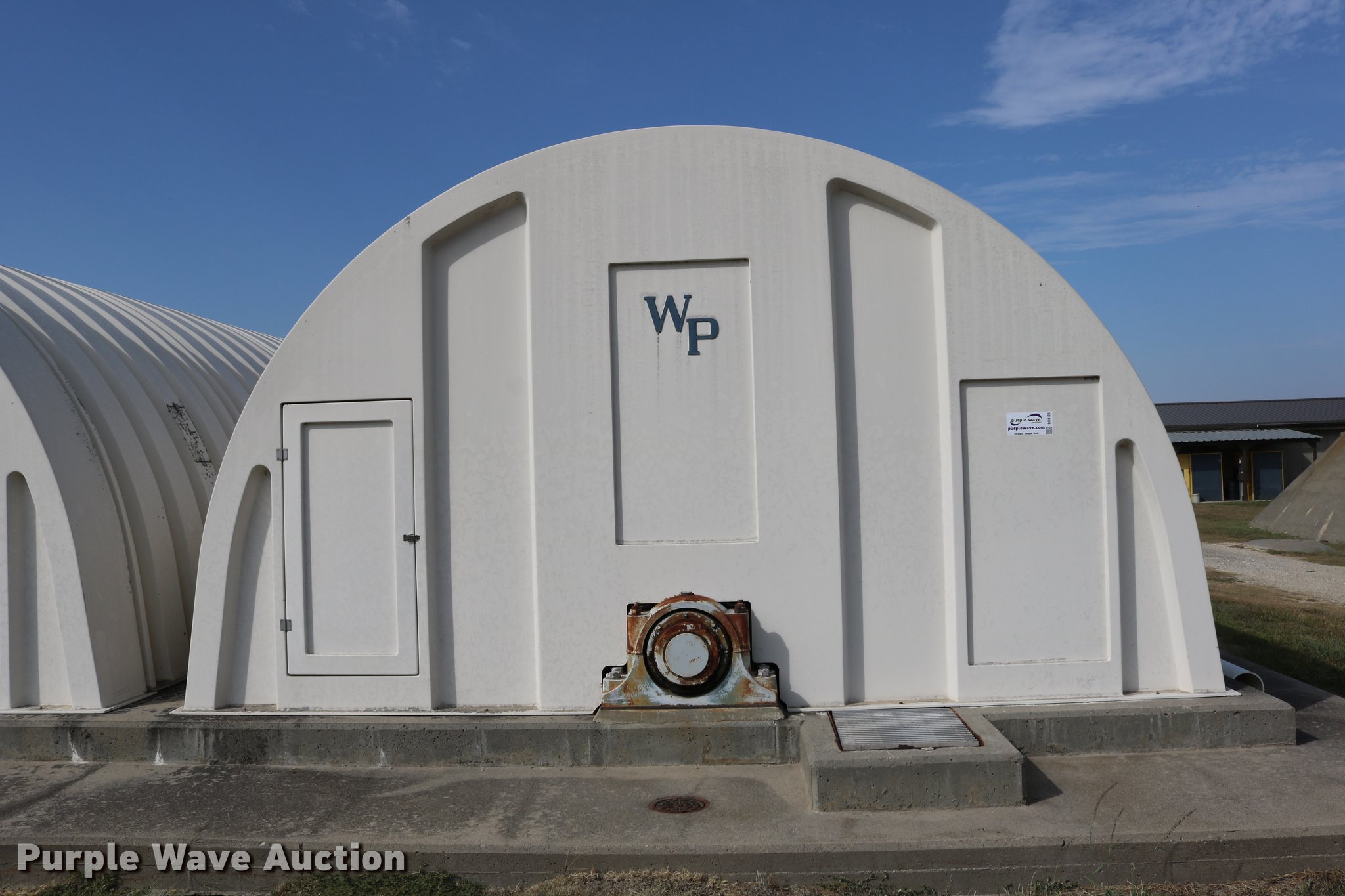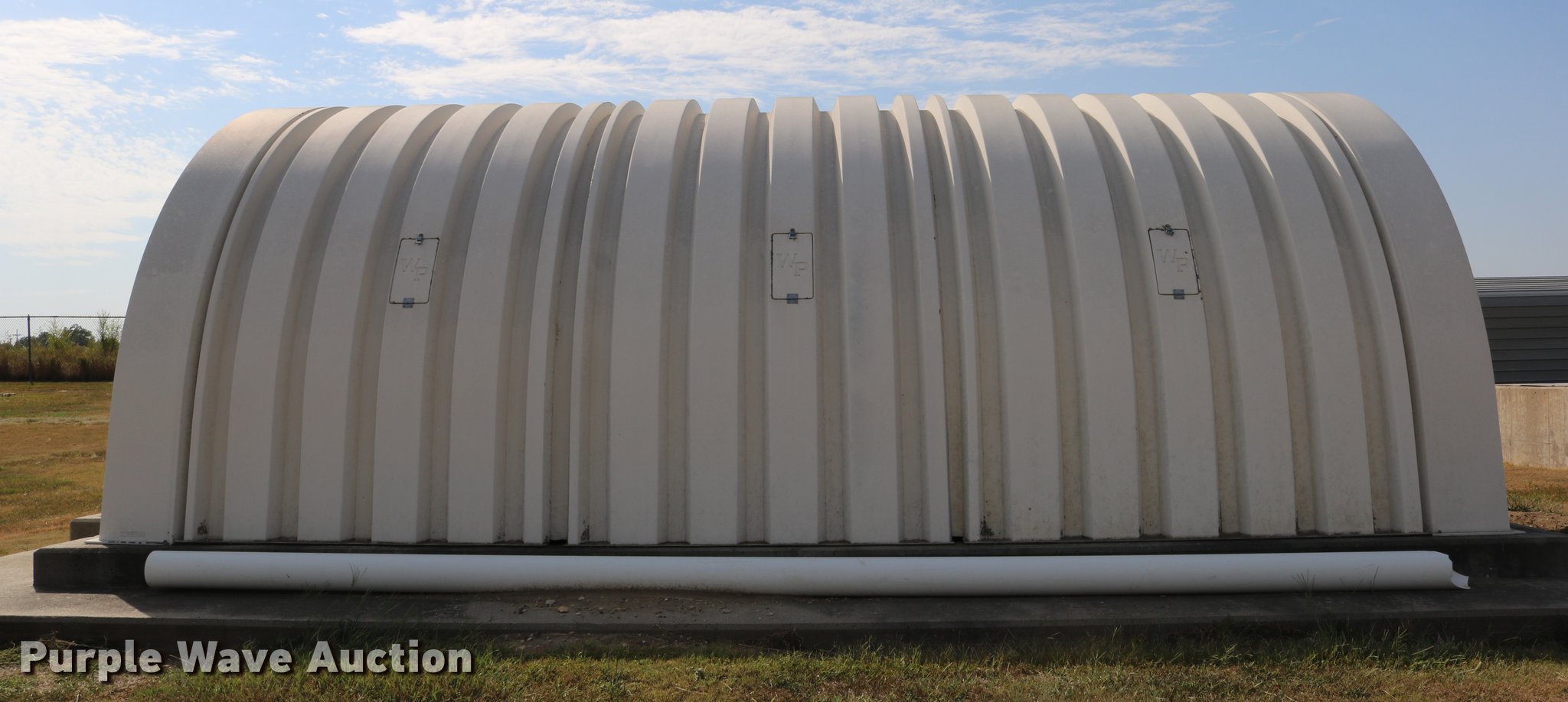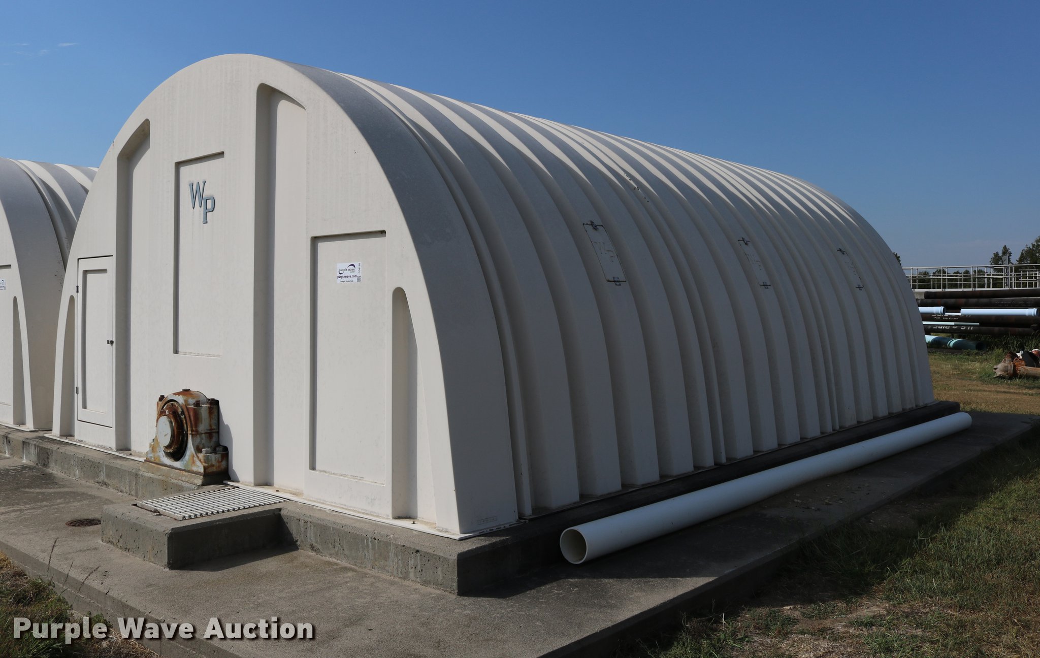 Purple Wave is selling a used Building Materials in Kansas. This item is a WP fiberglass structure with the following: 268"L x 184.5"W x 100"H, (2) 2' x 4' doors, (6) 15" x 7.5" side doors, Concrete not included