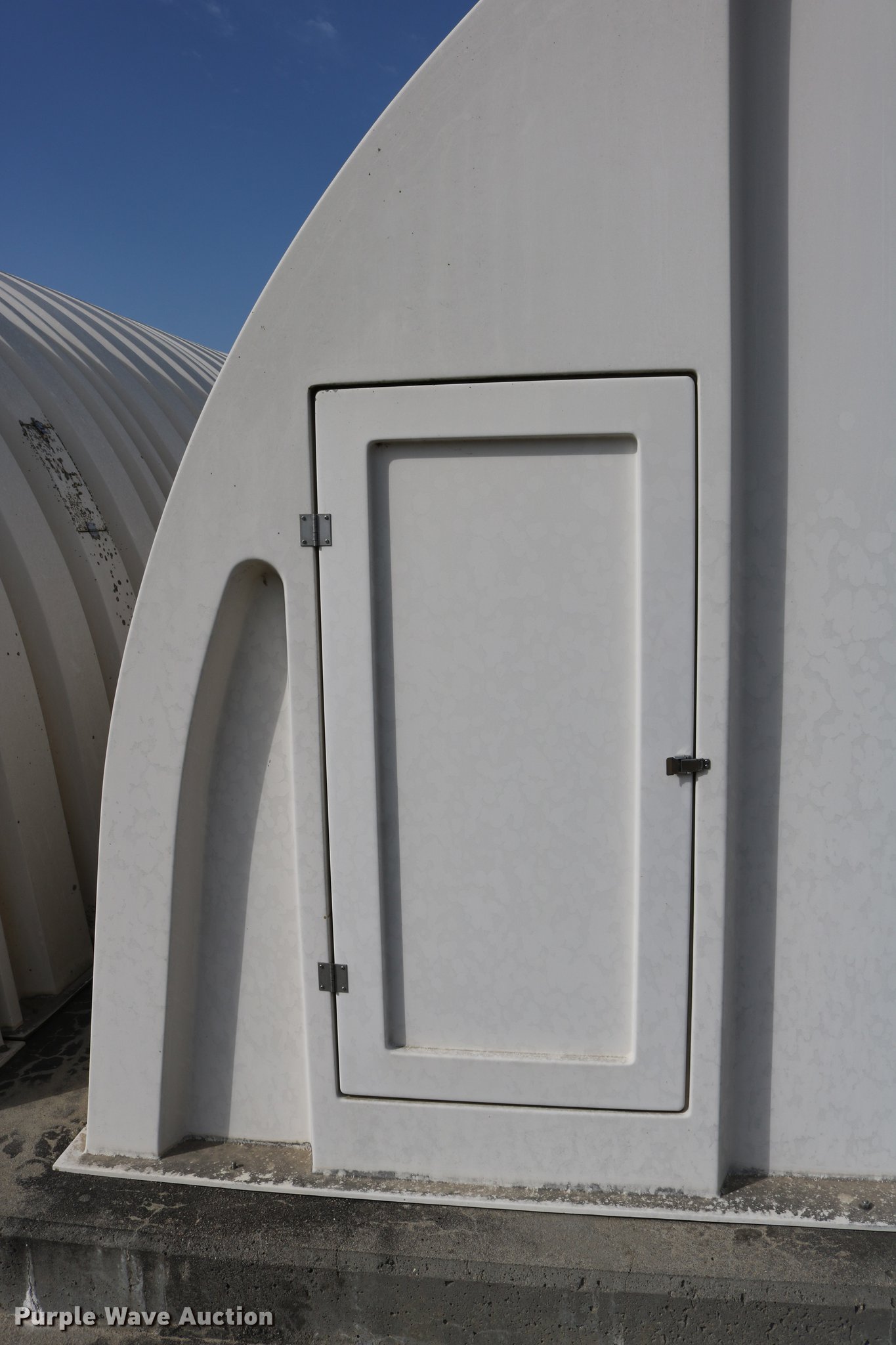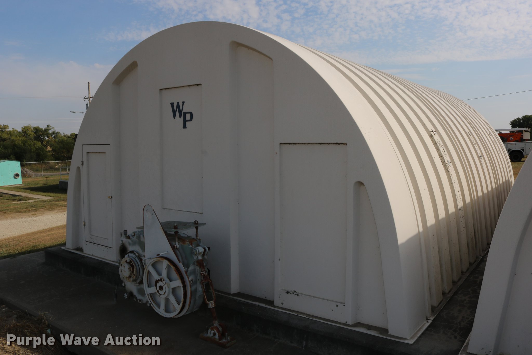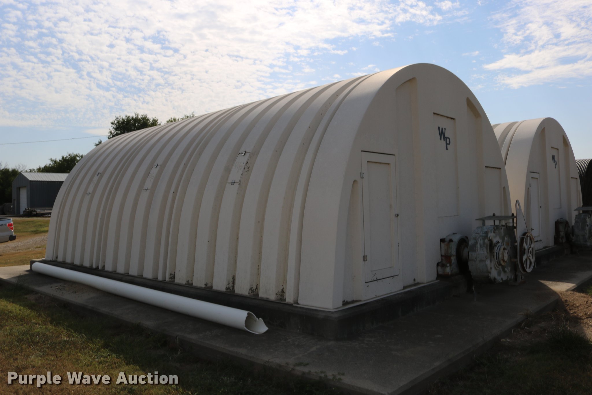 Purple Wave is selling a used Building Materials in Kansas. This item is a WP fiberglass structure with the following: 268"L x 184.5"W x 100"H, (2) 2' x 4' doors, (6) 15" x 7.5" side doors, Concrete not included