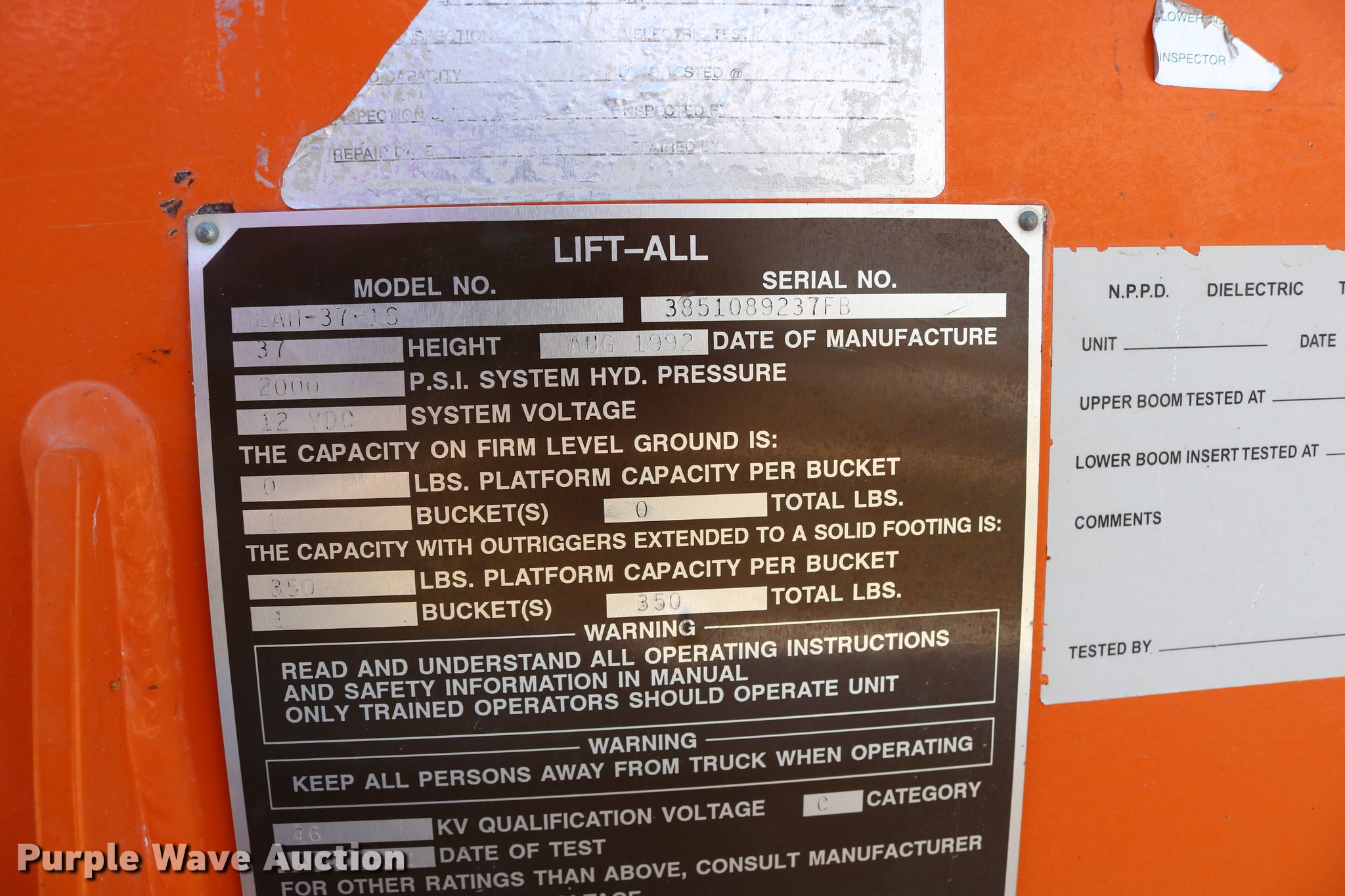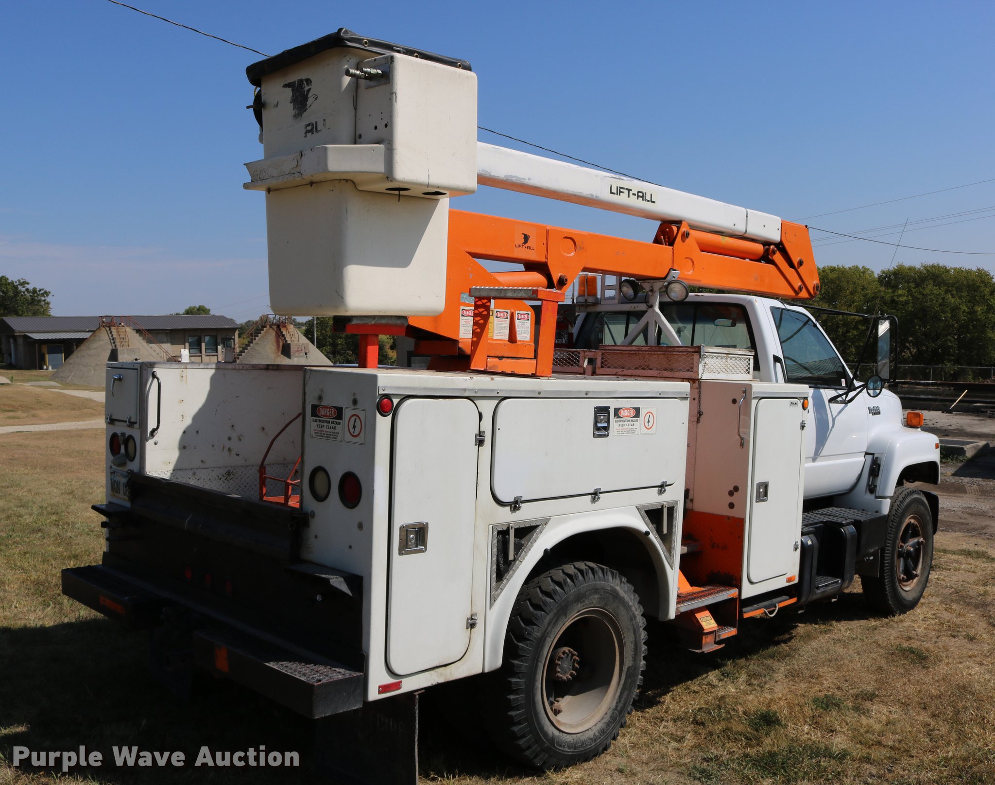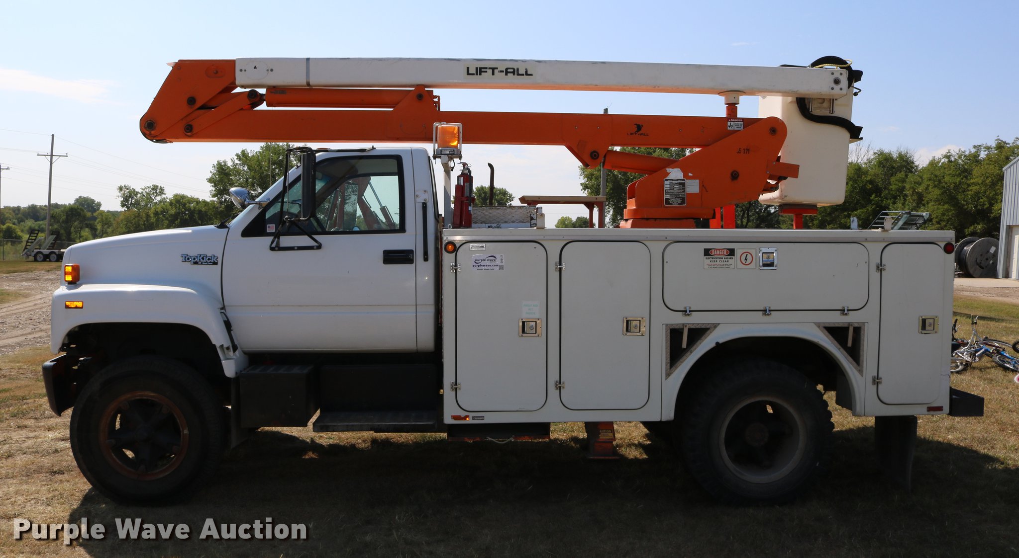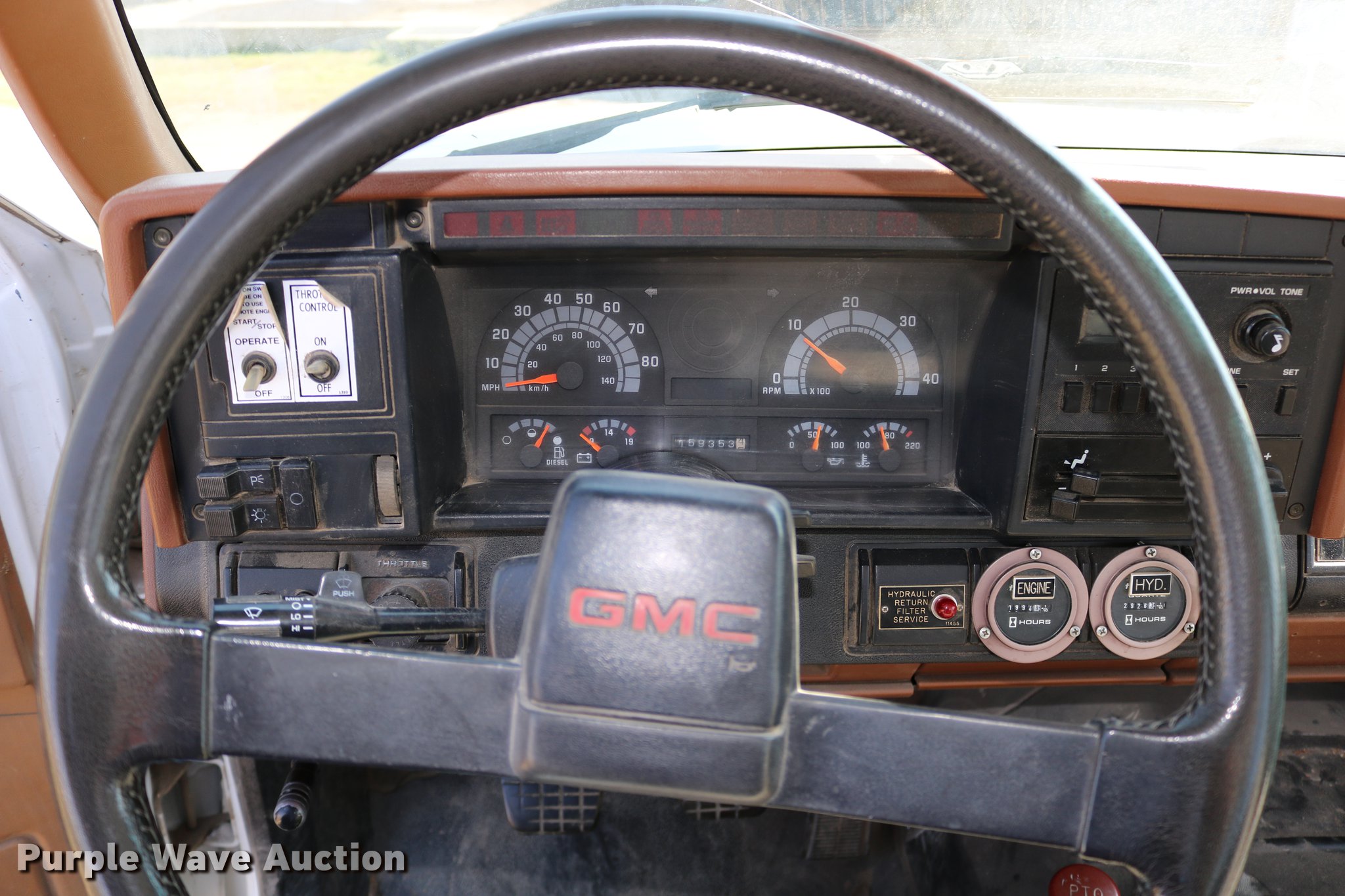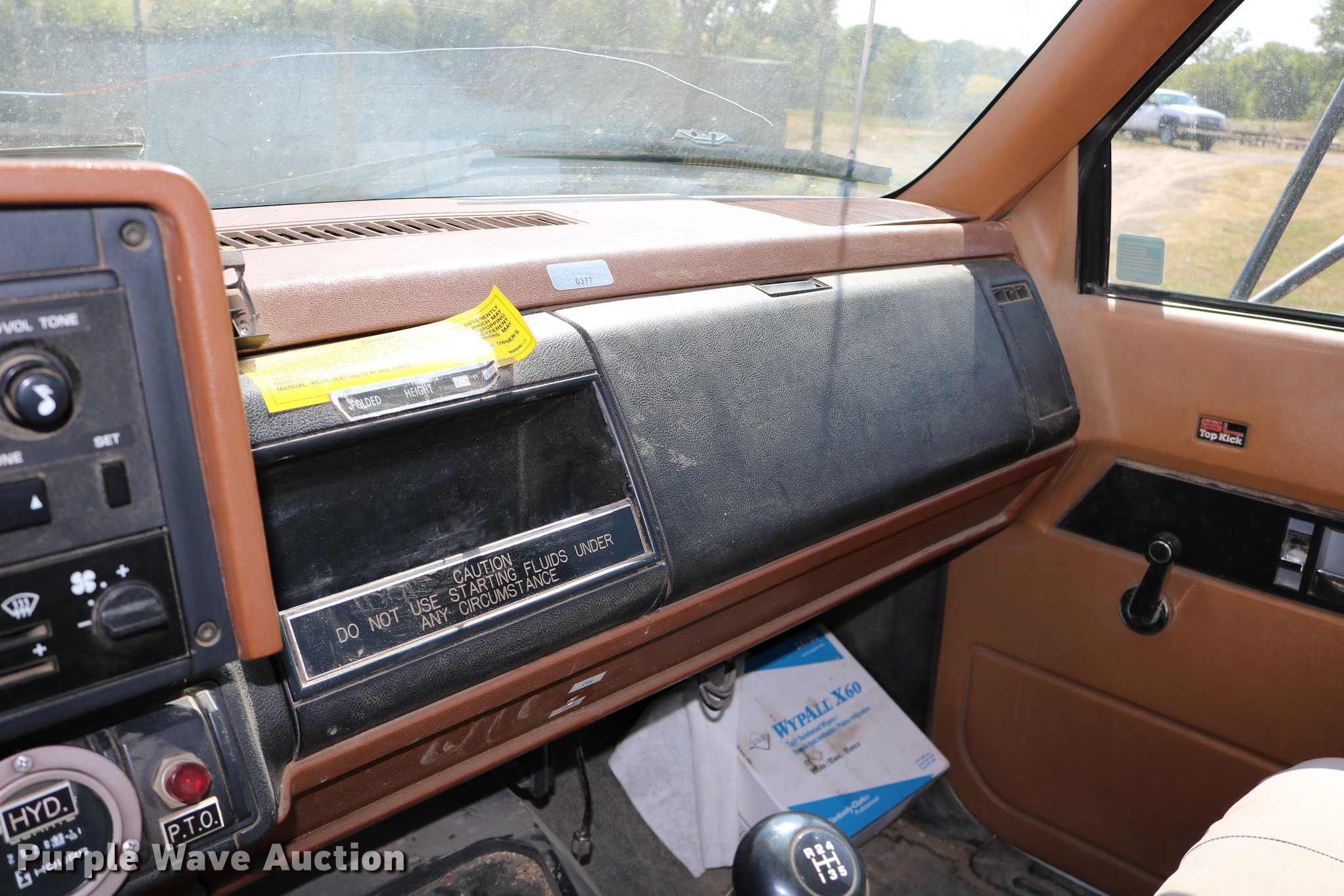 Purple Wave is selling a used Bucket Truck in Kansas. This item is a 1992 GMC TopKick bucket truck with the following: 159,354 miles on odometer, 1,995 engine hours on meter, 2,927 hydraulic hours on meter, Caterpillar 3116 6.6L L6 turbo diesel engine, Five speed manual transmission, Two speed rear end, Heat, AM, Front tow hooks, Beacon light, PTO, Fibre Body Ind. service bed, 11'L, Shelving, Work lights, Serial 4712, Lift-all LAH-37-15 boom, 37' boom length, 350 lbs max lift capacity, Man basket, 43' max lift height, Ground and platform controls, Boom rotation, Insulated boom, (2) hydraulic remotes in basket, (2) outriggers, Serial 3851089237FB, Single fuel tank, Pintle hitch, Receiver hitch, Trailer wiring, Spring suspension, Hydraulic brakes, Approx. 155" wheelbase, Dynatrac 9.00-20 tires, GVWR 27,080 lbs, Cracked windshield, Fire extinguisher not included