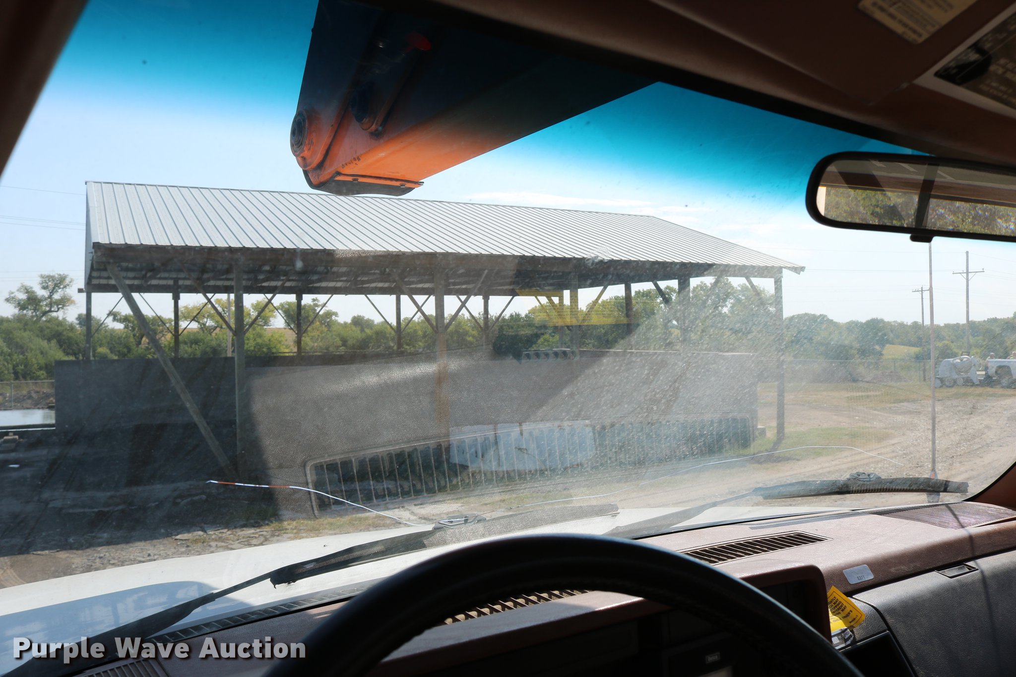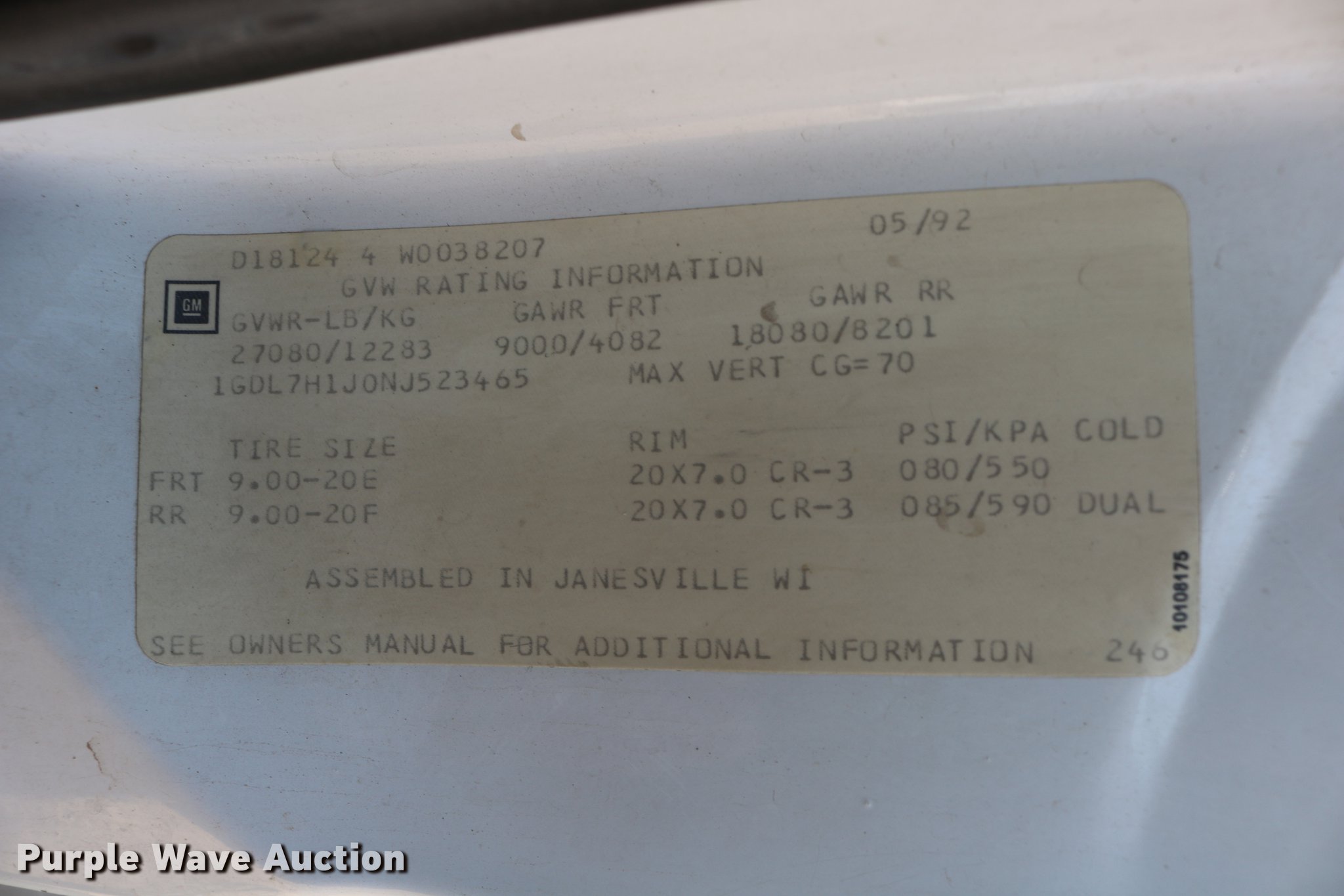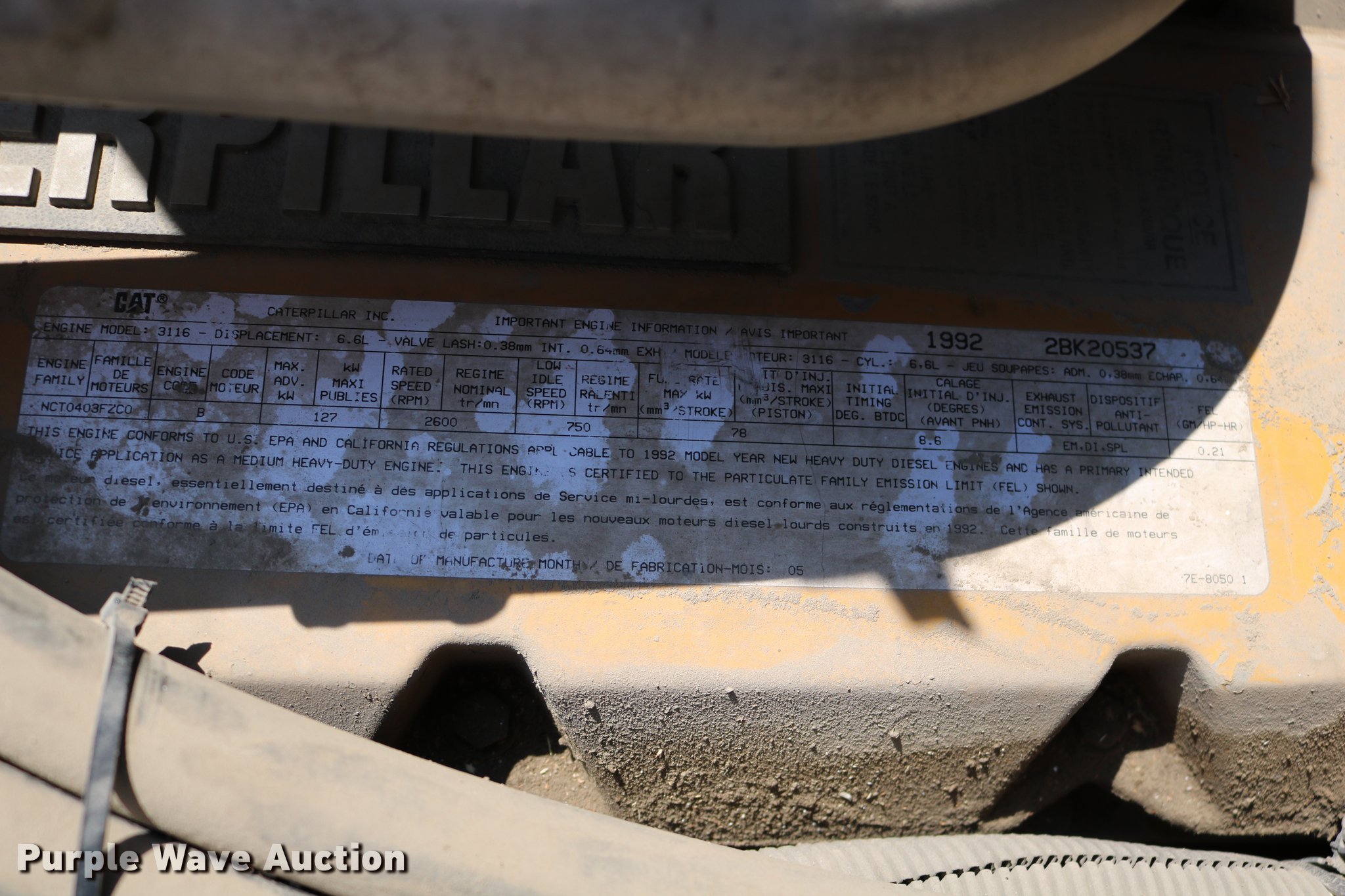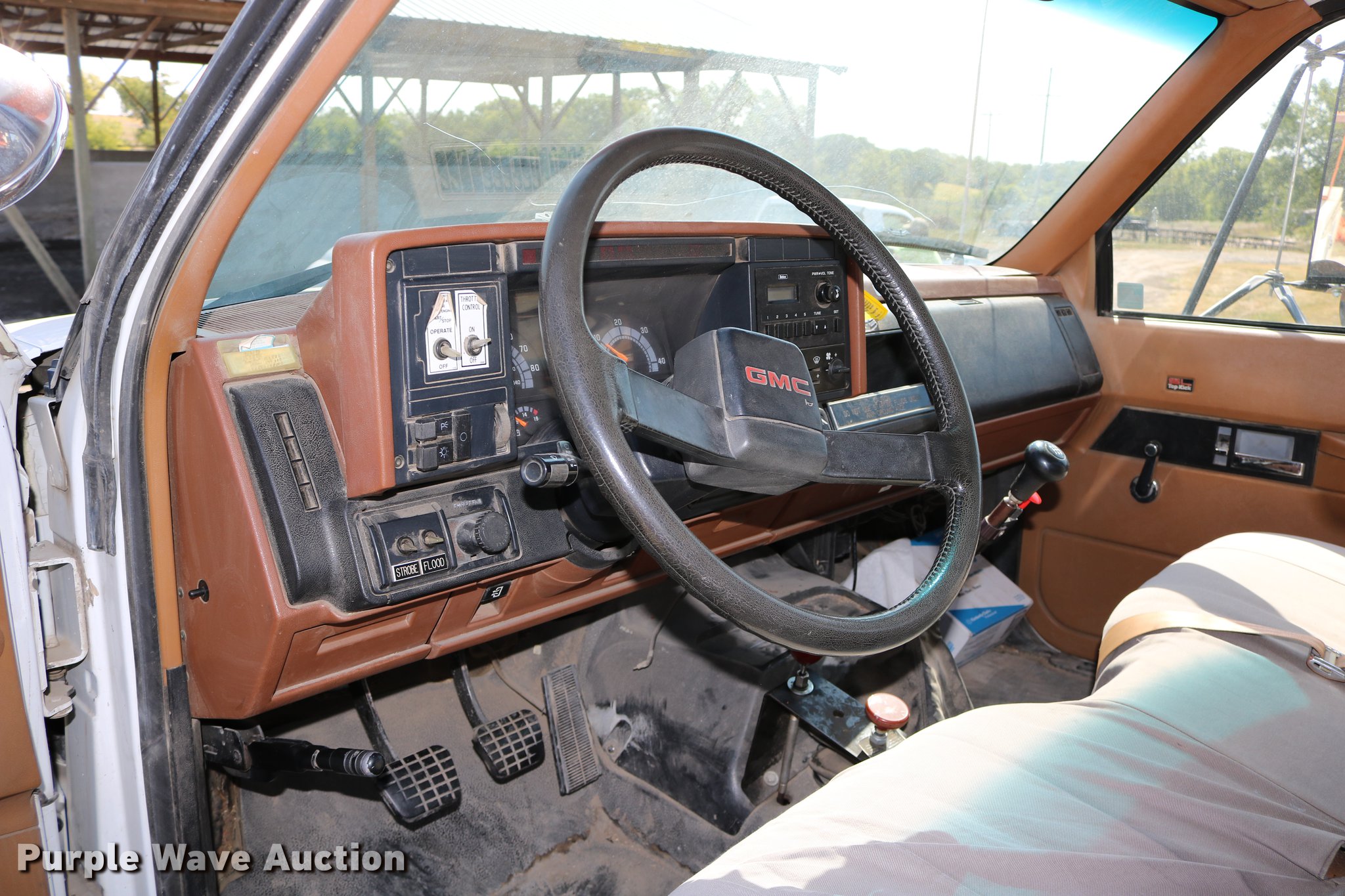 Purple Wave is selling a used Bucket Truck in Kansas. This item is a 1992 GMC TopKick bucket truck with the following: 159,354 miles on odometer, 1,995 engine hours on meter, 2,927 hydraulic hours on meter, Caterpillar 3116 6.6L L6 turbo diesel engine, Five speed manual transmission, Two speed rear end, Heat, AM, Front tow hooks, Beacon light, PTO, Fibre Body Ind. service bed, 11'L, Shelving, Work lights, Serial 4712, Lift-all LAH-37-15 boom, 37' boom length, 350 lbs max lift capacity, Man basket, 43' max lift height, Ground and platform controls, Boom rotation, Insulated boom, (2) hydraulic remotes in basket, (2) outriggers, Serial 3851089237FB, Single fuel tank, Pintle hitch, Receiver hitch, Trailer wiring, Spring suspension, Hydraulic brakes, Approx. 155" wheelbase, Dynatrac 9.00-20 tires, GVWR 27,080 lbs, Cracked windshield, Fire extinguisher not included