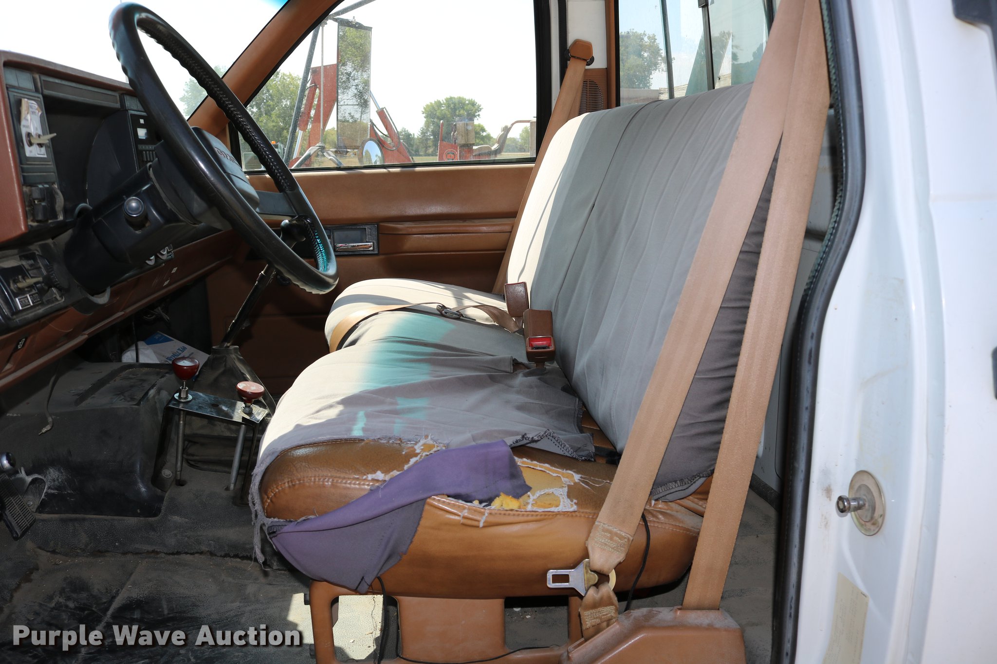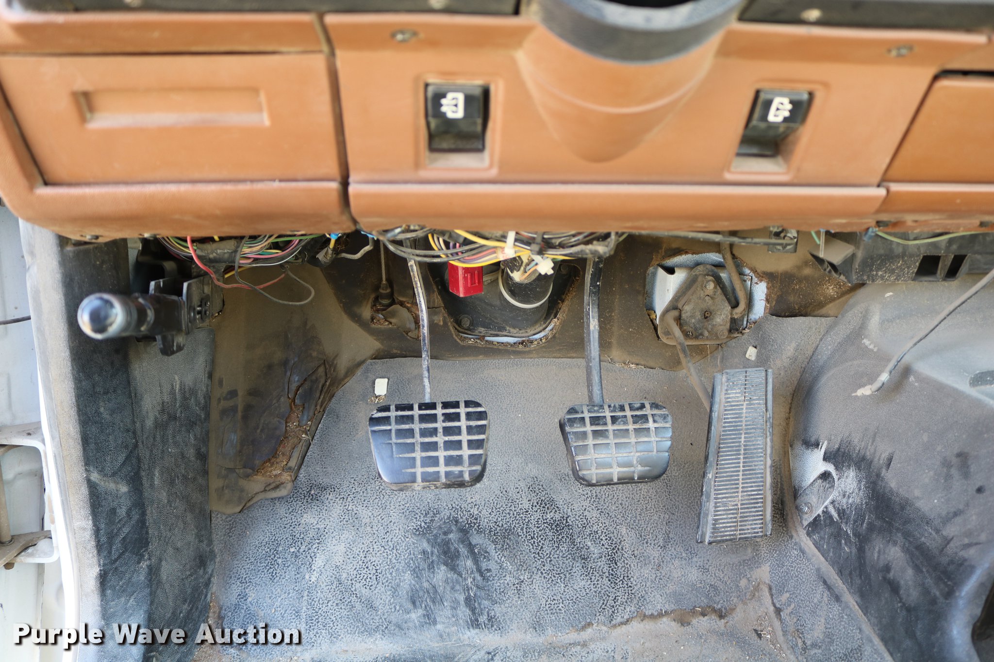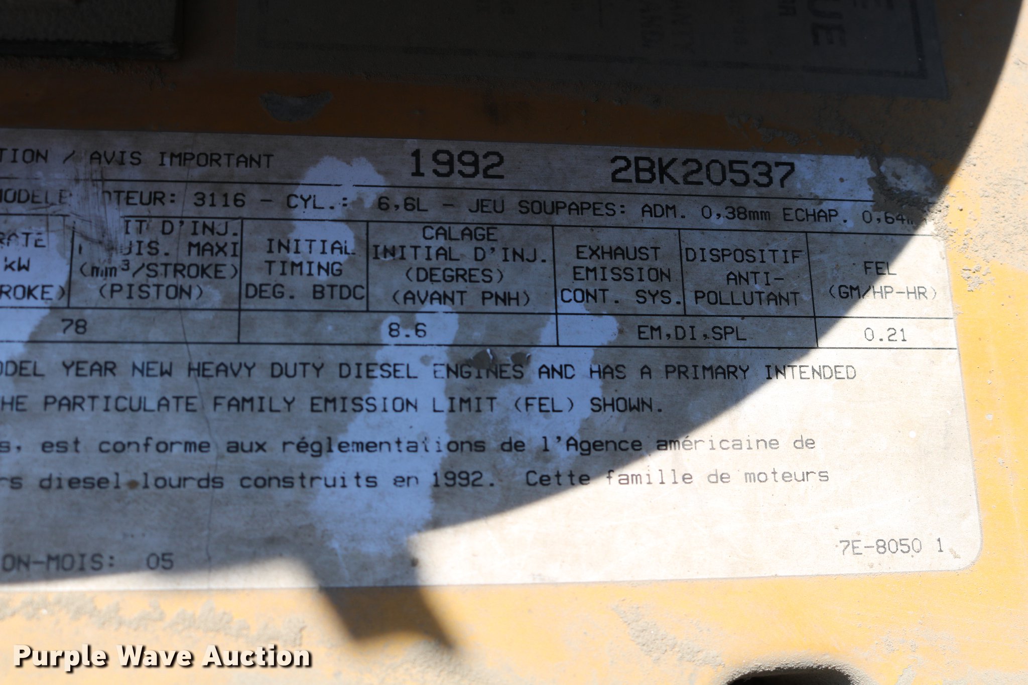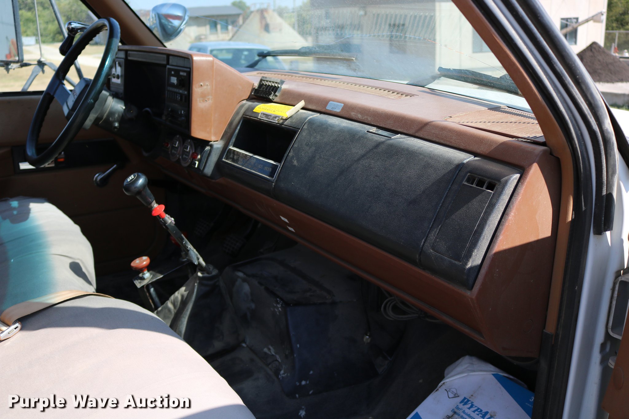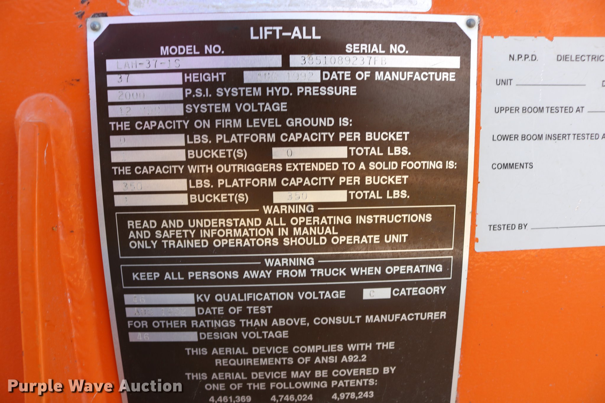 Purple Wave is selling a used Bucket Truck in Kansas. This item is a 1992 GMC TopKick bucket truck with the following: 159,354 miles on odometer, 1,995 engine hours on meter, 2,927 hydraulic hours on meter, Caterpillar 3116 6.6L L6 turbo diesel engine, Five speed manual transmission, Two speed rear end, Heat, AM, Front tow hooks, Beacon light, PTO, Fibre Body Ind. service bed, 11'L, Shelving, Work lights, Serial 4712, Lift-all LAH-37-15 boom, 37' boom length, 350 lbs max lift capacity, Man basket, 43' max lift height, Ground and platform controls, Boom rotation, Insulated boom, (2) hydraulic remotes in basket, (2) outriggers, Serial 3851089237FB, Single fuel tank, Pintle hitch, Receiver hitch, Trailer wiring, Spring suspension, Hydraulic brakes, Approx. 155" wheelbase, Dynatrac 9.00-20 tires, GVWR 27,080 lbs, Cracked windshield, Fire extinguisher not included