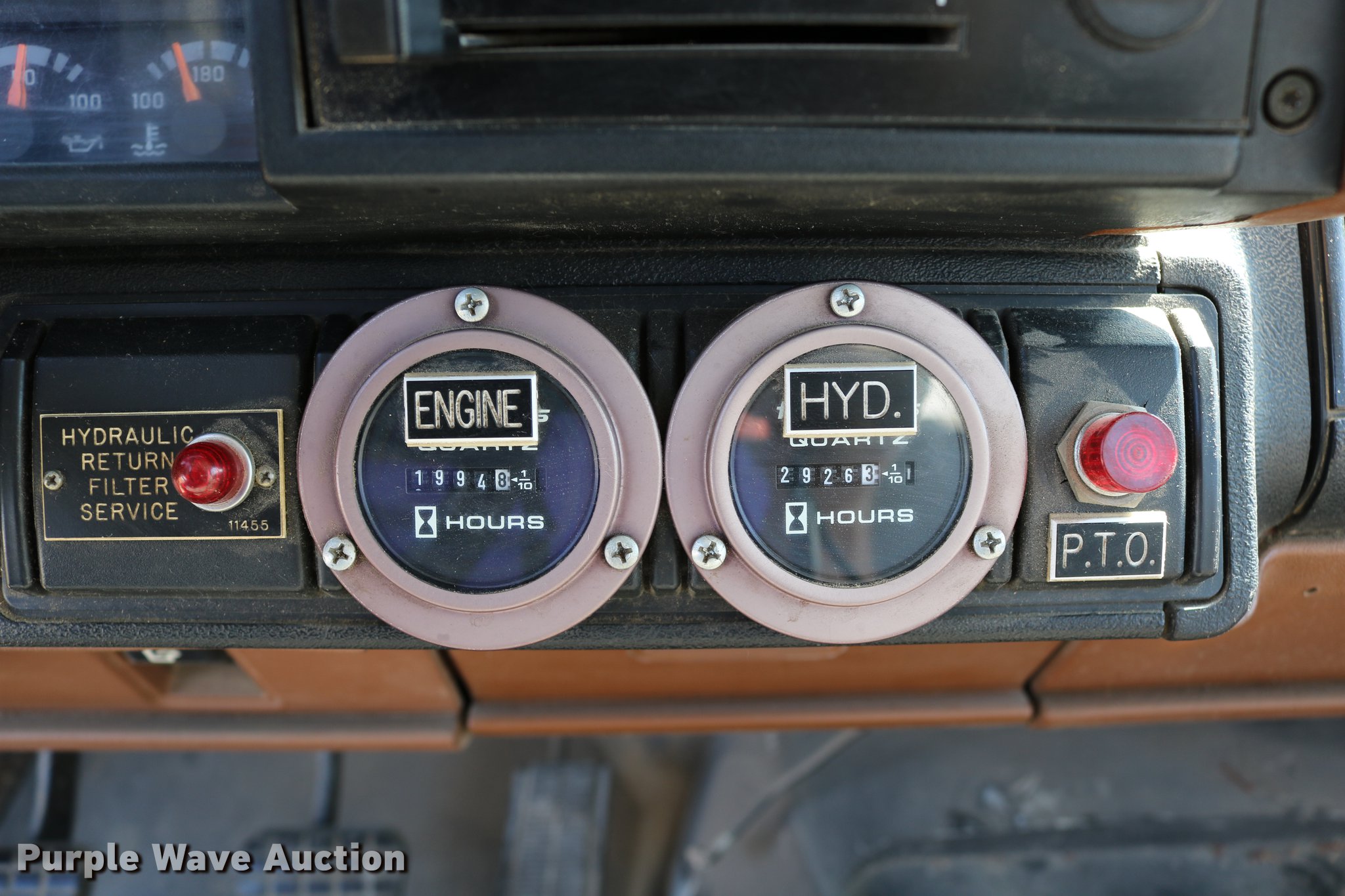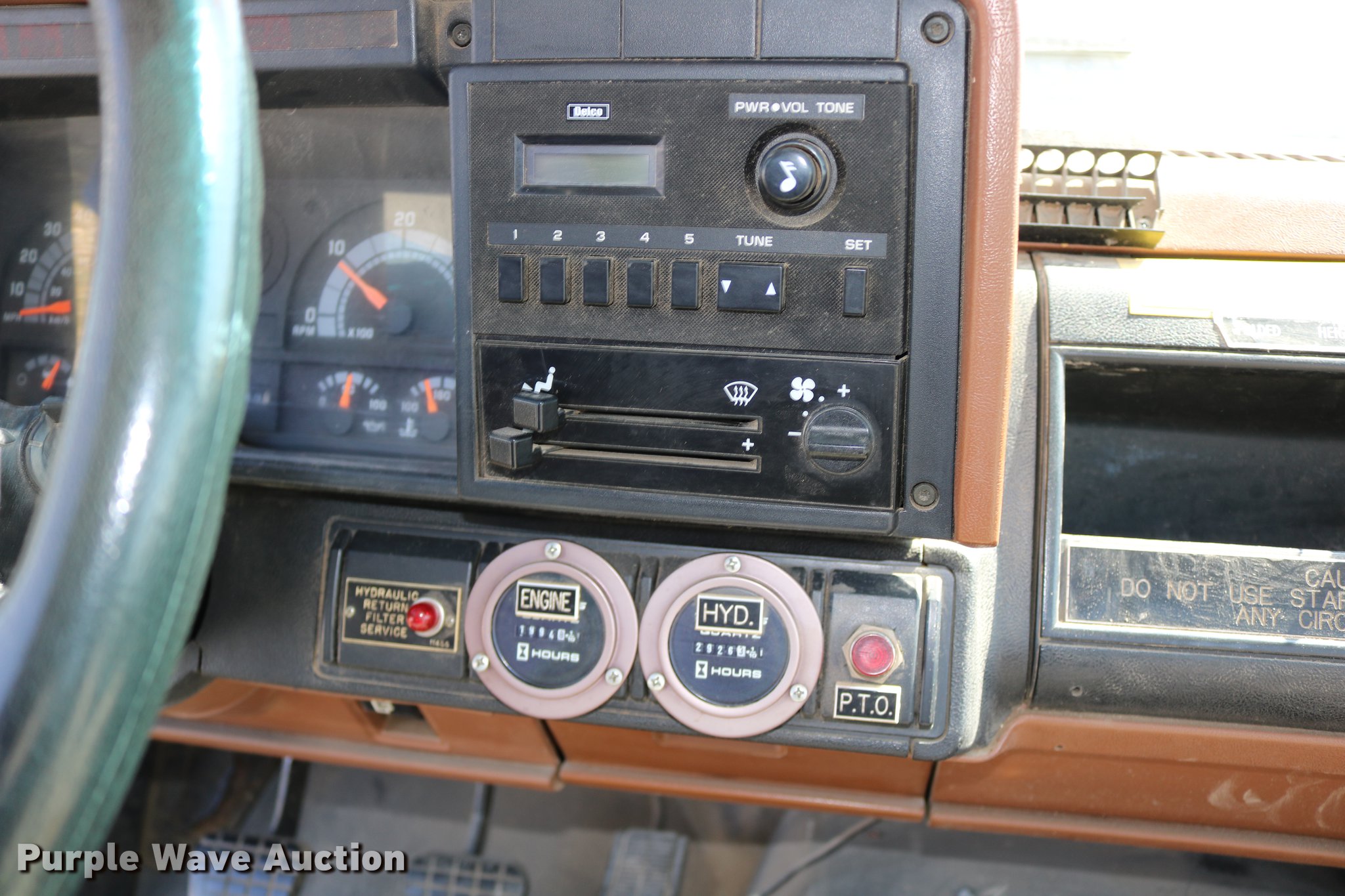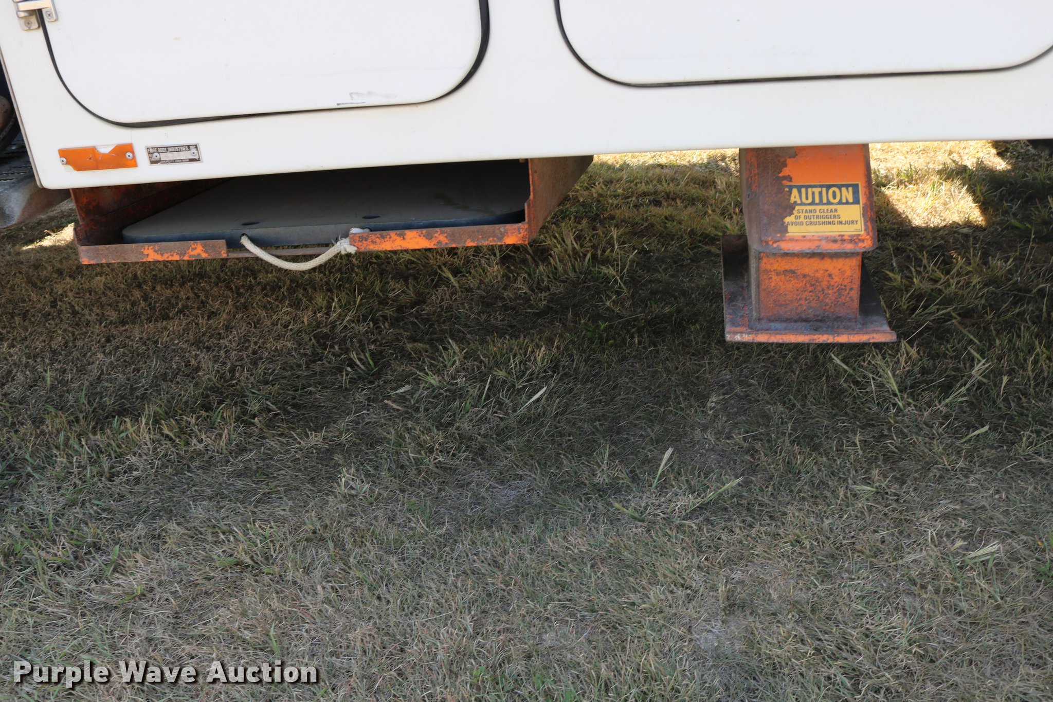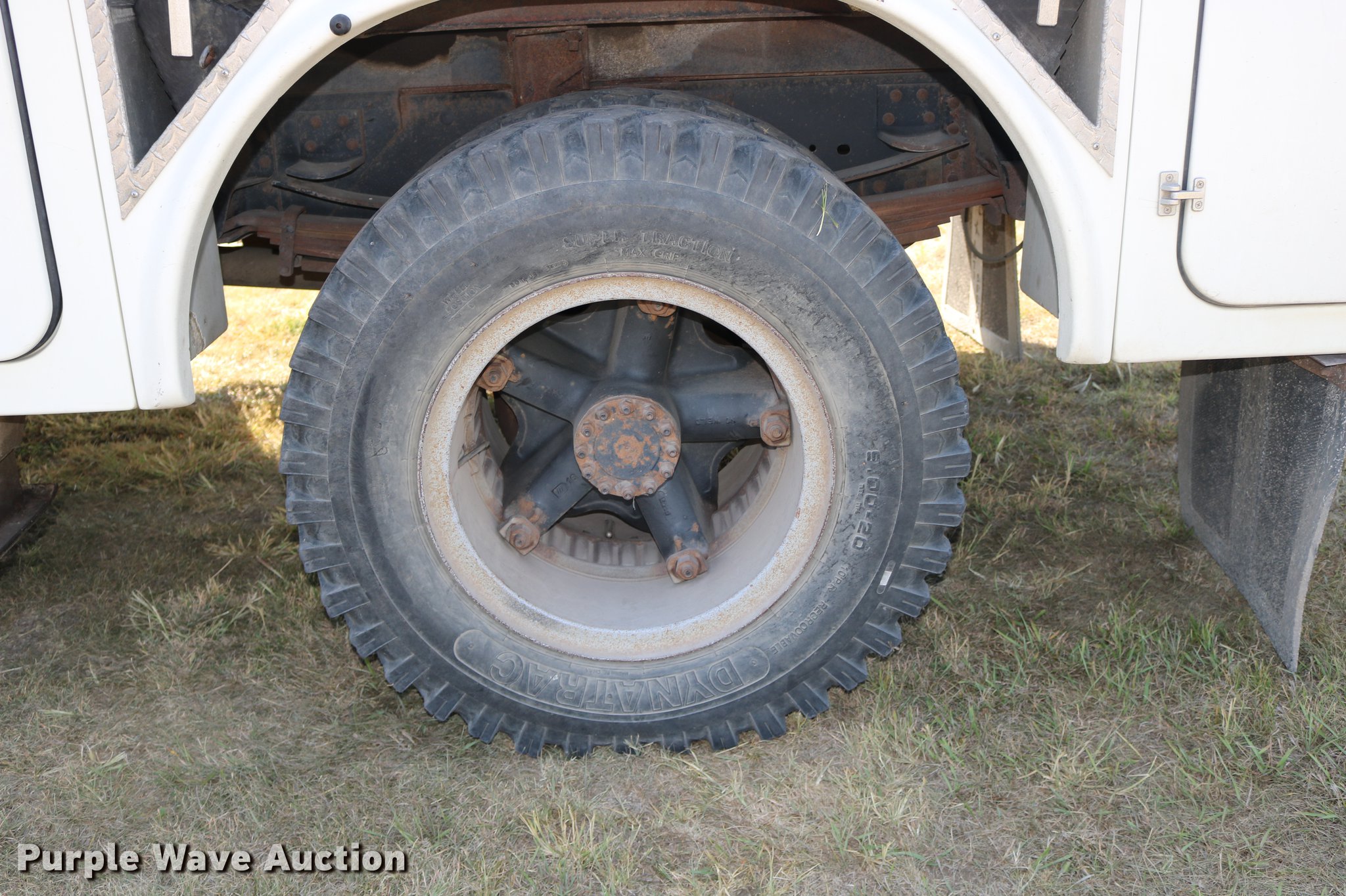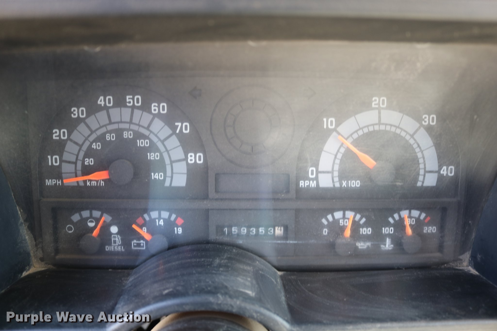 Purple Wave is selling a used Bucket Truck in Kansas. This item is a 1992 GMC TopKick bucket truck with the following: 159,354 miles on odometer, 1,995 engine hours on meter, 2,927 hydraulic hours on meter, Caterpillar 3116 6.6L L6 turbo diesel engine, Five speed manual transmission, Two speed rear end, Heat, AM, Front tow hooks, Beacon light, PTO, Fibre Body Ind. service bed, 11'L, Shelving, Work lights, Serial 4712, Lift-all LAH-37-15 boom, 37' boom length, 350 lbs max lift capacity, Man basket, 43' max lift height, Ground and platform controls, Boom rotation, Insulated boom, (2) hydraulic remotes in basket, (2) outriggers, Serial 3851089237FB, Single fuel tank, Pintle hitch, Receiver hitch, Trailer wiring, Spring suspension, Hydraulic brakes, Approx. 155" wheelbase, Dynatrac 9.00-20 tires, GVWR 27,080 lbs, Cracked windshield, Fire extinguisher not included