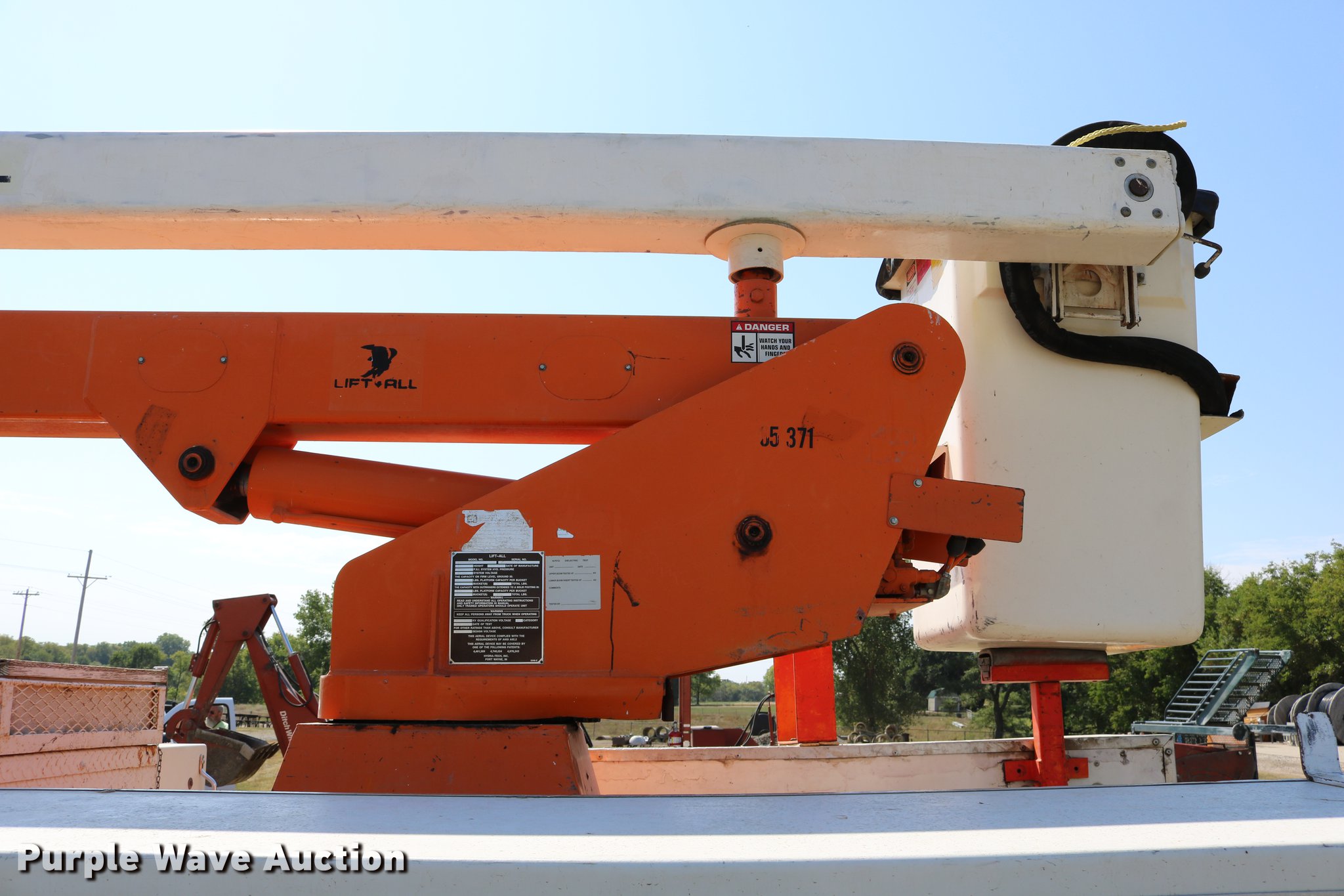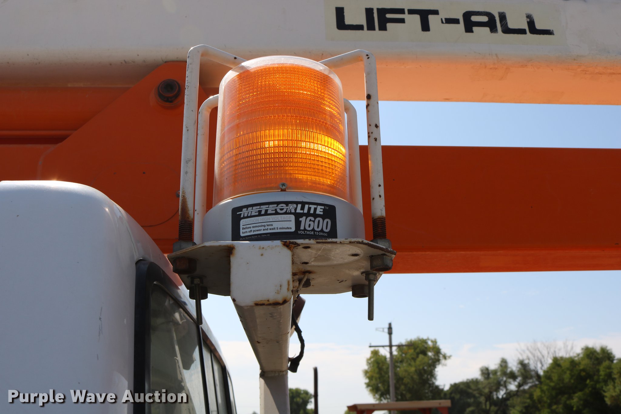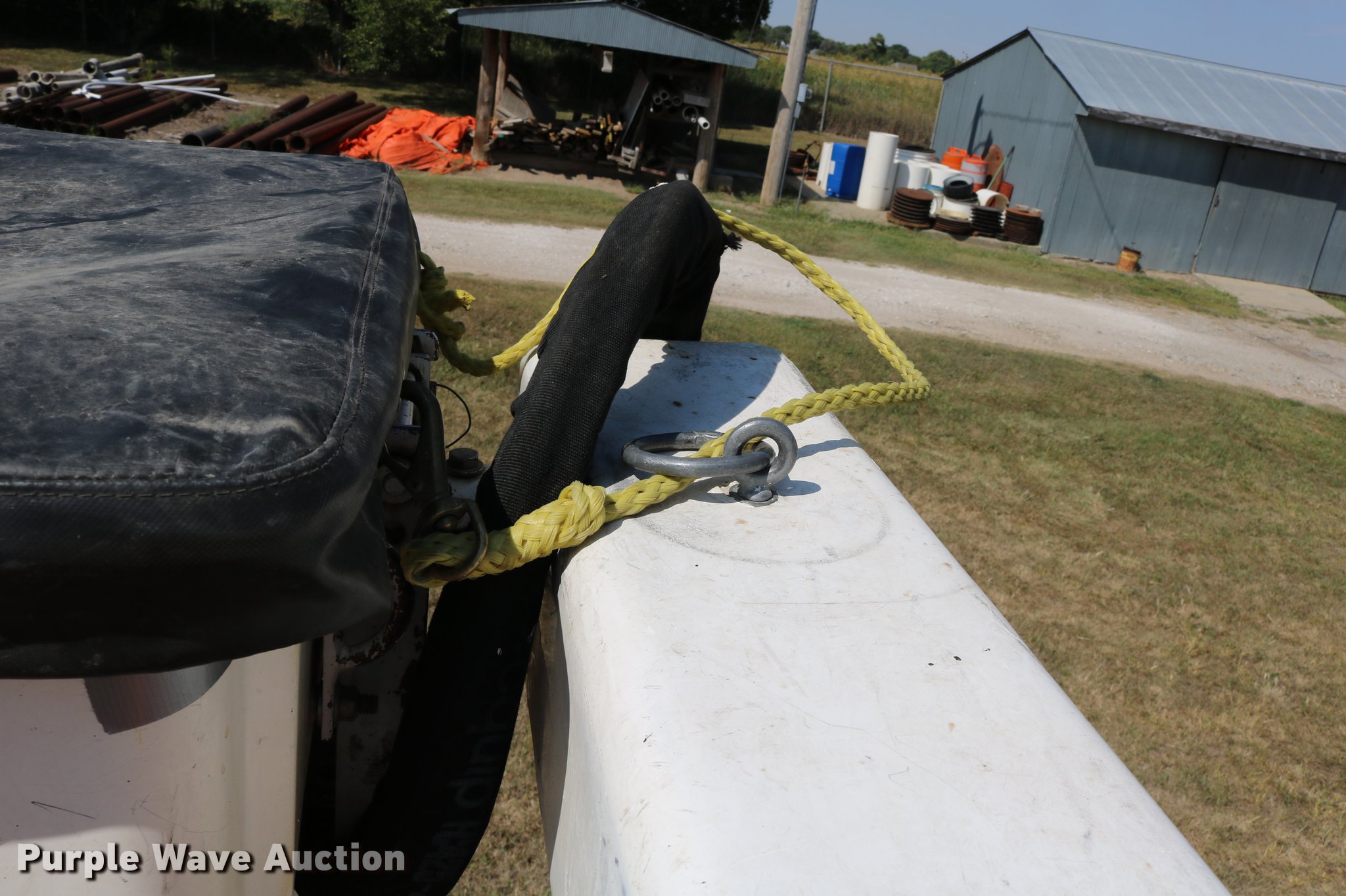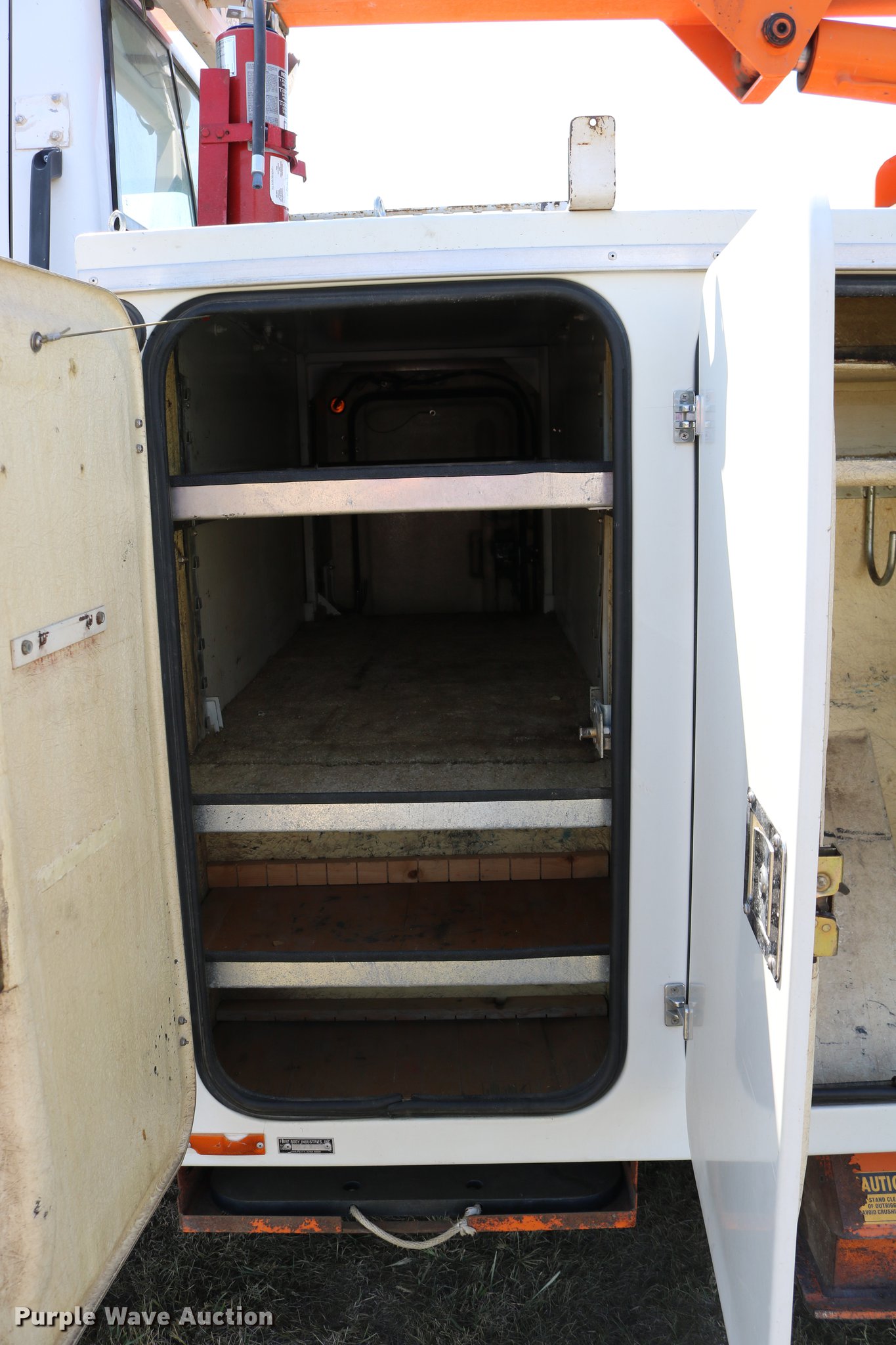 1992 GMC TopKick bucket truck. 159,354 miles on odometer, 1,995 engine hours on meter, 2,927 hydraulic hours on meter, Caterpillar 3116 6.6L L6 turbo diesel engine, Five speed manual transmission, Two speed rear end, Heat, AM, Front tow hooks, Beacon light, PTO, Fibre Body Ind. service bed 11'L, Shelving, Work lights, Serial 4712, Lift-all LAH-37-15 boom 37' boom length, 350 lbs max lift capacity, Man basket, 43' max lift height, Ground and platform controls, Boom rotation, Insulated boom, (2) hydraulic remotes in basket, (2) outriggers, Serial 3851089237FB, Single fuel tank, Pintle hitch, Receiver hitch, Trailer wiring, Spring suspension, Hydraulic brakes, Approx. 155" wheelbase, Dynatrac 9.00-20 tires, GVWR 27,080 lbs, Cracked windshield, Fire extinguisher not included. Kansas title. 1GDL7H1J0NJ523465. Sewer Treatment. 1268 180 Rd. Belleville, KS 66935