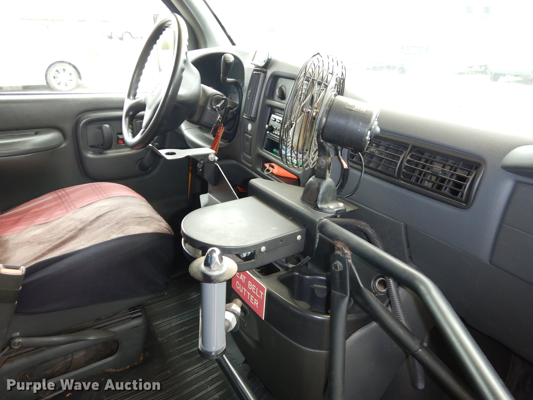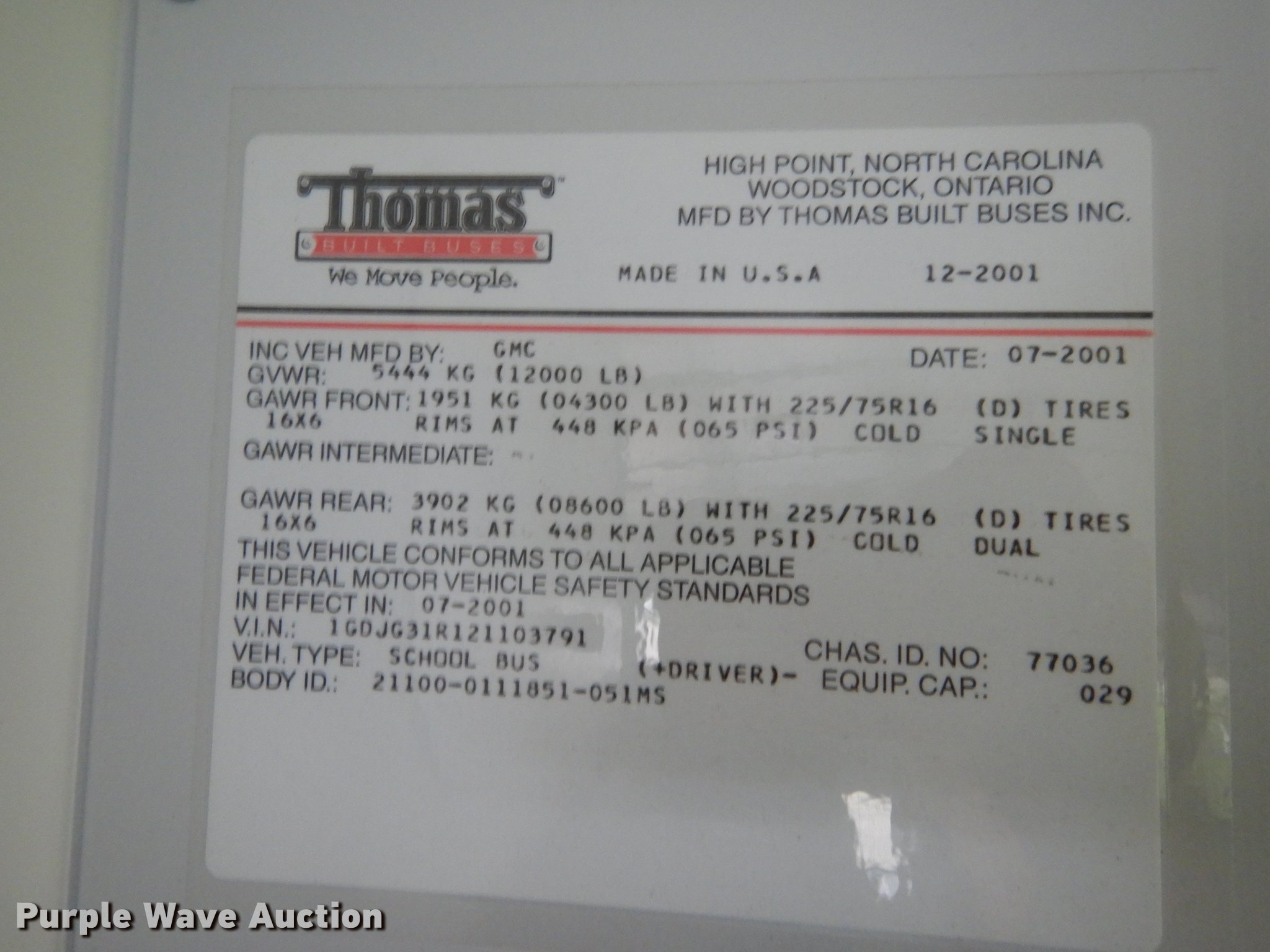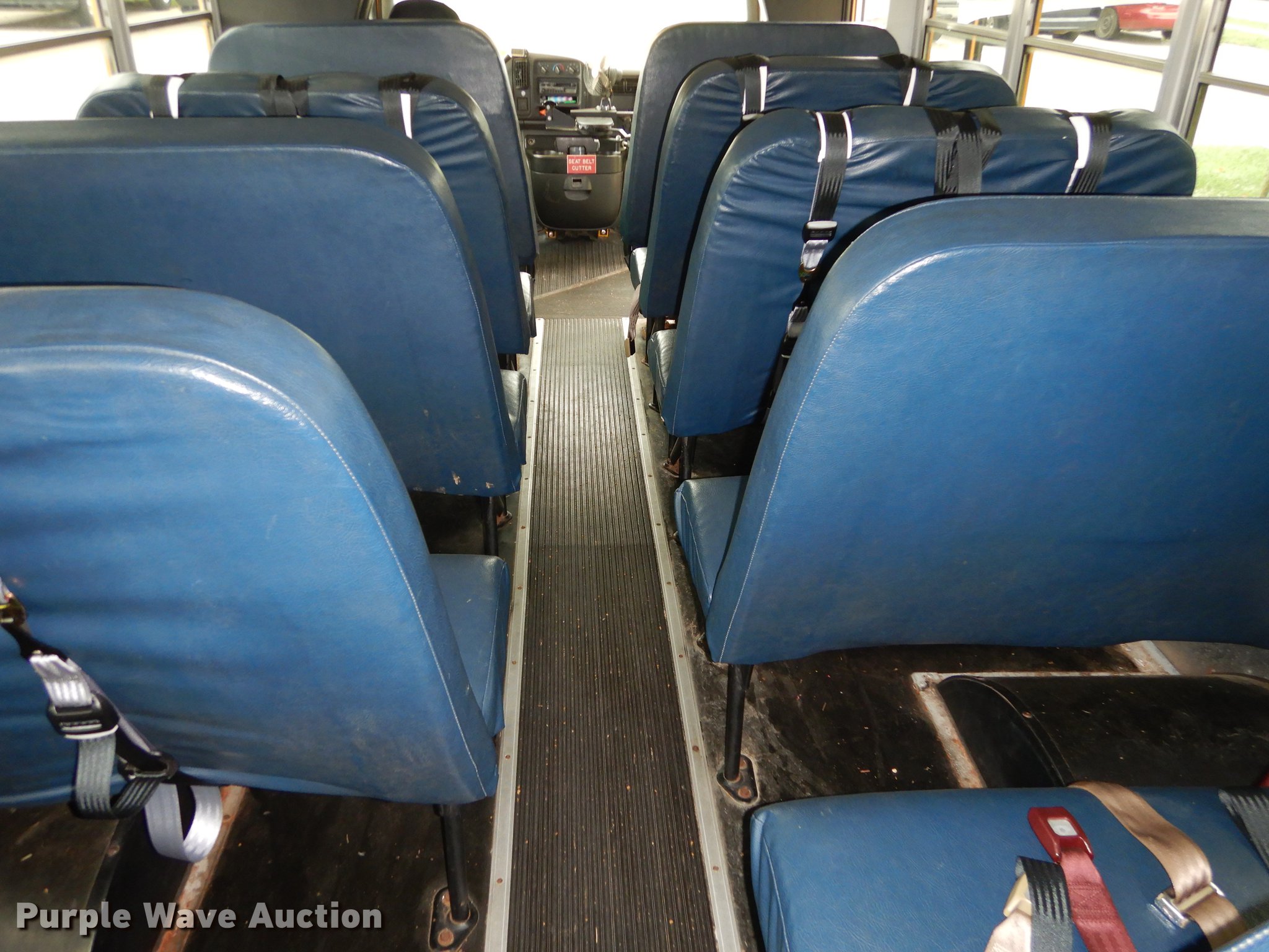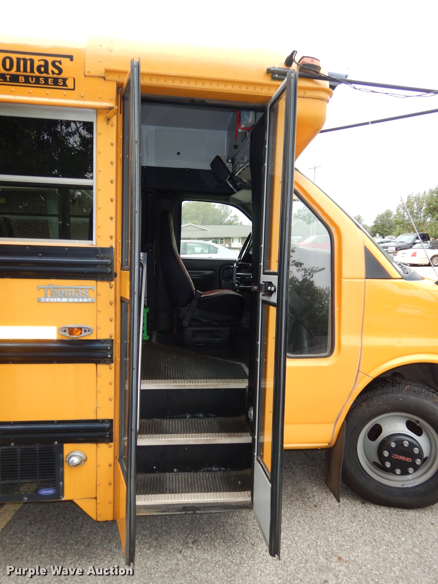 Purple Wave is selling a used Bus in Kansas. This item is a 2002 GMC Savana G3500 Cargo Thomas school bus with the following: 32,354 miles on odometer, 5.7L V8 OHV 16V gas engine, Automatic transmission, Single axle, AC and heat, AM/FM/cassette, Heated mirrors, Suspension seat, Vinyl interior, 29 passenger capacity, (29) seat belts, Ceiling, rear, and side emergency exits, Lighted stop sign, Carrier roof AC unit, Backup alarm, Rear tow hooks, Spring suspension, Hydraulic brakes, 160" wheelbase, Uniroyal 225/75R15 tires, GVWR 12,000 lbs
