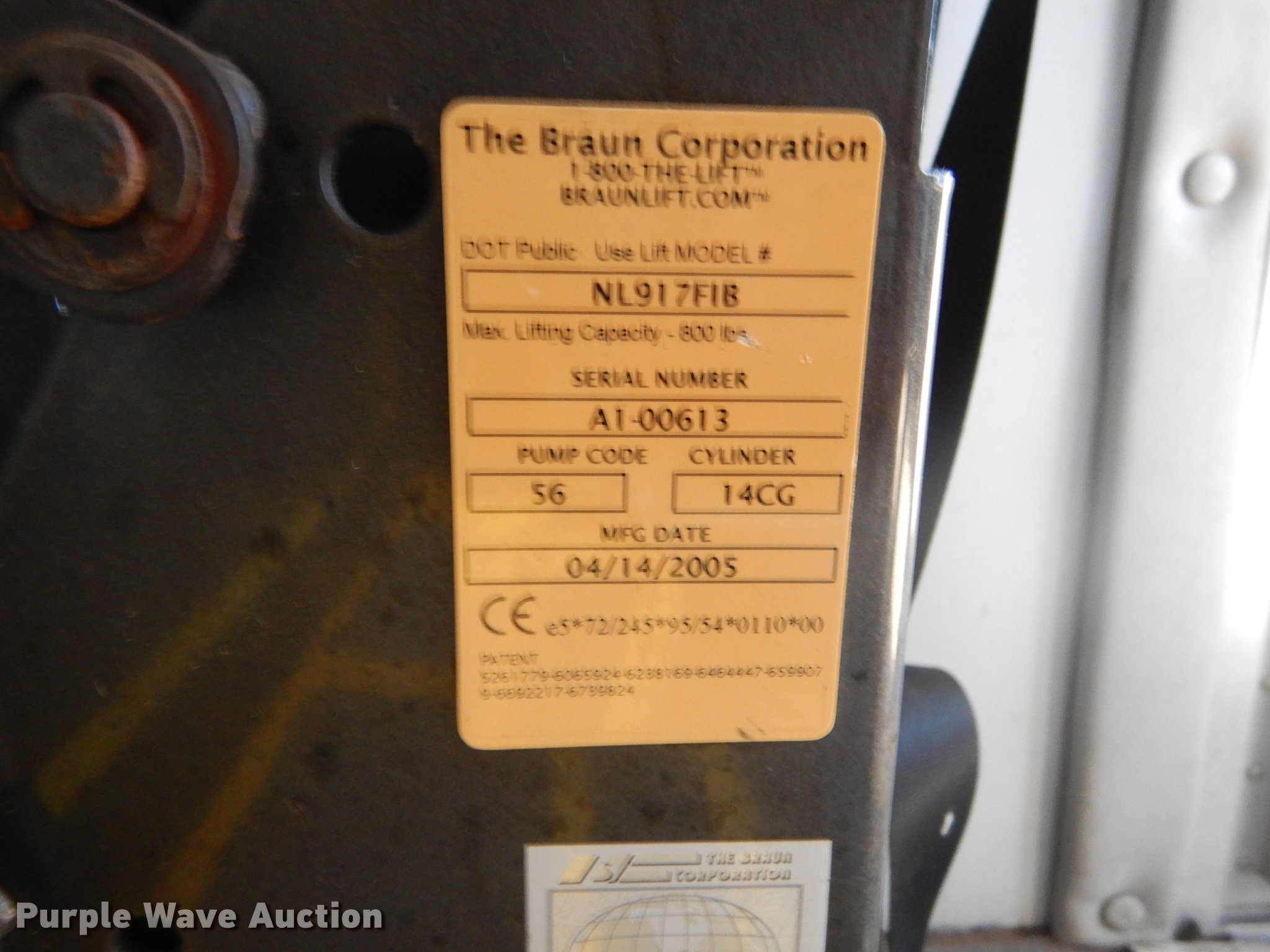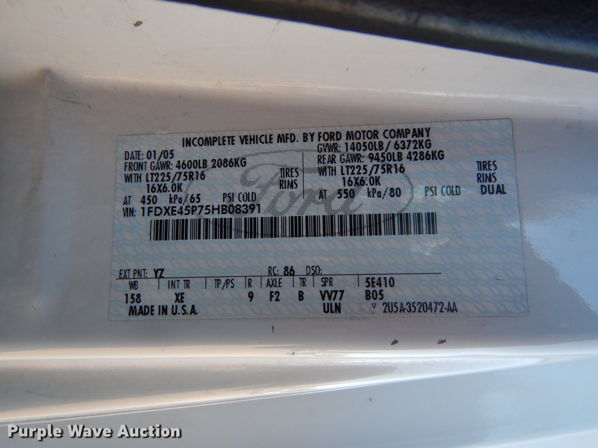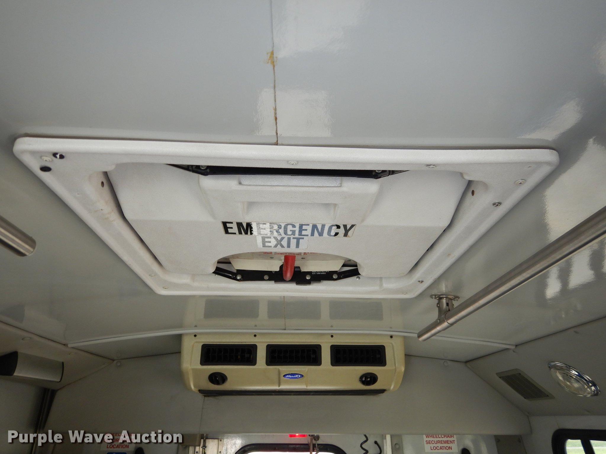 Purple Wave is selling a used Bus in Kansas. This item is a 2005 Ford E450 Super Duty shuttle bus with the following: 239,930 miles on odometer, 6.0L V8 OHV 32V diesel engine, Automatic transmission, Single axle, AC and heat, Tilt, Cruise, AM/FM/cassette, Power mirrors and drivers seat, Suspension seat, Cloth drivers interior, Vinyl passenger interior, Ceiling handrail, 14 passenger capacity, Seat belts, Braun NL917F1B wheelchair lift, Serial A1-00613, Wheelchair tie down area, Ceiling, rear, and side emergency exits, Carrier roof AC unit, Spring suspension, Mor/Ryde rubber, Hydraulic brakes, 13' wheelbase, Goodyear 225/75R16 tires, GVWR 14,050 lbs, Weak battery