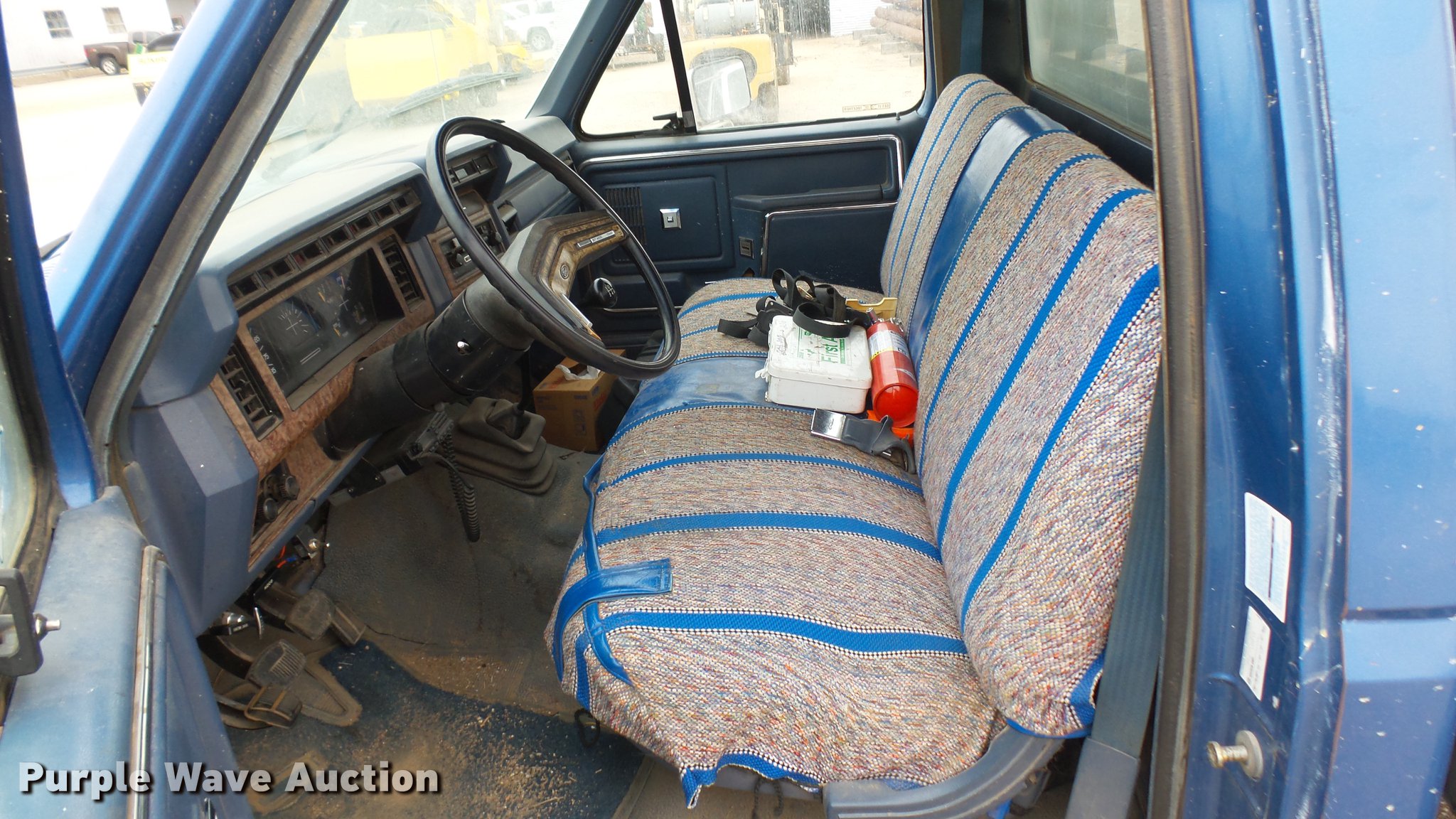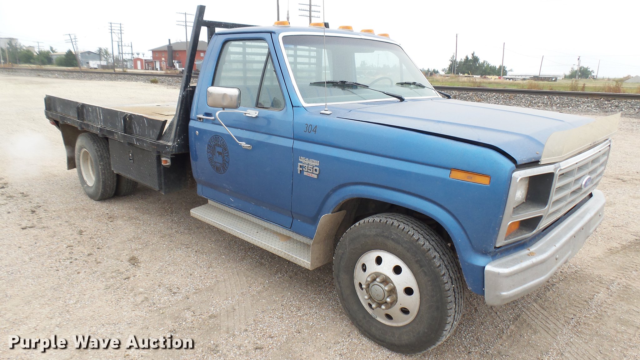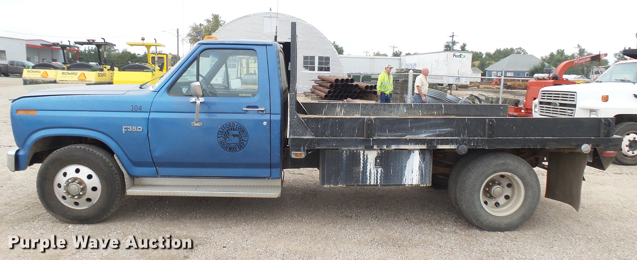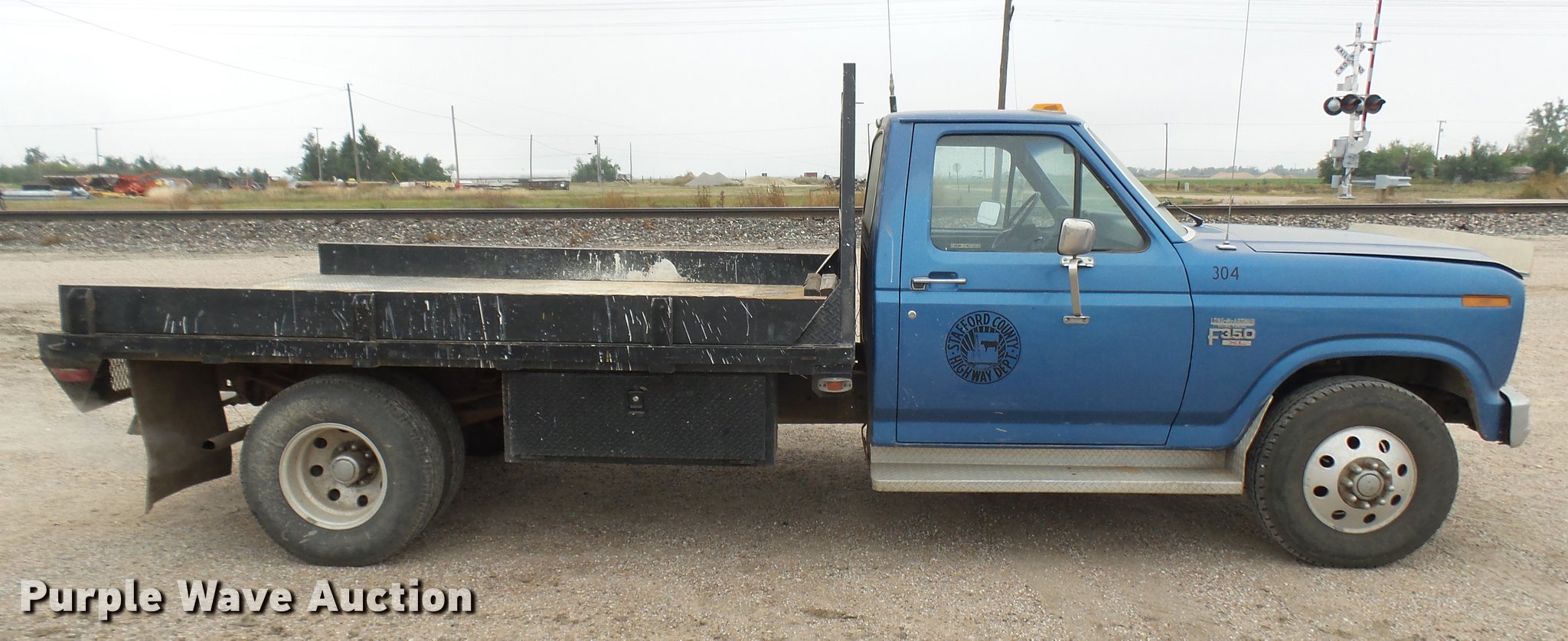 Purple Wave is selling a used 3/4 or 1 Ton Pickup or Van in Kansas. This item is a 1985 Ford F350 flatbed pickup truck with the following: 52,946 miles on odometer, Actual mileage unknown, 7.5L V8 OHV 16V gas engine, Four speed manual transmission, AC and heat, AM/FM, Power windows and locks, Vinyl interior, Running boards, 10.5'L x 88"W flatbed, Gooseneck ball, Receiver hitch, Trailer wiring, 7.50R16 tires