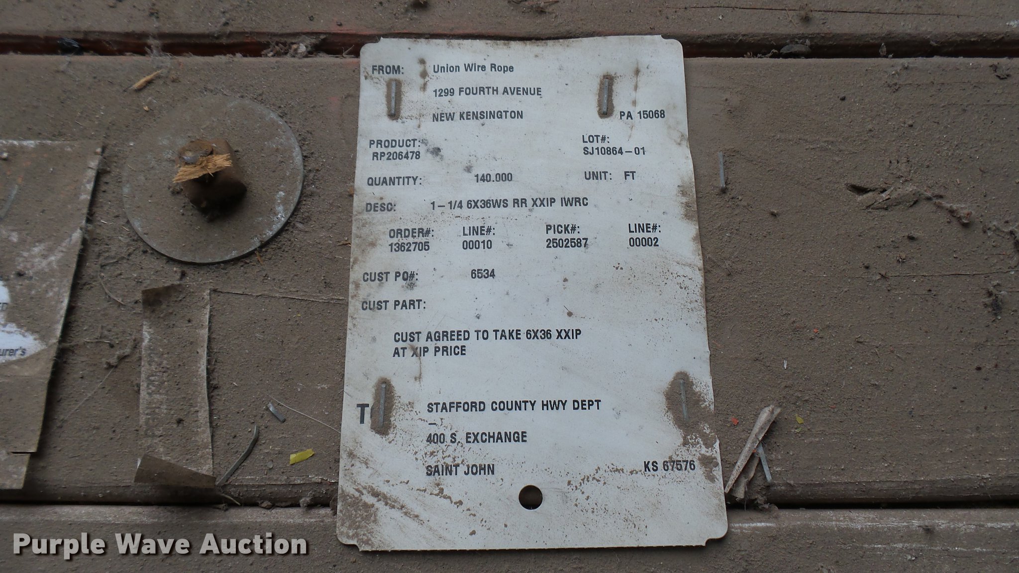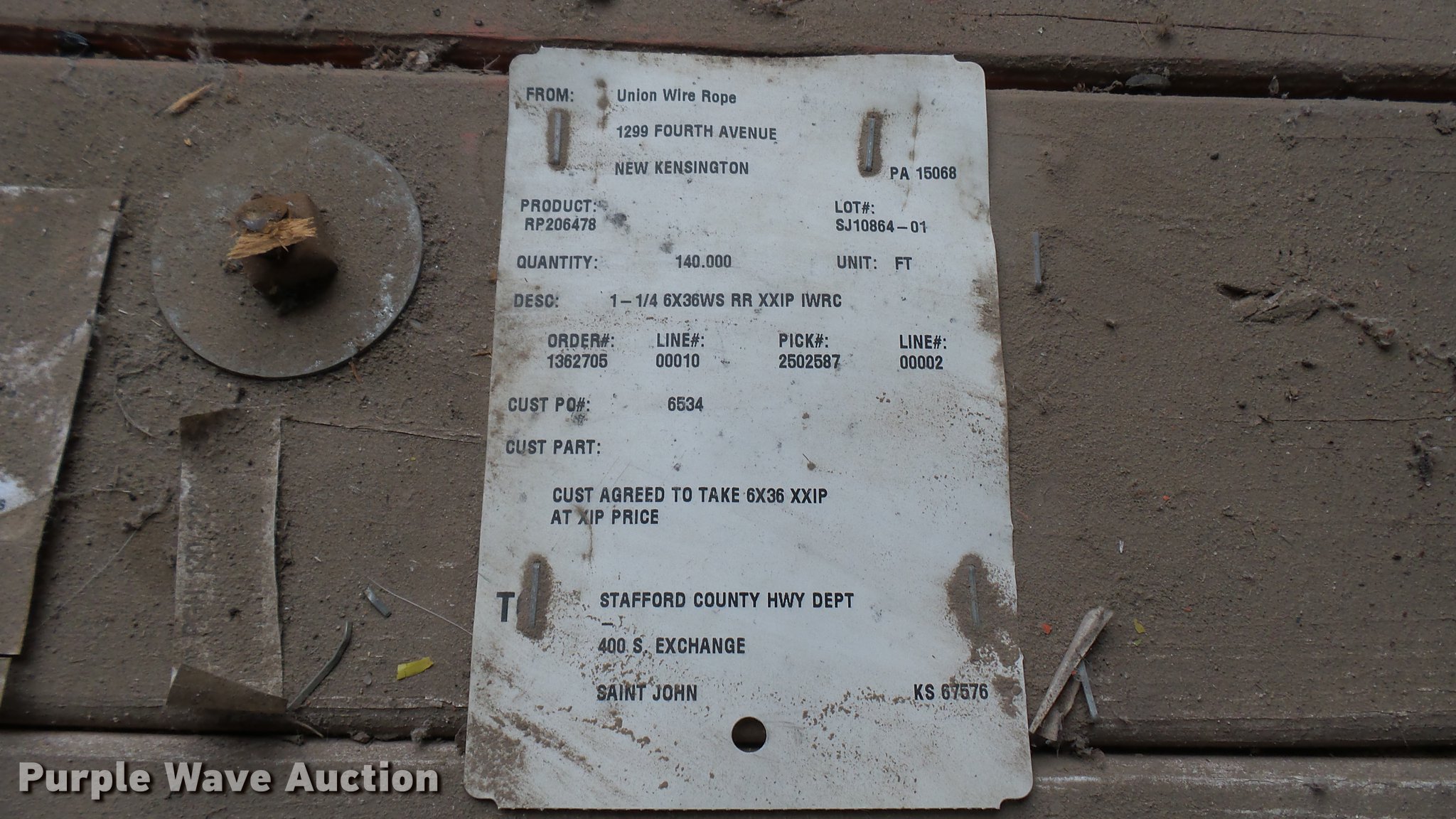 Purple Wave is selling a used Lifting and Rigging in Kansas. This item is a Steel cable with the following: 140', 1 1/4" 6x36WS, Unused