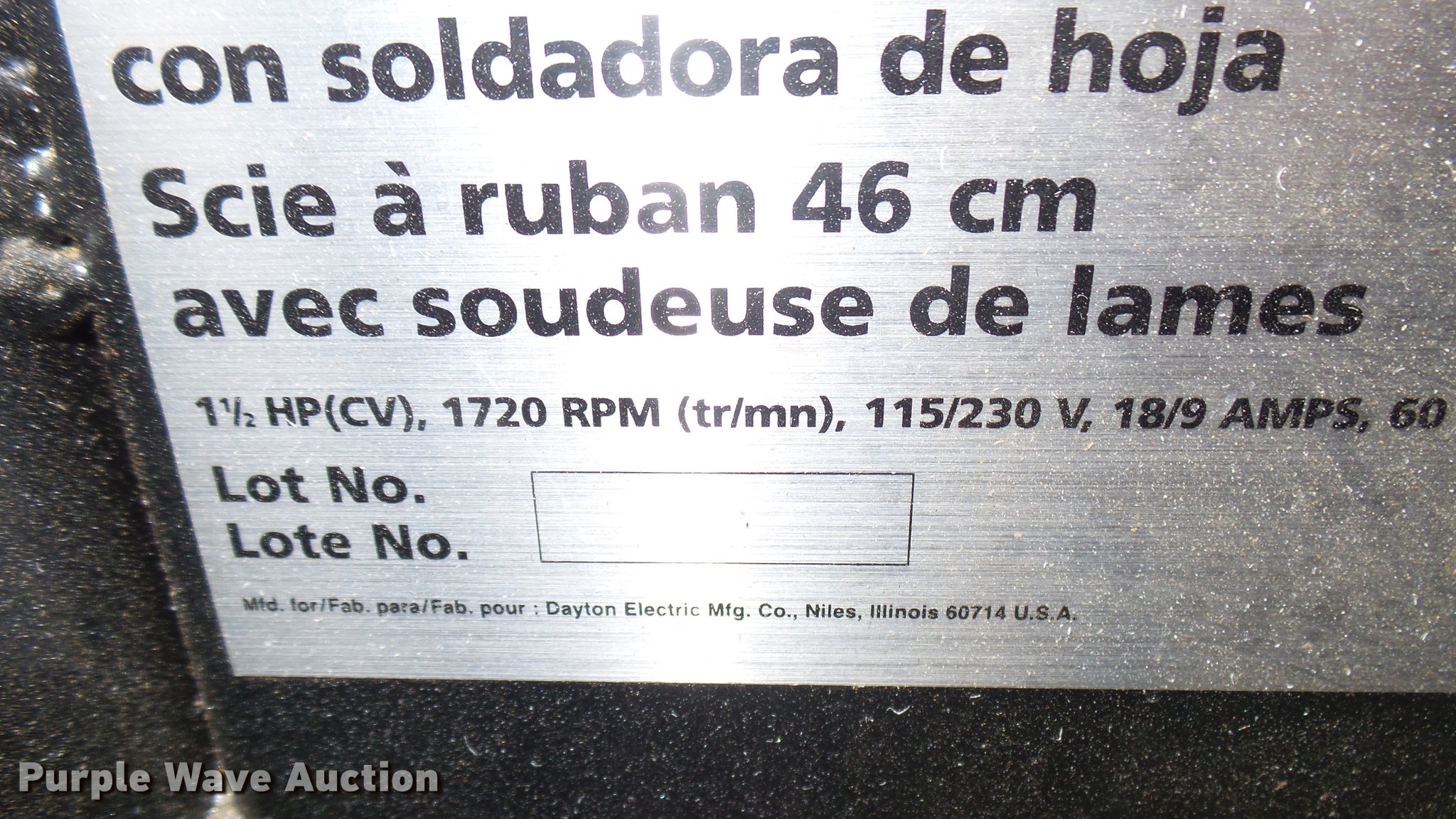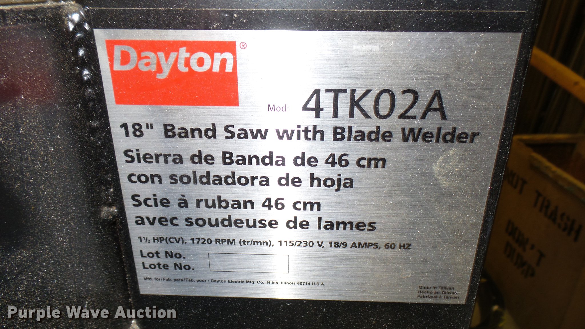 Purple Wave is selling a used Tools in Kansas. This item is a Dayton 4TK02A bandsaw with the following: 1.5 HP, 115/230V, 18", Digital blade speed indicator