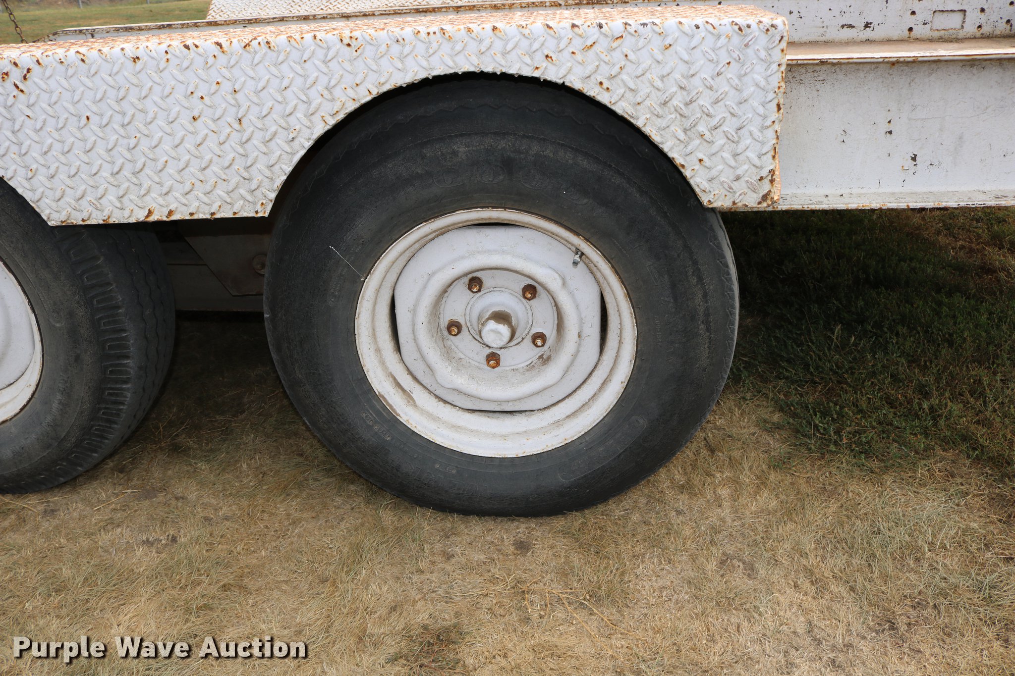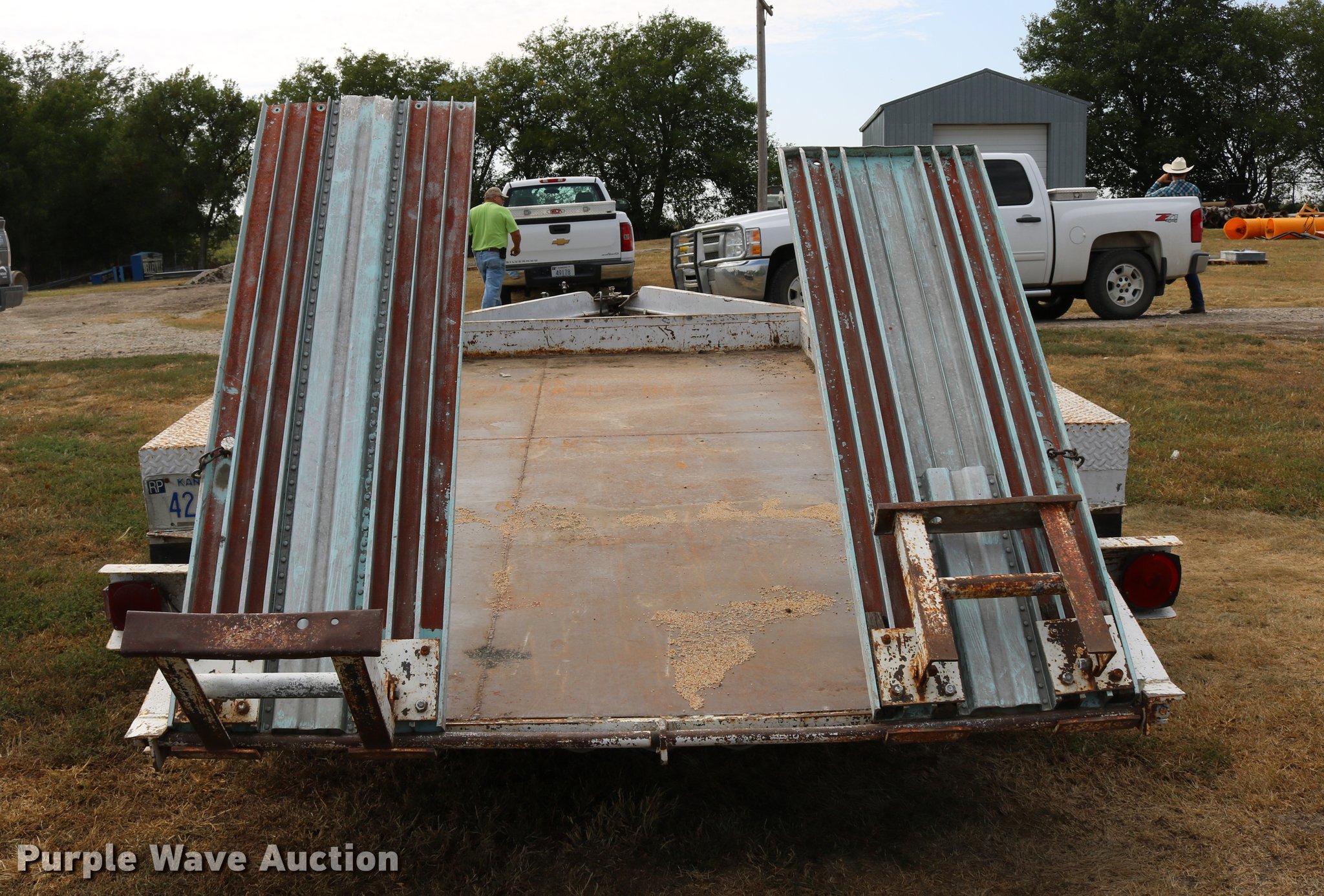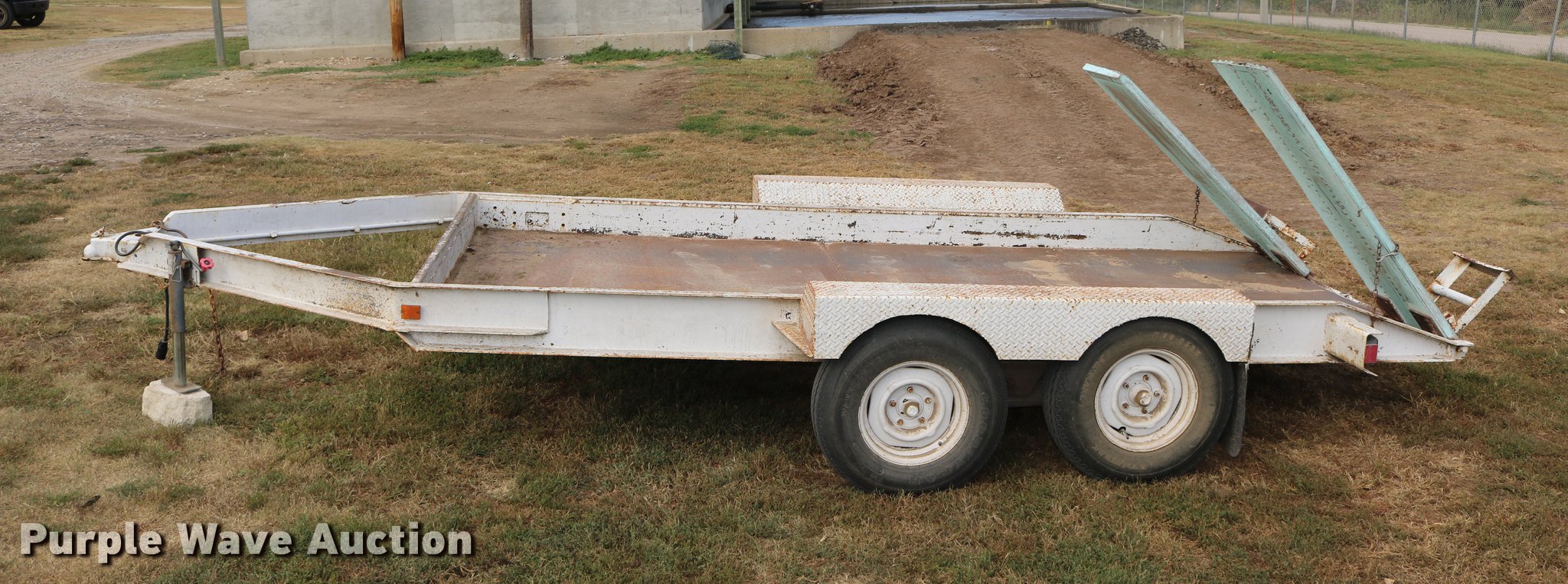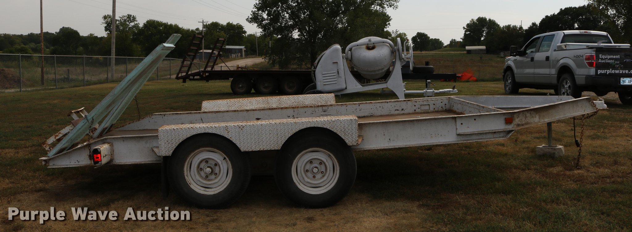 Purple Wave is selling a used Car or Utility Trailer in Kansas. This item is a 1997 shop built utility trailer with the following: 19'8"L x 103"W overall, 14'L deck, 7 1/4" side height, Approx. 20" floor height, 5'L ramps, 2" ball hitch, Single leg landing gear, Electric brakes, Not hooked up, Tandem axle, Steel wheels, 7.00-15 tires