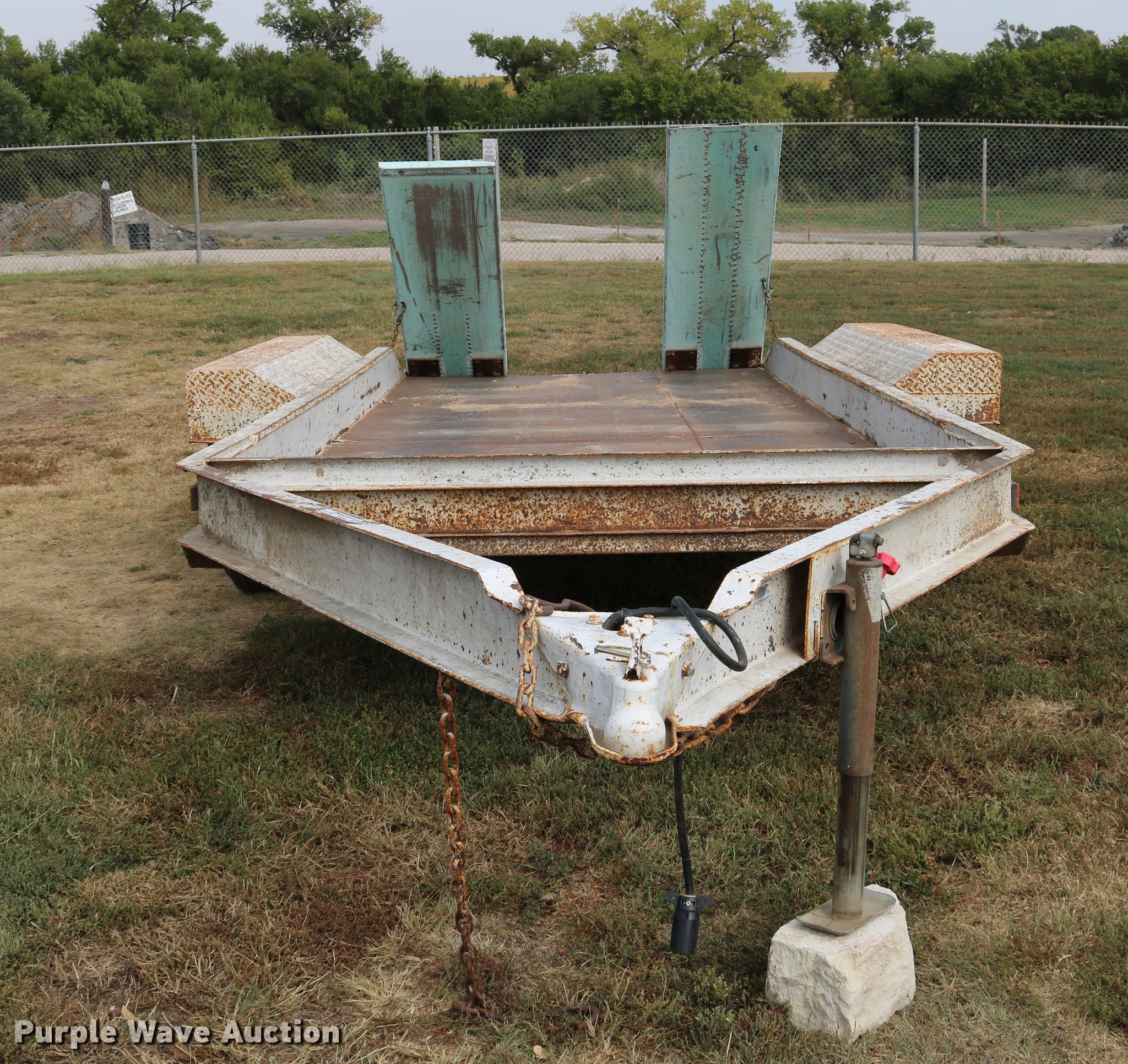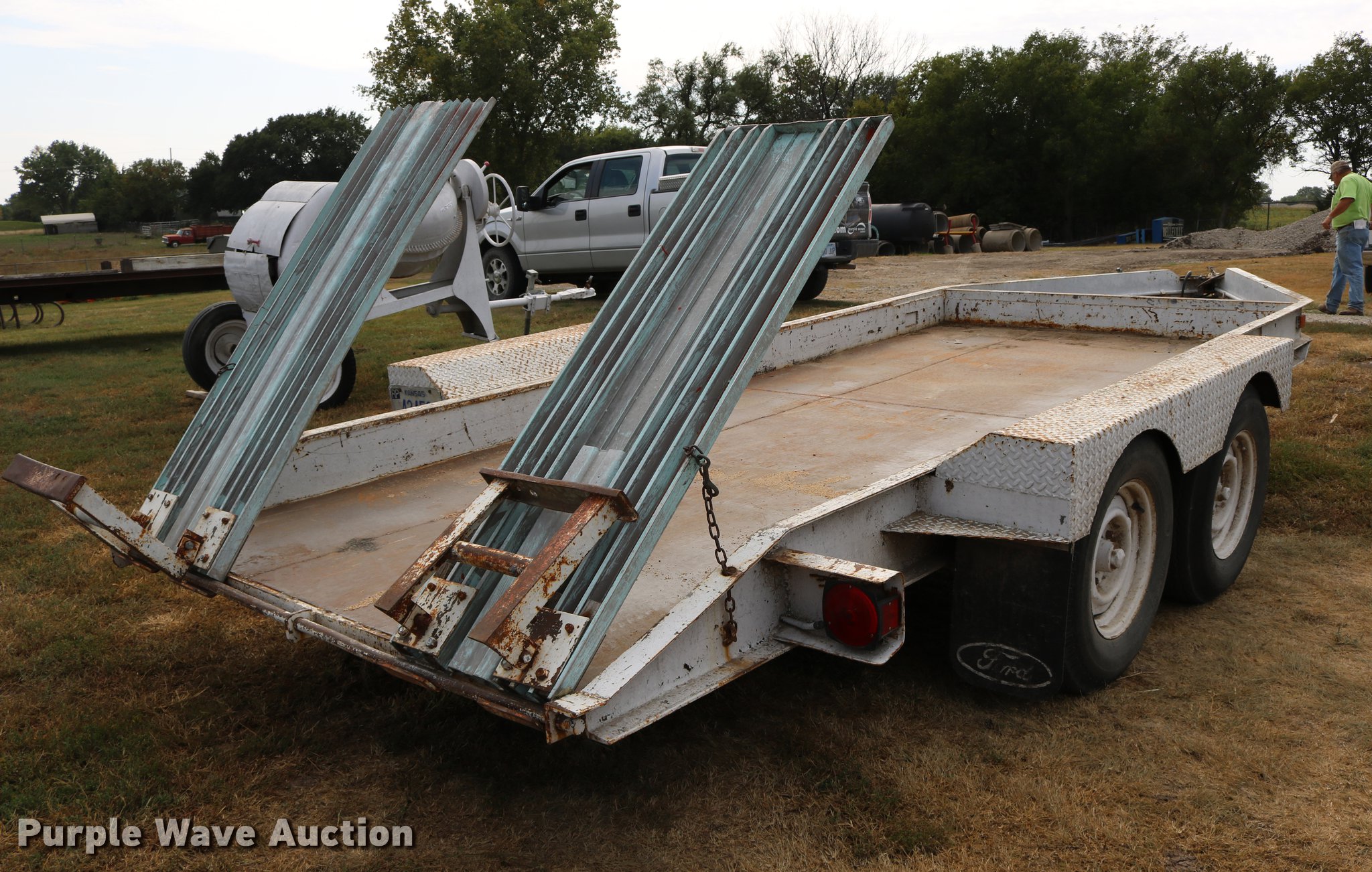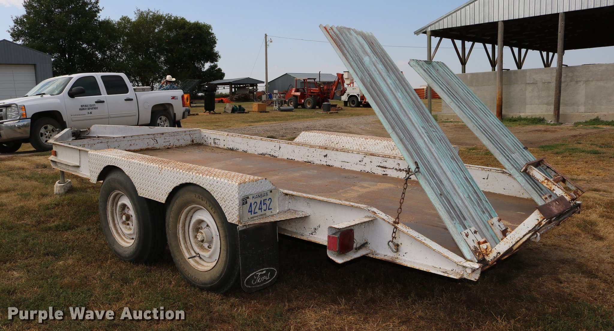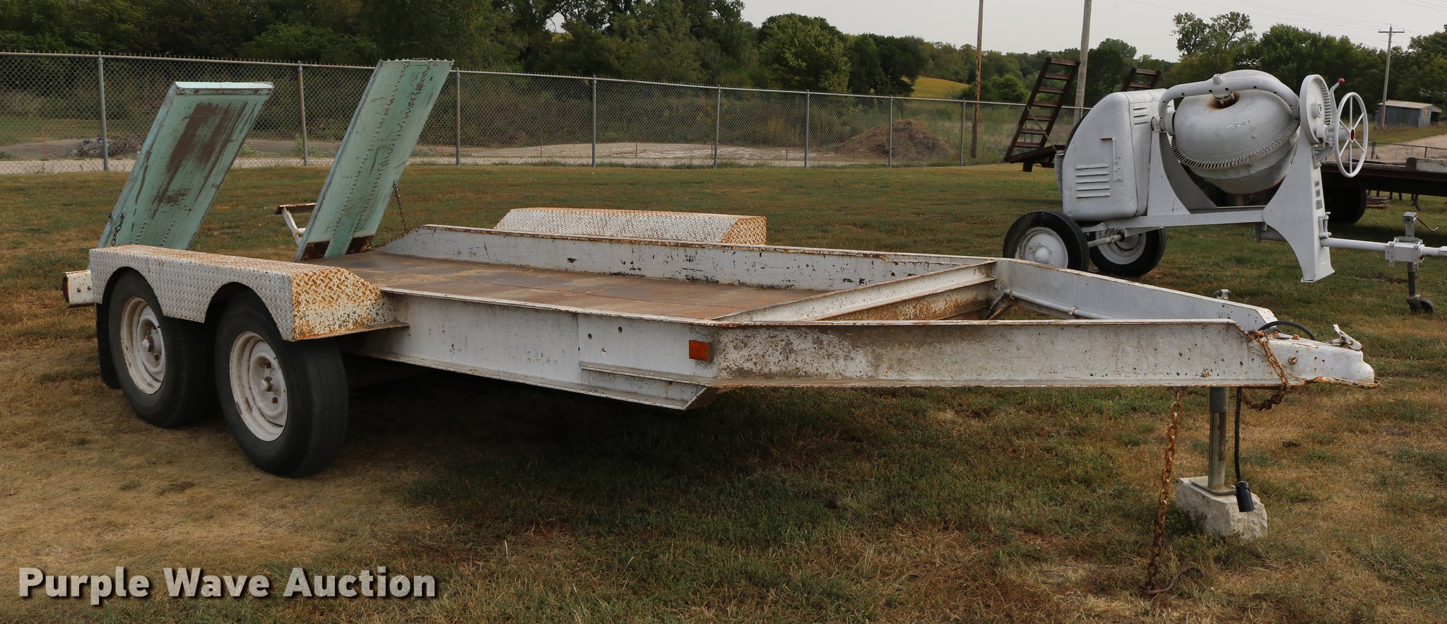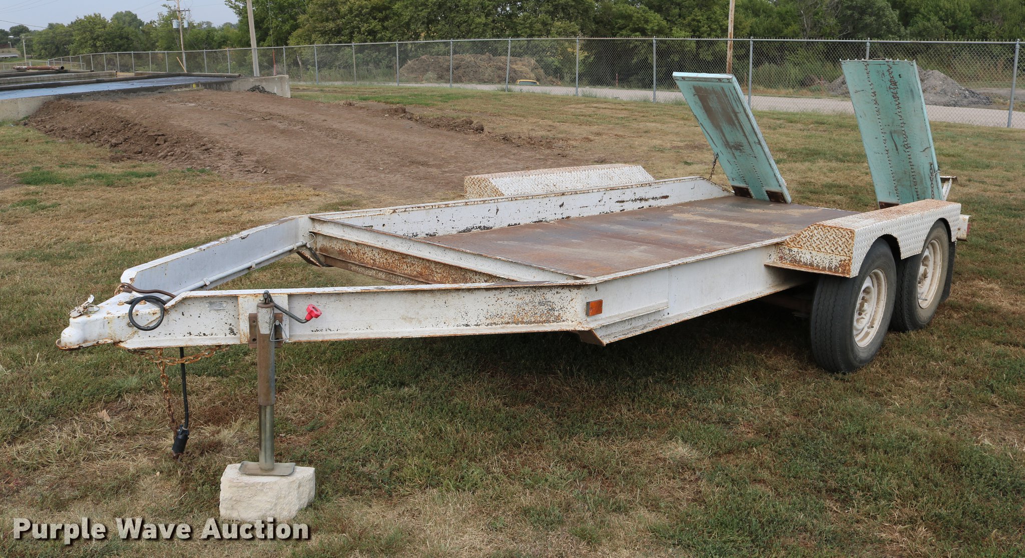 Purple Wave is selling a used Car or Utility Trailer in Kansas. This item is a 1997 shop built utility trailer with the following: 19'8"L x 103"W overall, 14'L deck, 7 1/4" side height, Approx. 20" floor height, 5'L ramps, 2" ball hitch, Single leg landing gear, Electric brakes, Not hooked up, Tandem axle, Steel wheels, 7.00-15 tires