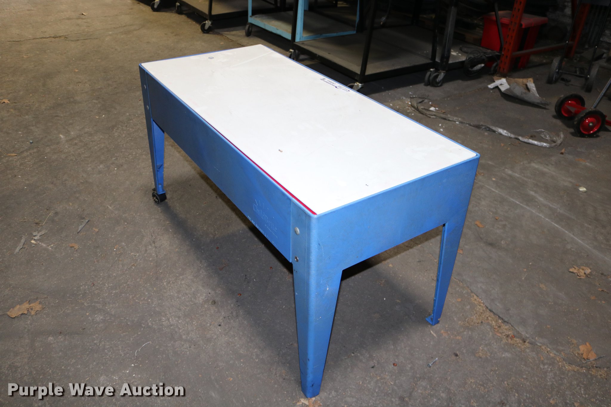 Purple Wave is selling a used Furniture in Kansas. This item is a Child Brite sand table with the following: 46" x 21" top, 24.5"H, (2) casters