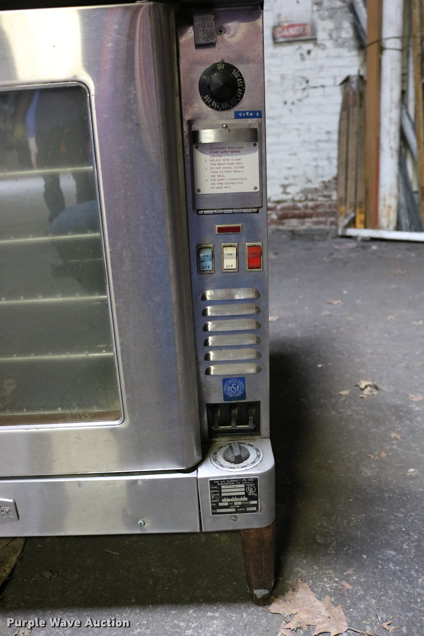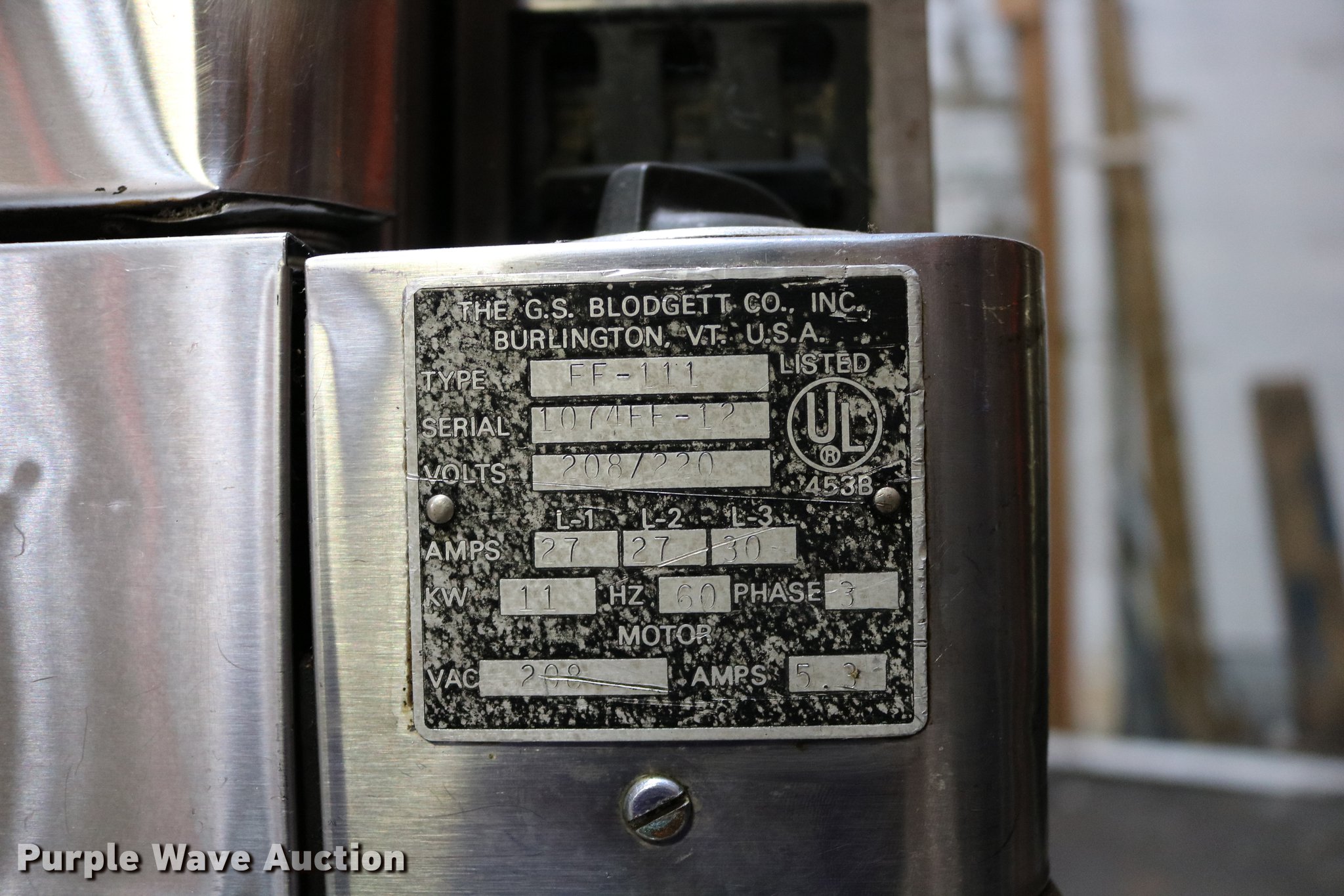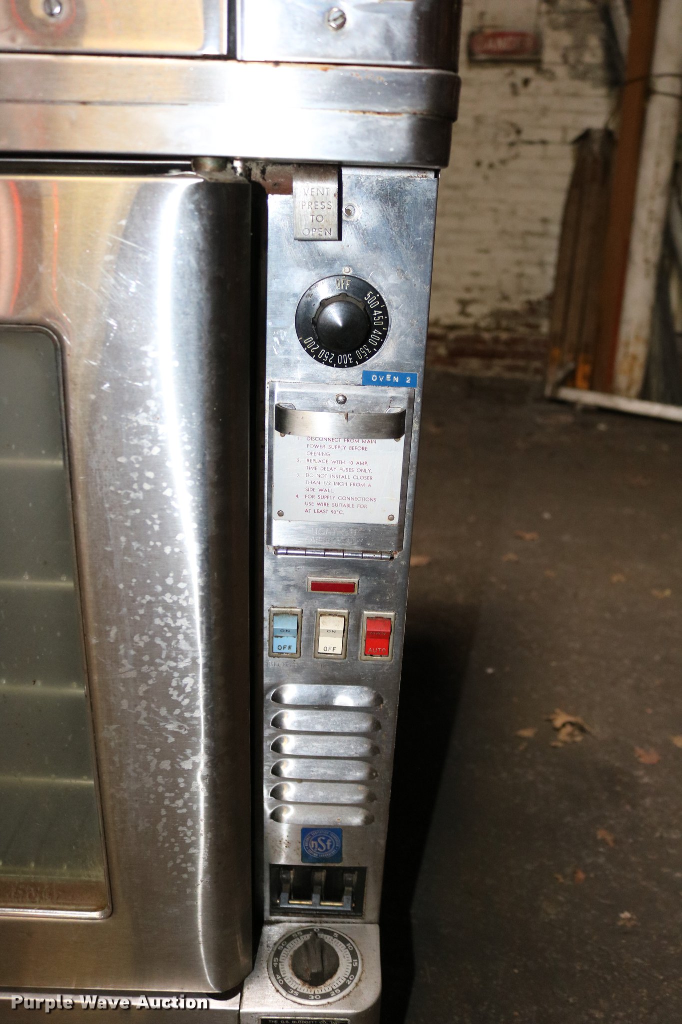 Purple Wave is selling a used Restaurant Equip. in Kansas. This item is a Blodgett double convection oven with the following: Top unit, Type FF-111, 208/220V, Serial 1074FF-12, Bottom unit, Type FF-14, 208/220V, Serial 1074FF-12, 38 1/4" x 37" x 64.5"