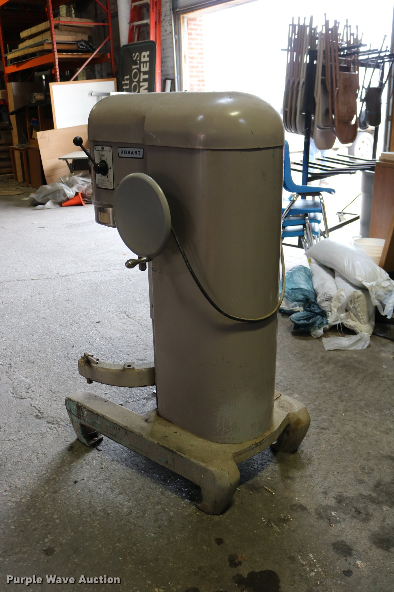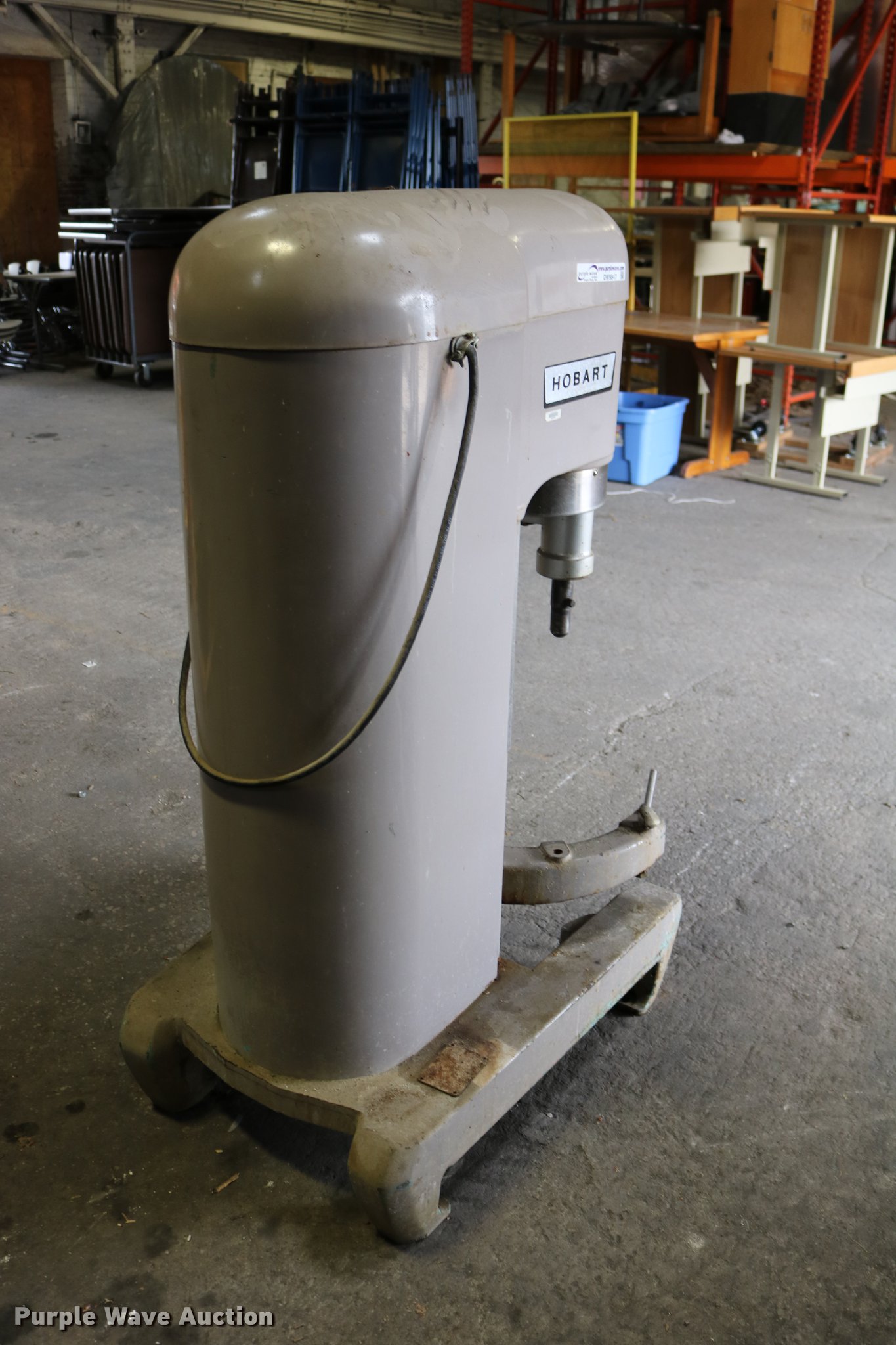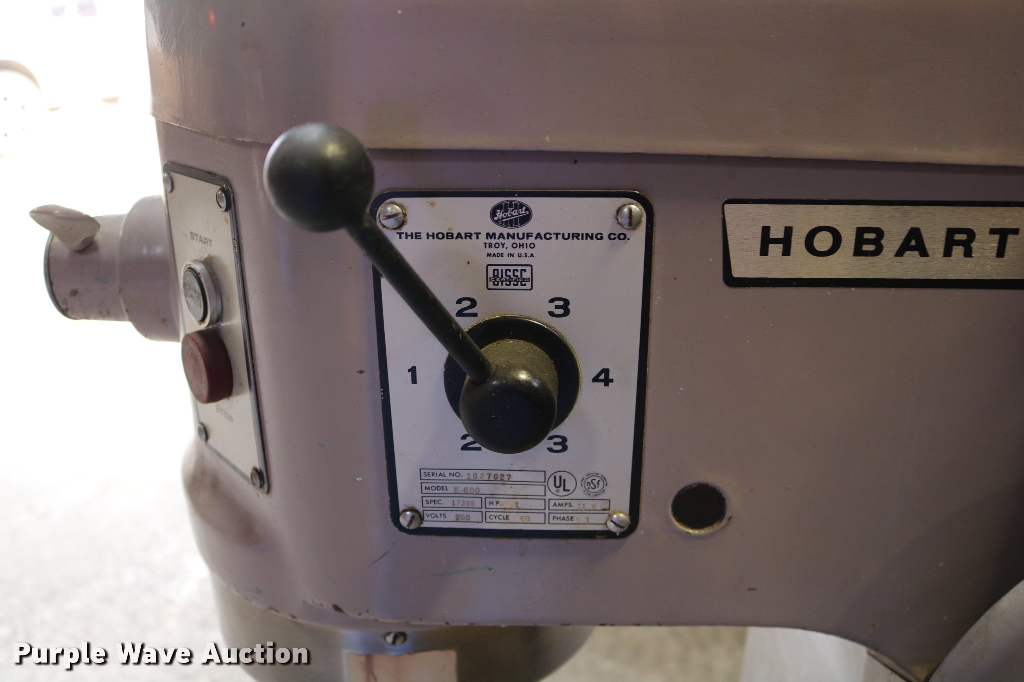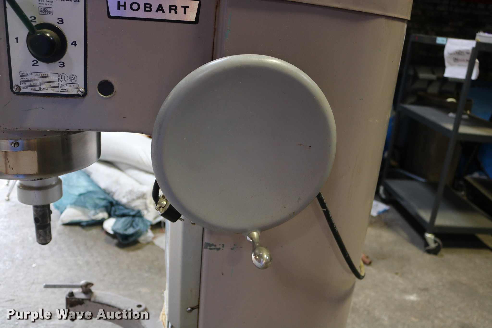 Purple Wave is selling a used Restaurant Equip. in Kansas. This item is a Hobart M-600 mixer with the following: 1 HP, 208V, Single phase, Approx. 37" x 26 3/4" x 55", No bowl/kettle, Serial 1827027