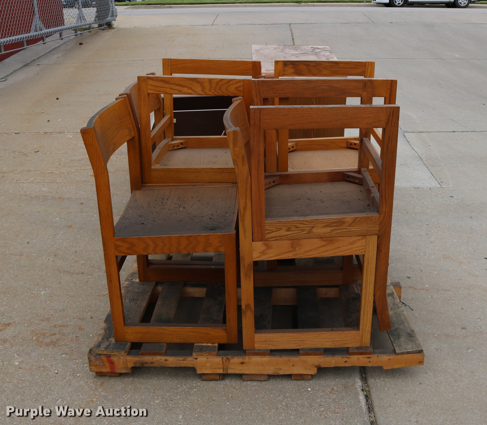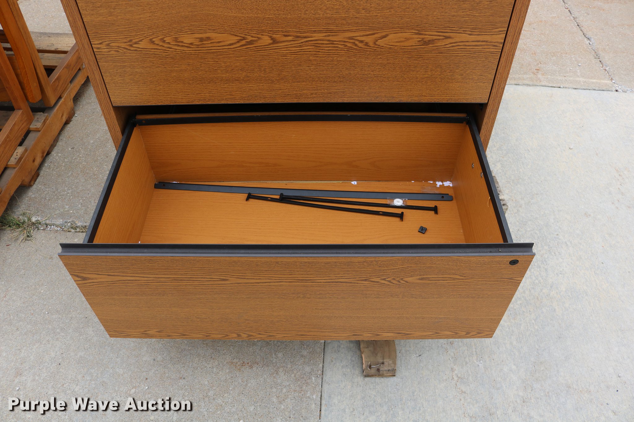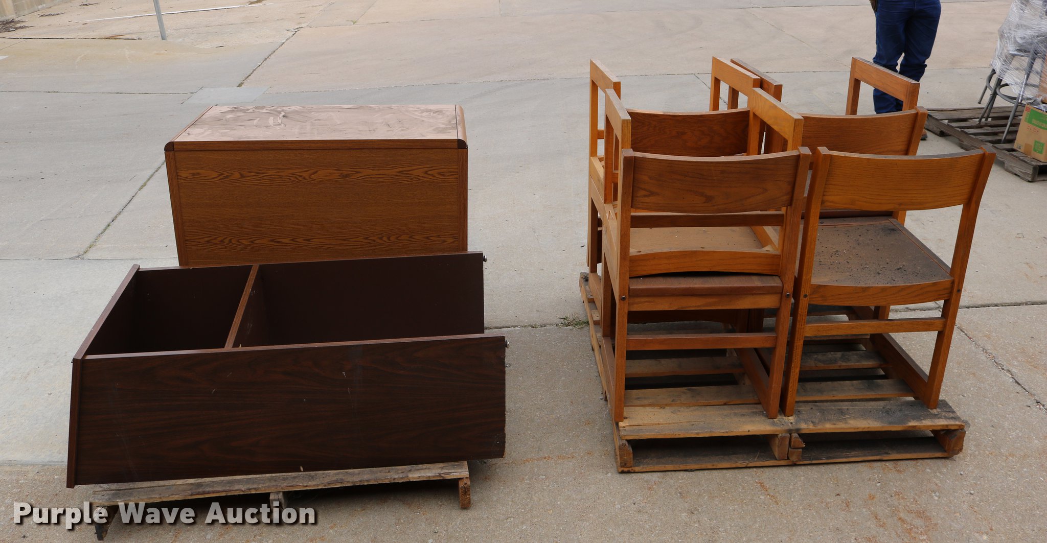 Purple Wave is selling a used Furniture in Kansas. This item is a Furniture with the following: (7) wood chairs, Two drawer file cabinet, Podium