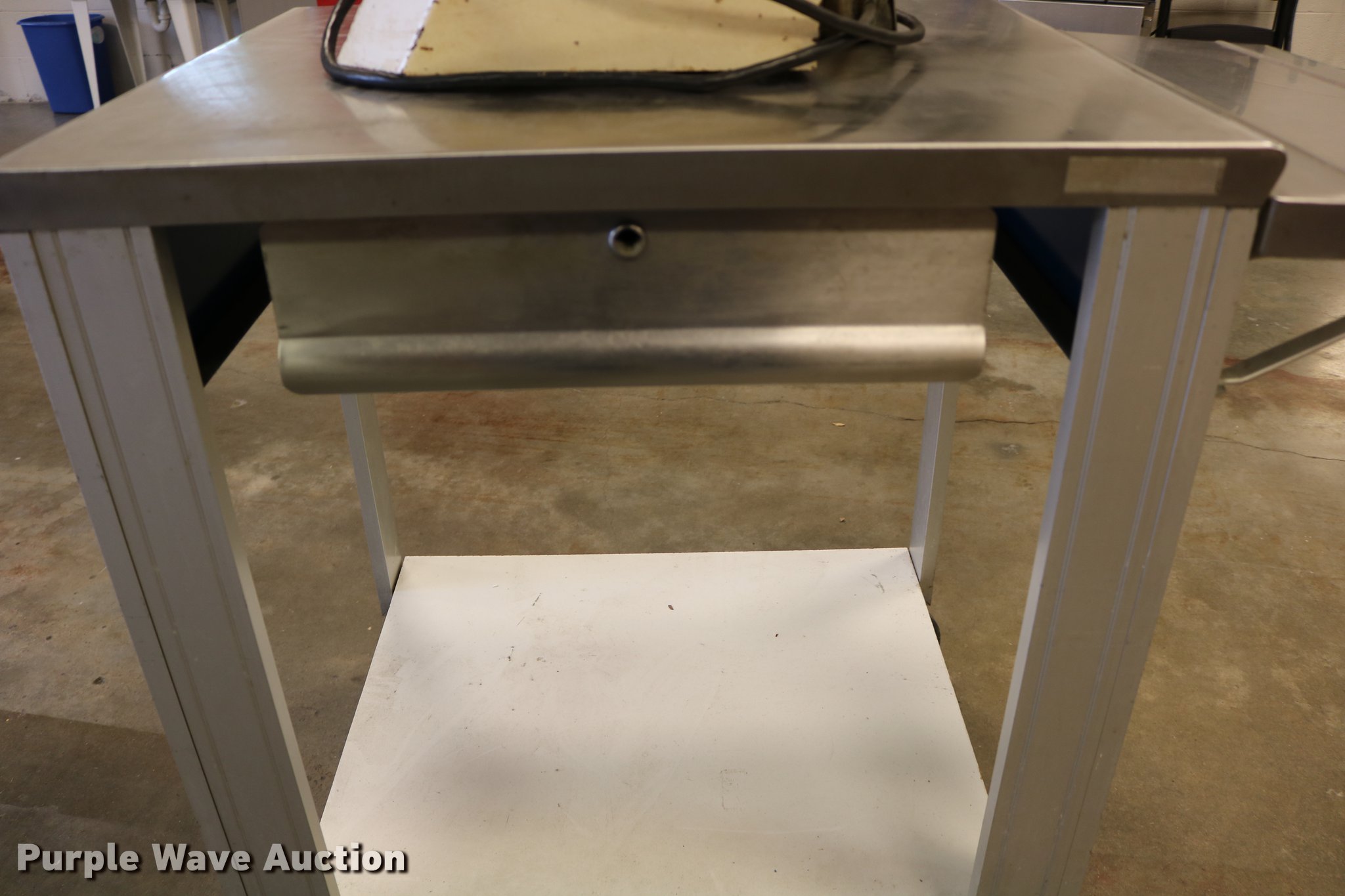 Restaurant equipment. Hobart slicer Model 1712, 115V, Single phase, 1/3 HP, Cradle and guide missing, Serial 1827903, Stainless steel cart 32" x 24" top, 29.5"H, Casters, Cashiers cart 28.5" x 24" stainless steel top, One drawer, 35 1/4"H, Moline bread slicer Model 250, 115V, Single phase, No brake, Serial 13-3331-71. USD 453. 714 Lawrence Ave. Leavenworth, KS 66048