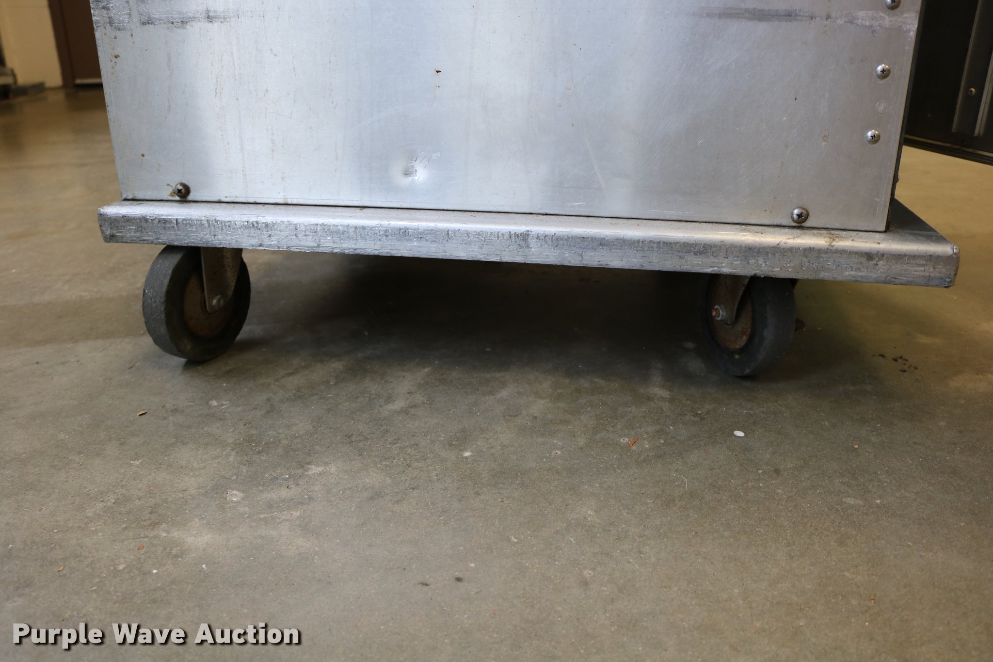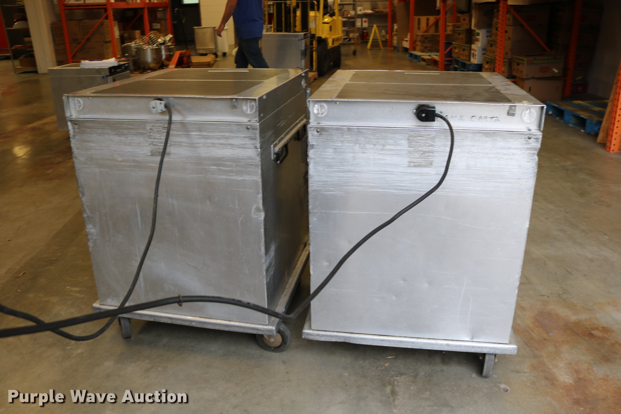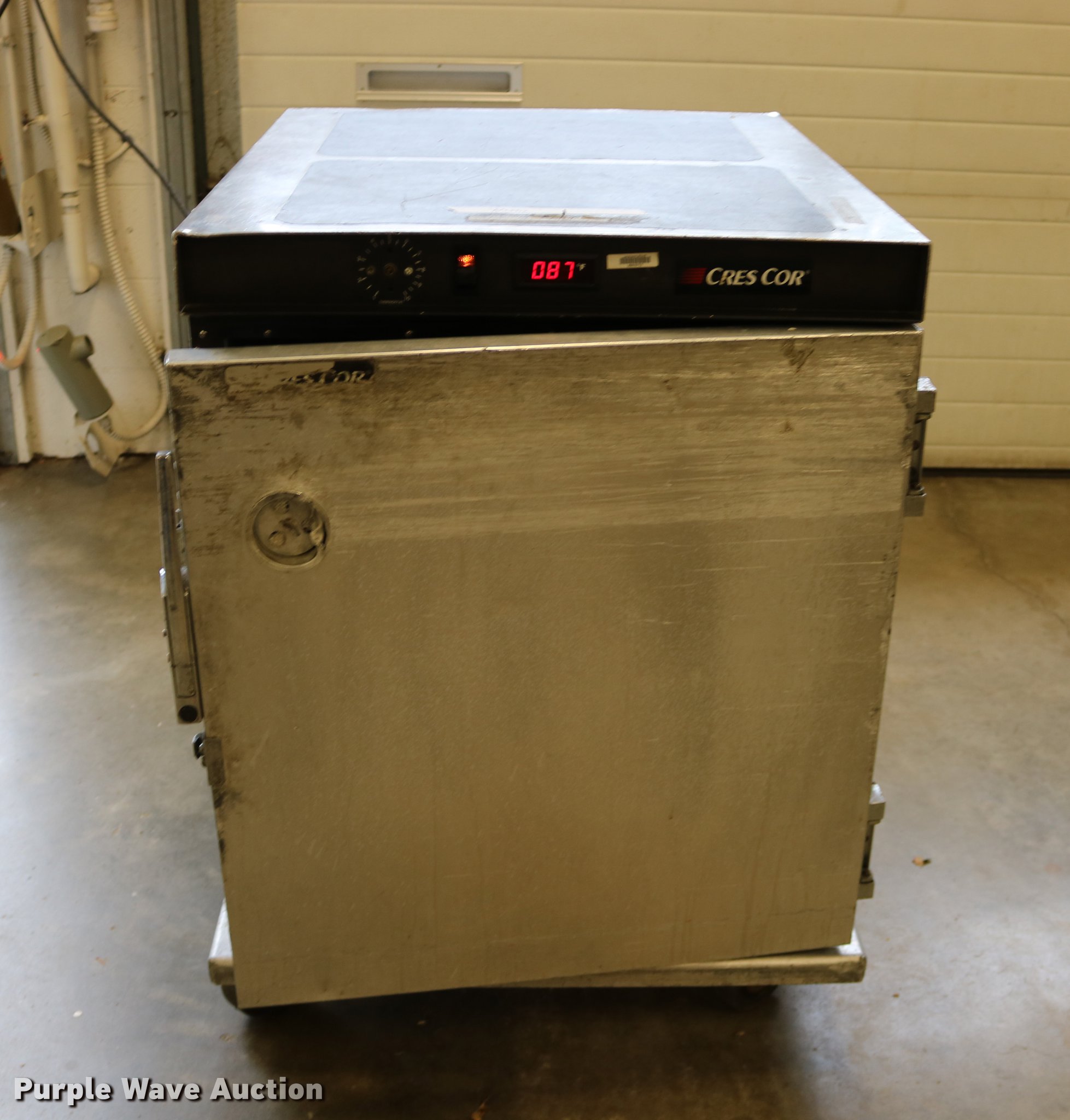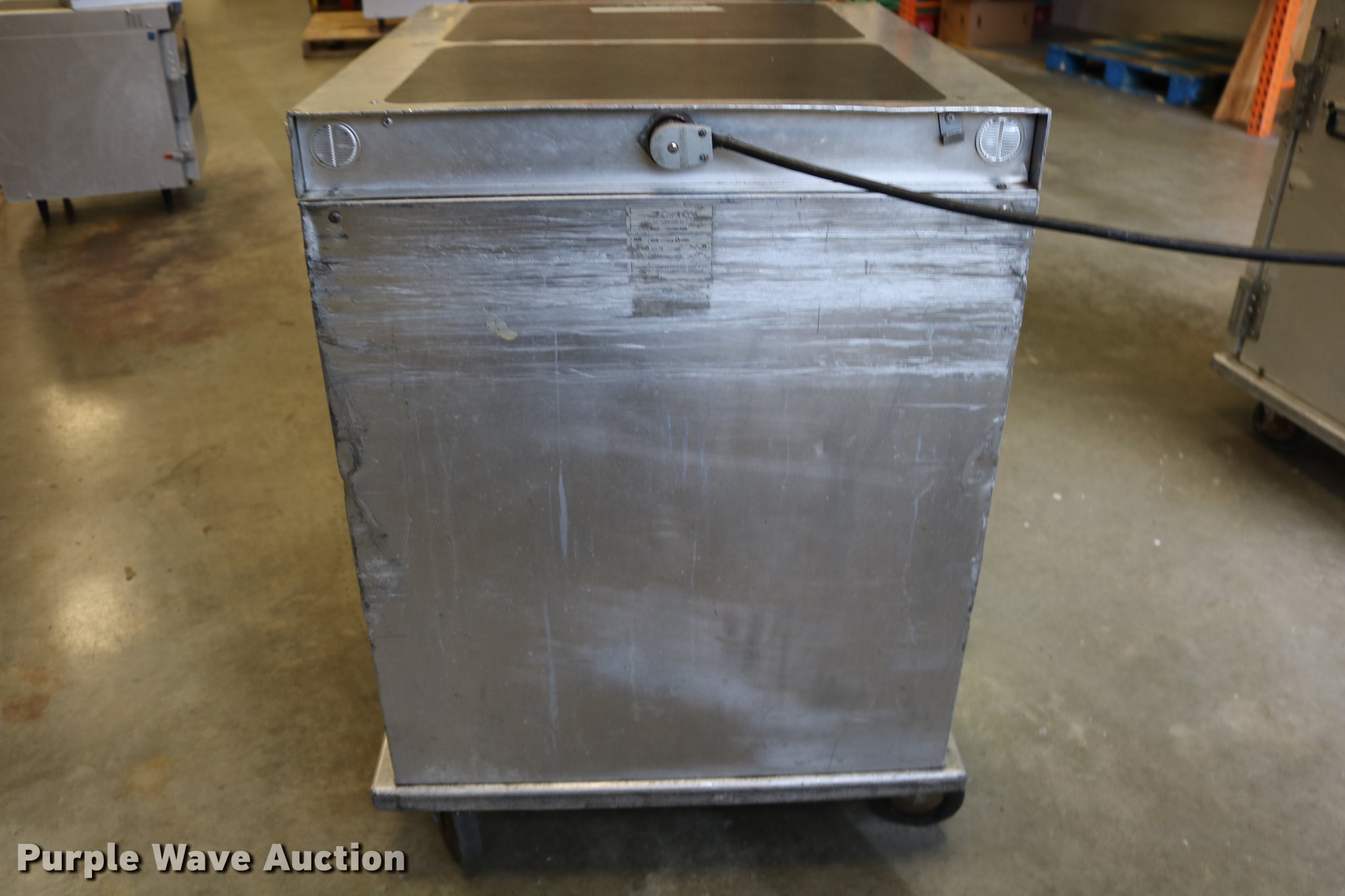 Purple Wave is selling a used Restaurant Equip. in Kansas. This item is a (2) Cres-Cor warmers with the following: Model H-739UA8B, 120V, Single phase, 29.5" x 27" x 37", One latch broken, One dial broken, Caster wheel missing