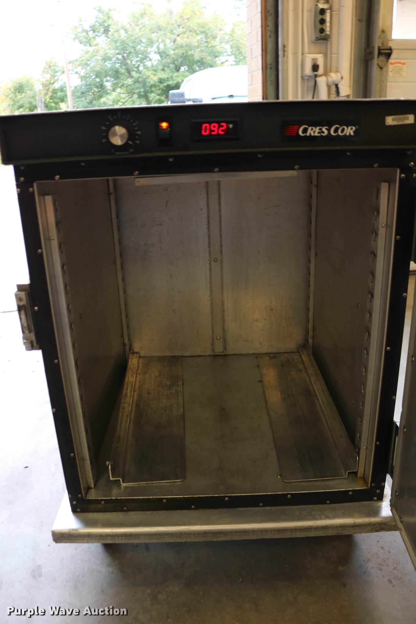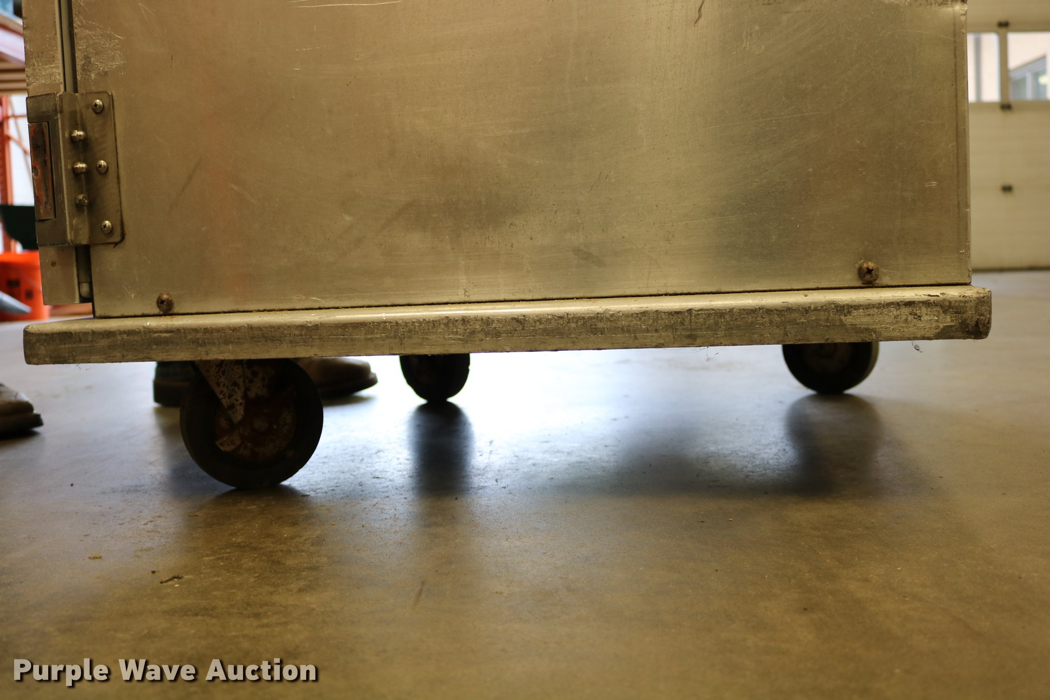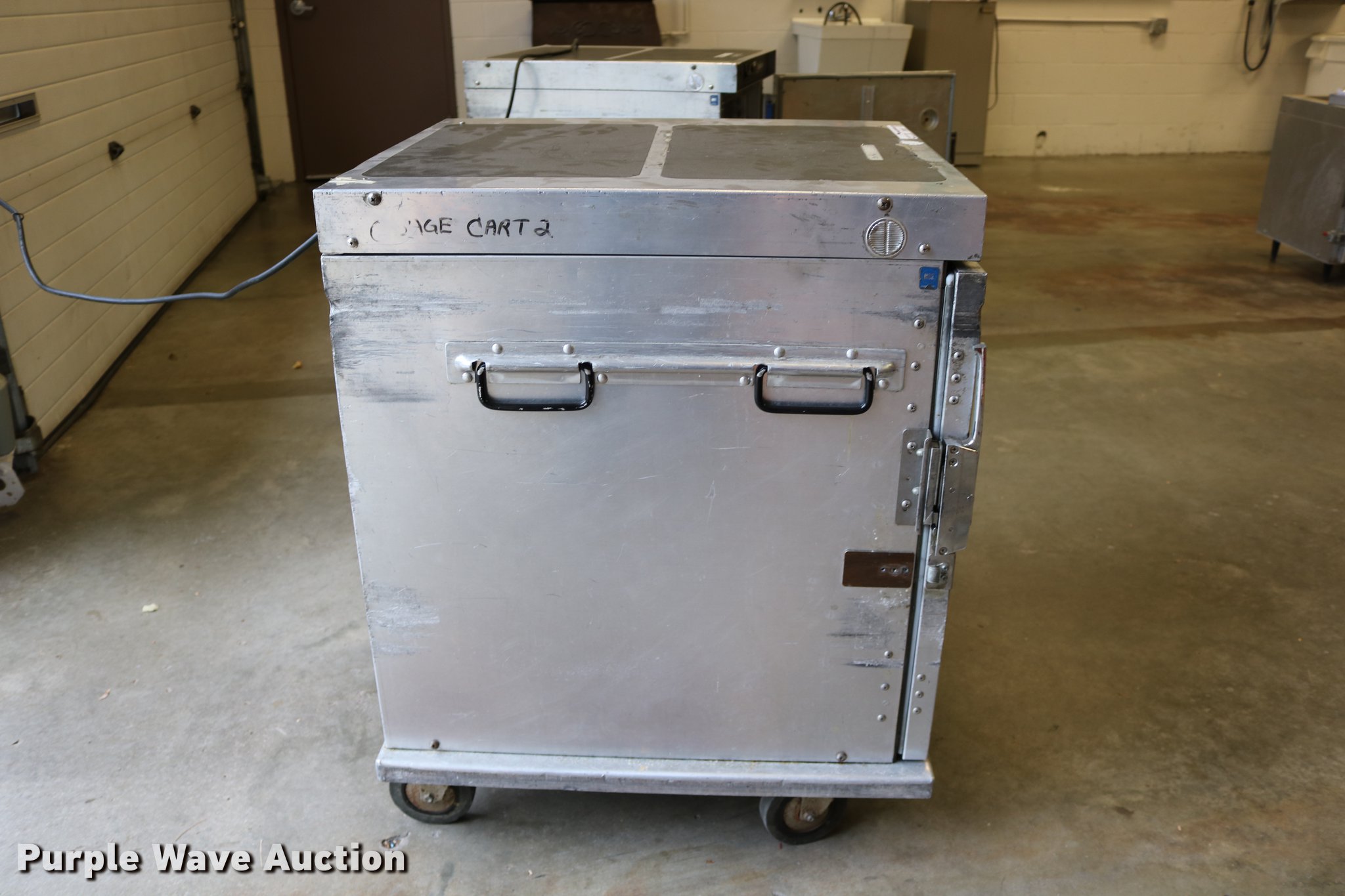 Purple Wave is selling a used Restaurant Equip. in Kansas. This item is a (2) Cres-Cor warmers with the following: Model H-739UA8B, 120V, Single phase, 29.5" x 27" x 37", One latch broken, One dial broken, Caster wheel missing