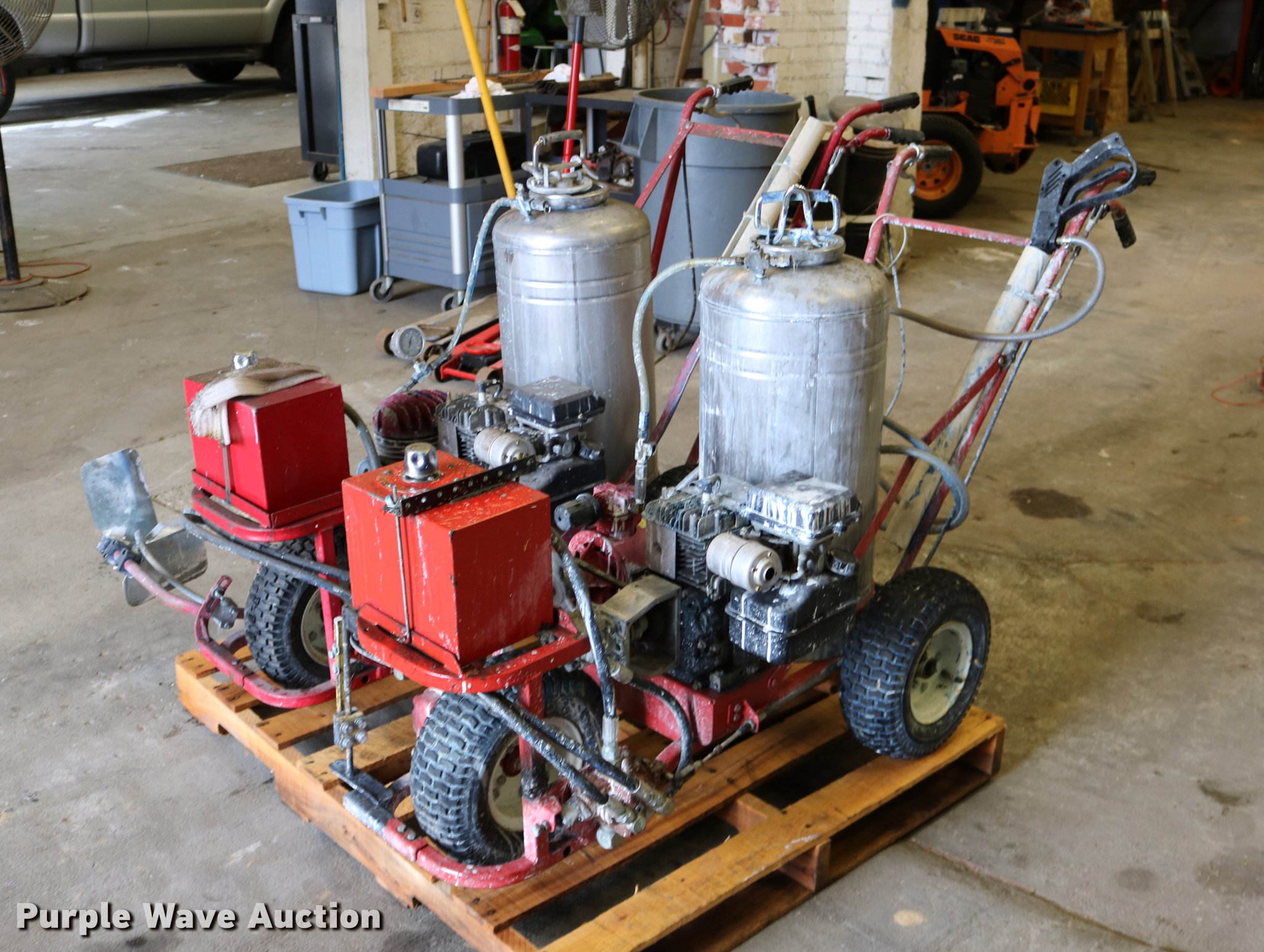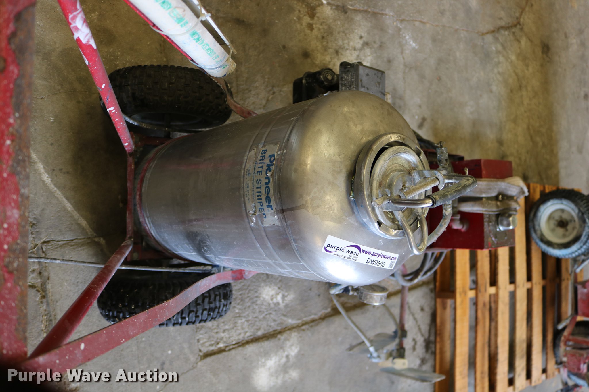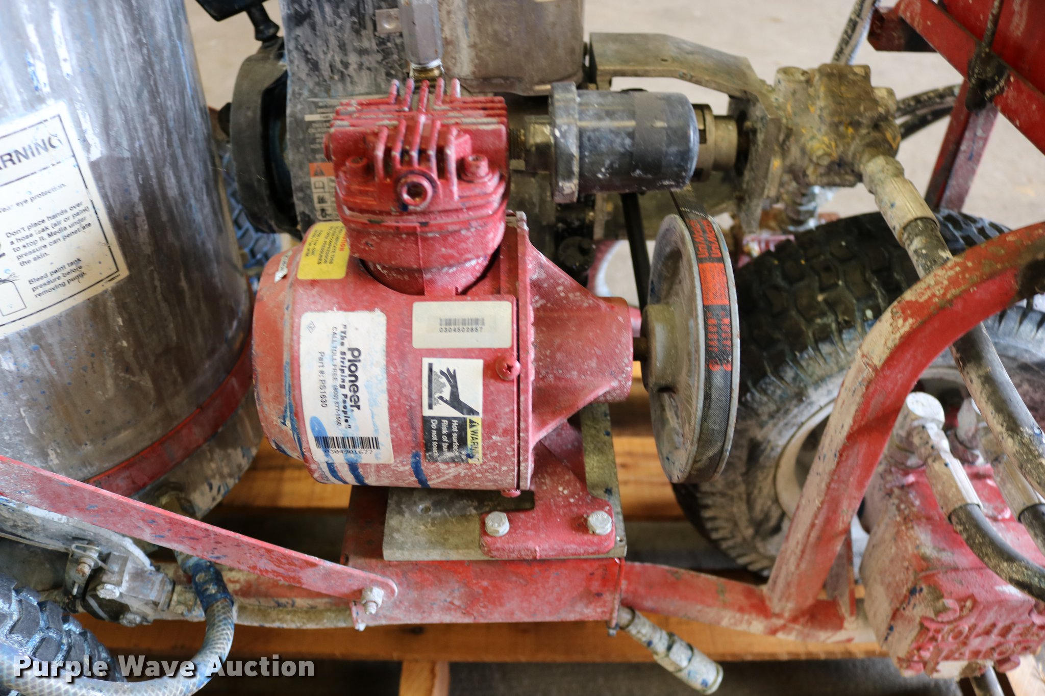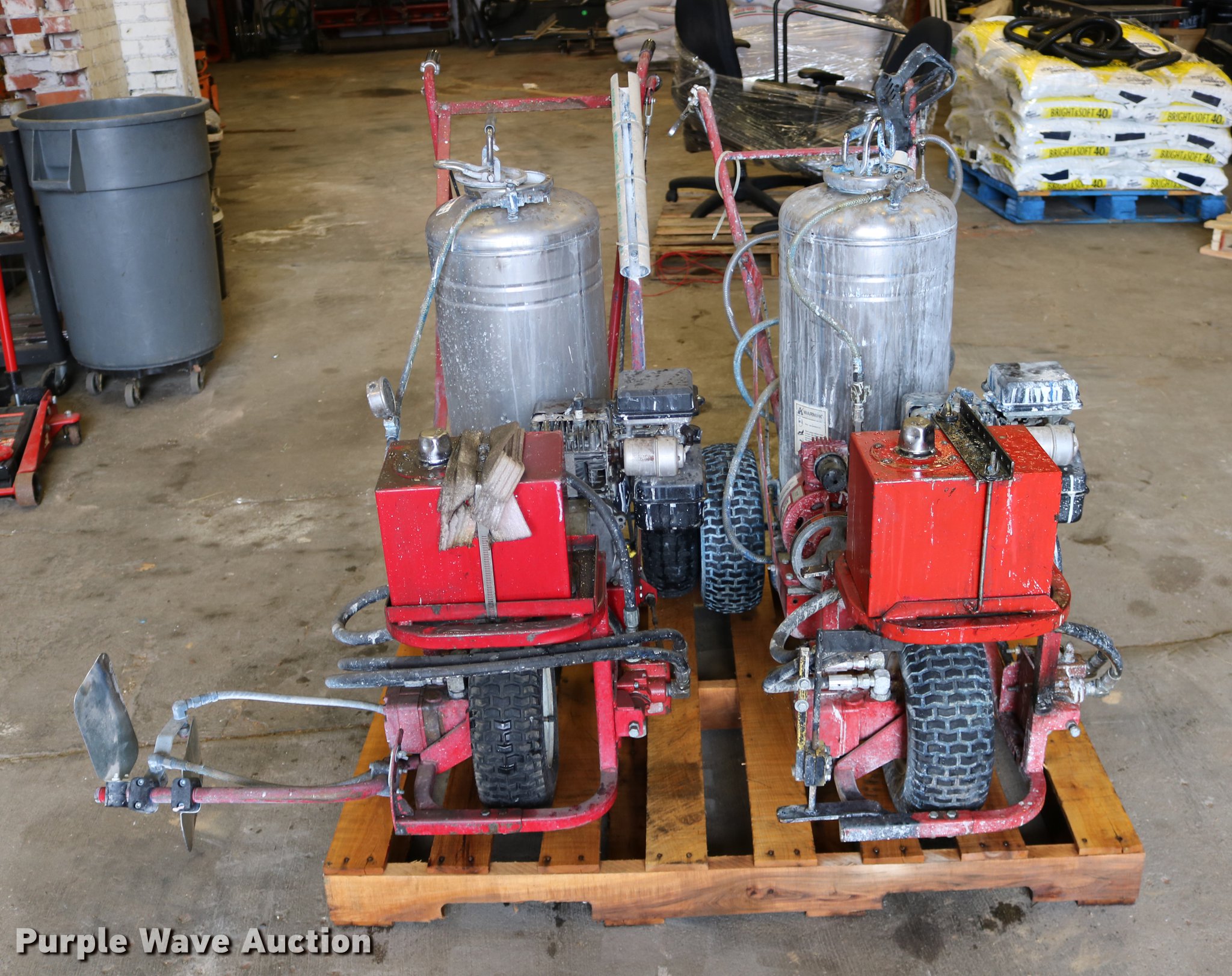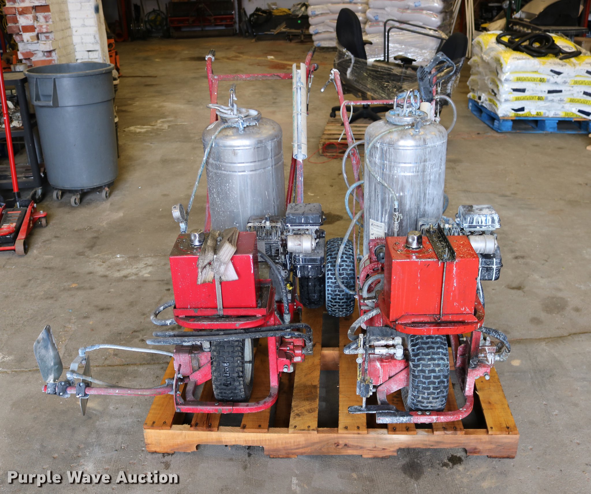 (2) Pioneer Brite Striper field stripers. Hydrostatic front wheel drive, One hand wand, One side extension, (3) 13x5.00-6 tires, One non-operational unit, parts only, One unknown operating condition. USD 453. 714 Lawrence Ave. Leavenworth, KS 66048