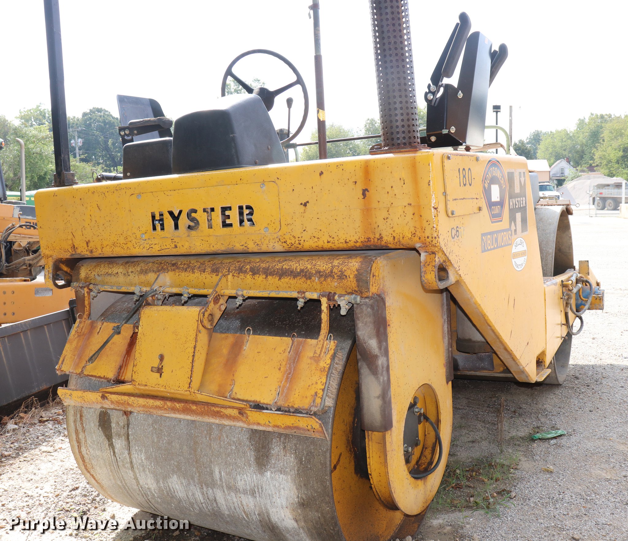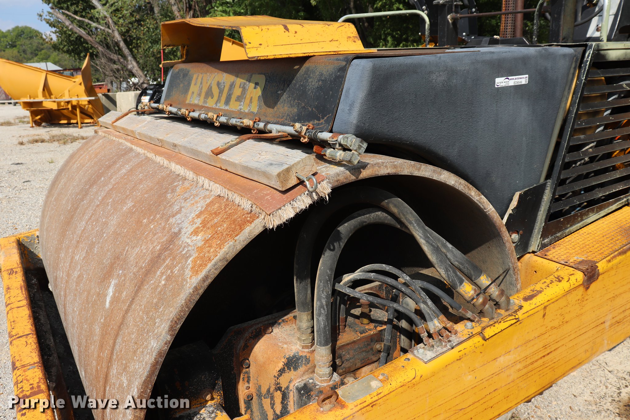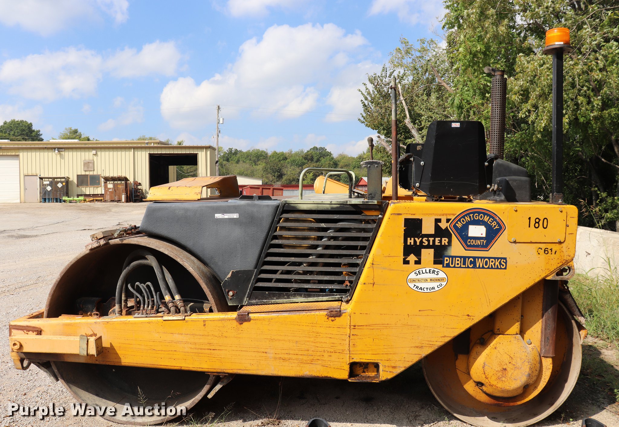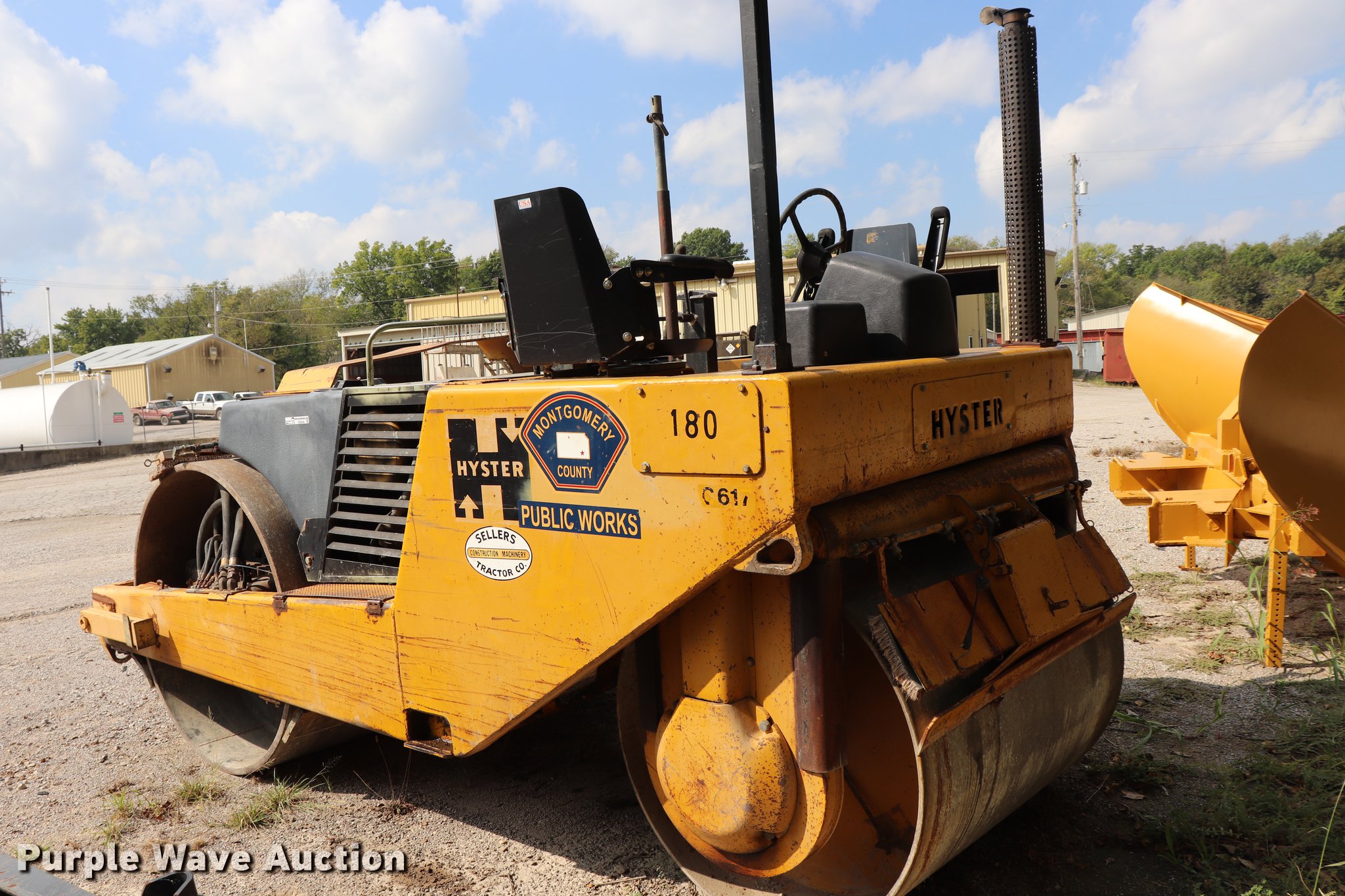 Hyster double drum roller. 2,309 hours on meter, Detroit Diesel four cylinder diesel engine, Hydrostatic transmission, Suspension seat, Vandal cover, Dual operators stations, Single vibratory system, 72"W x 48" diameter smooth front drum, 50"W x 40" diameter smooth rear drum, Front and rear drum scrapers, Front and rear water spray applicator, Drive motor inoperable, Serial B1660-1529-Y. Transfer of ownership documentation will be a bill of sale. Montgomery County. 800 E Myrtle St. Independence, KS 67301