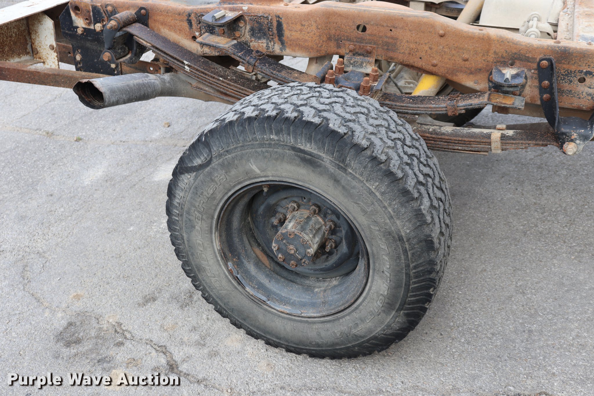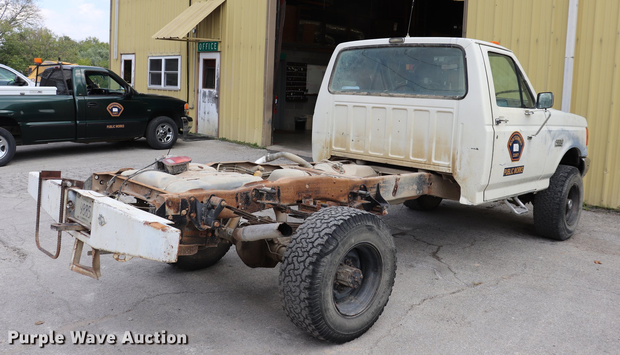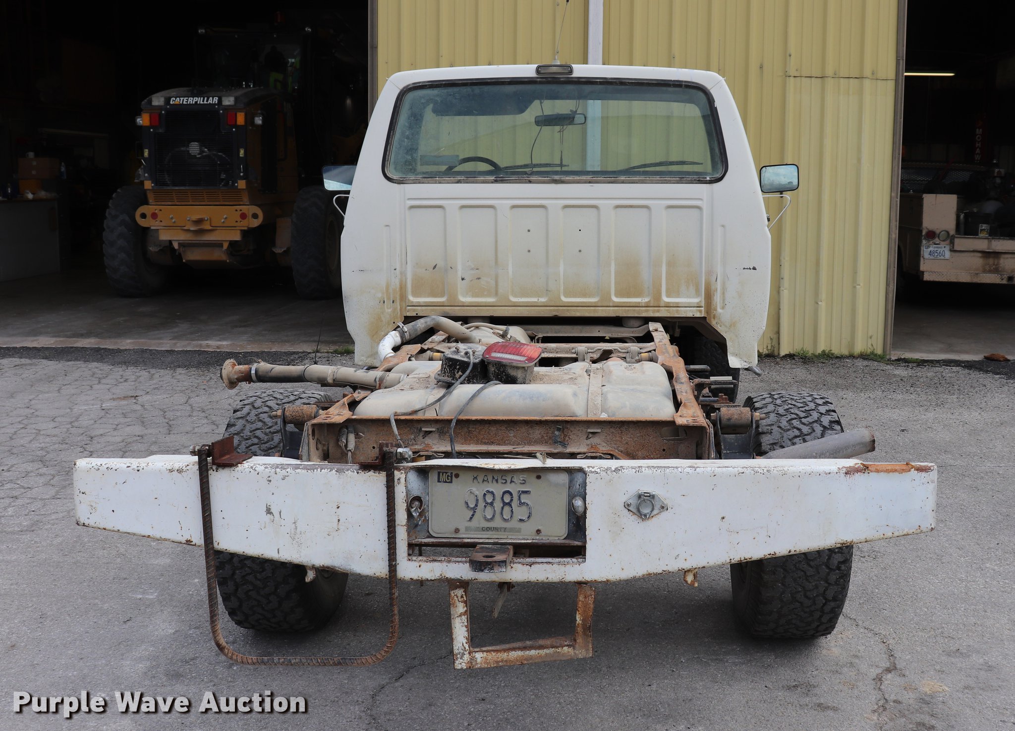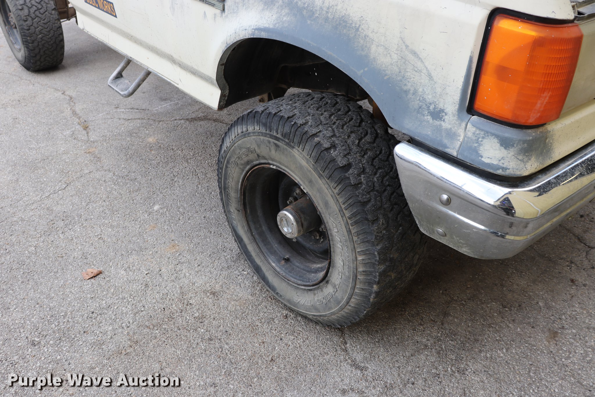 1990 Ford F350 pickup truck. 25,336 miles on odometer, 3,827 hours on meter, 7.3L V8 OHV 16V diesel engine, Five speed manual transmission, Four wheel drive, AC and heat, AM/FM/cassette, Manual windows and locks, Vinyl interior, Block heater, Dual fuel tanks, Pin hitch, 33x12.50R16.5 tires, Cracked windshield. Kansas title. 1FDHF38M6LKA41800. Montgomery County. 800 E Myrtle St. Independence, KS 67301