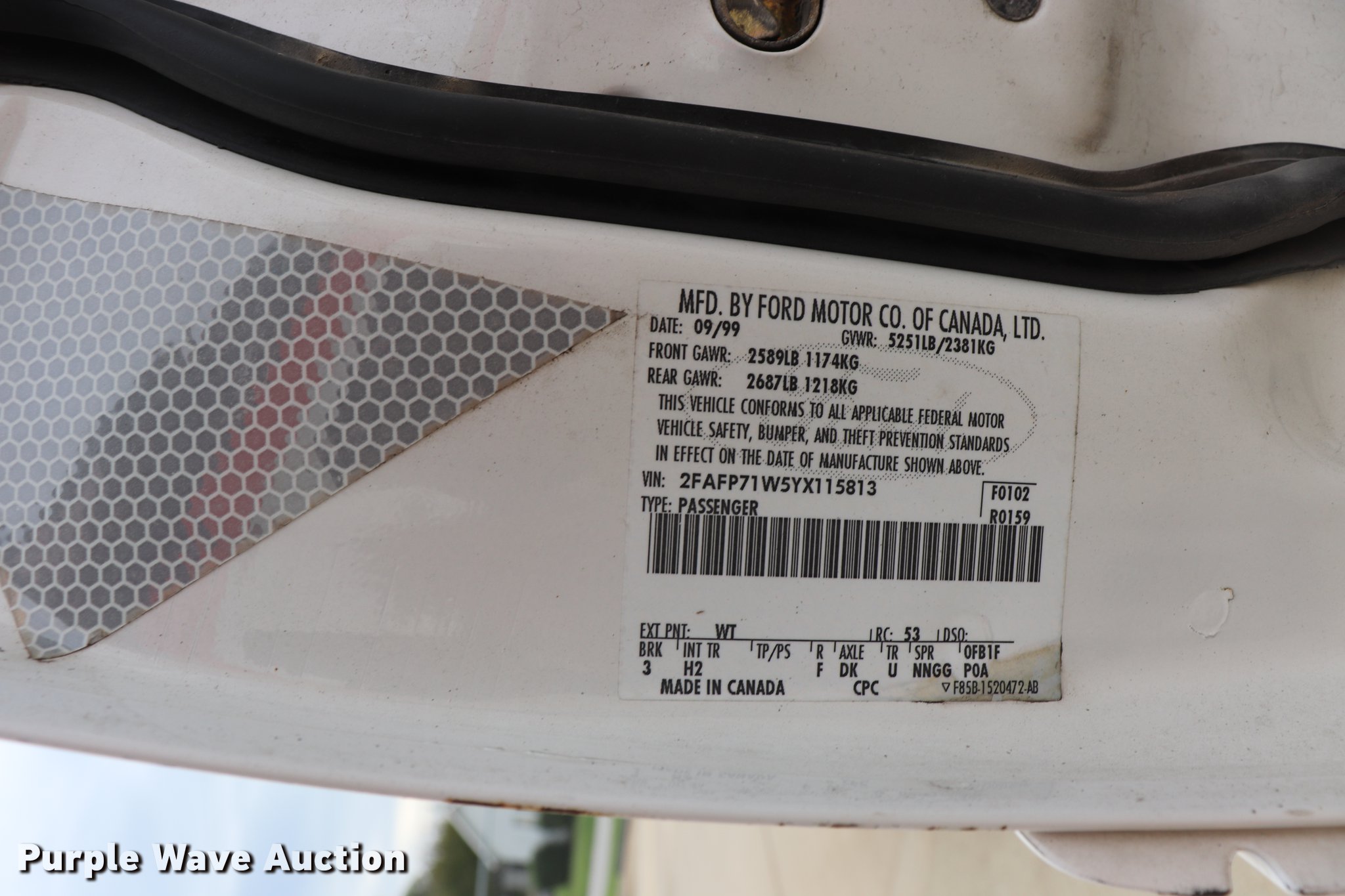 Purple Wave is selling a used Passenger Vehicle in Kansas. This item is a 2000 Ford Crown Victoria with the following: 228,145 miles on odometer, 4.6L V8 SOHC 16V gas engine, Automatic transmission, AC and heat, Tilt, Cruise, AM/FM, Power windows, locks, mirrors, and seats, Cloth interior, 225/60R16 tires, Hole in muffler, Key stuck in ignition