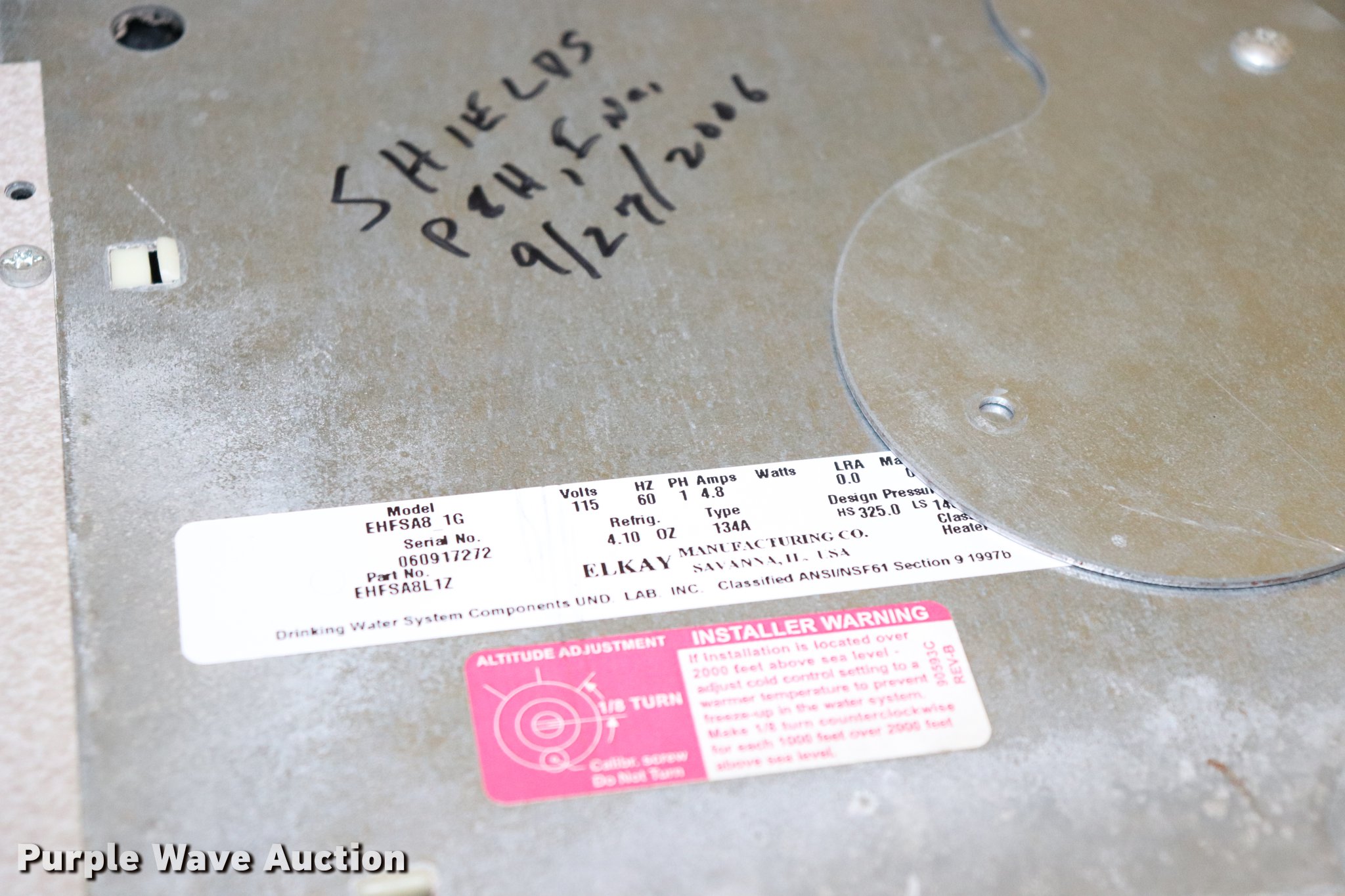 Purple Wave is selling a used Restaurant Equip. in Kansas. This item is a Elkay water fountain with the following: Model EHFSA8, Serial 060917272