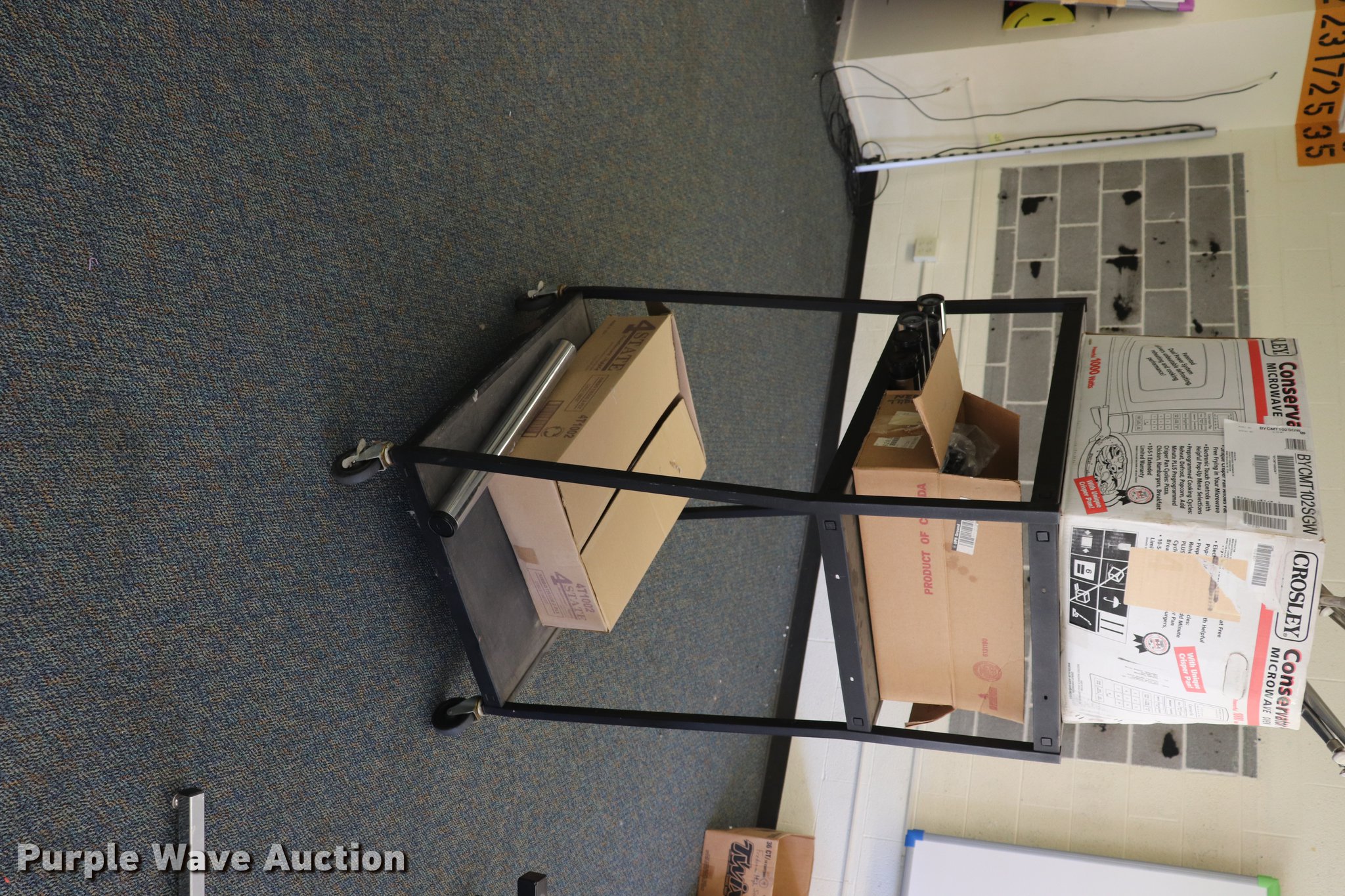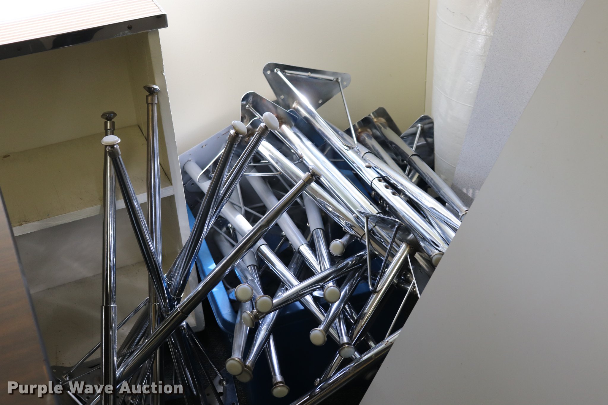 Purple Wave is selling a used Furniture in Kansas. This item is a Approximately 20 tables with the following: Various sizes, 54" x 54", 53" x 53", 74" x 54" and more, Cart