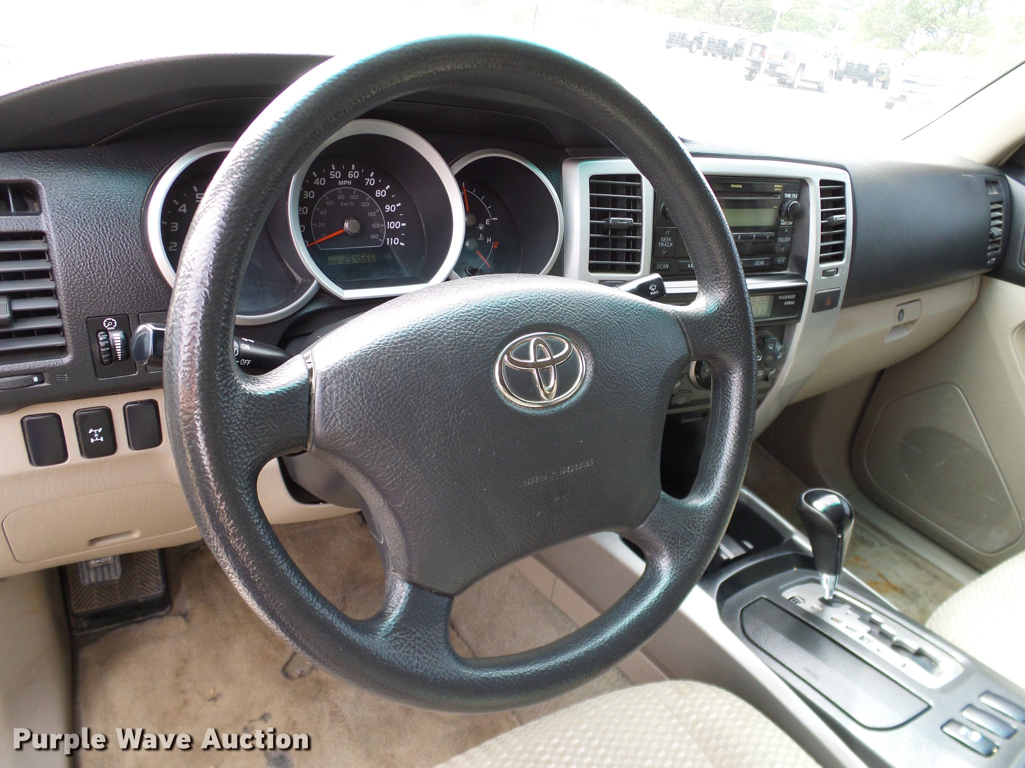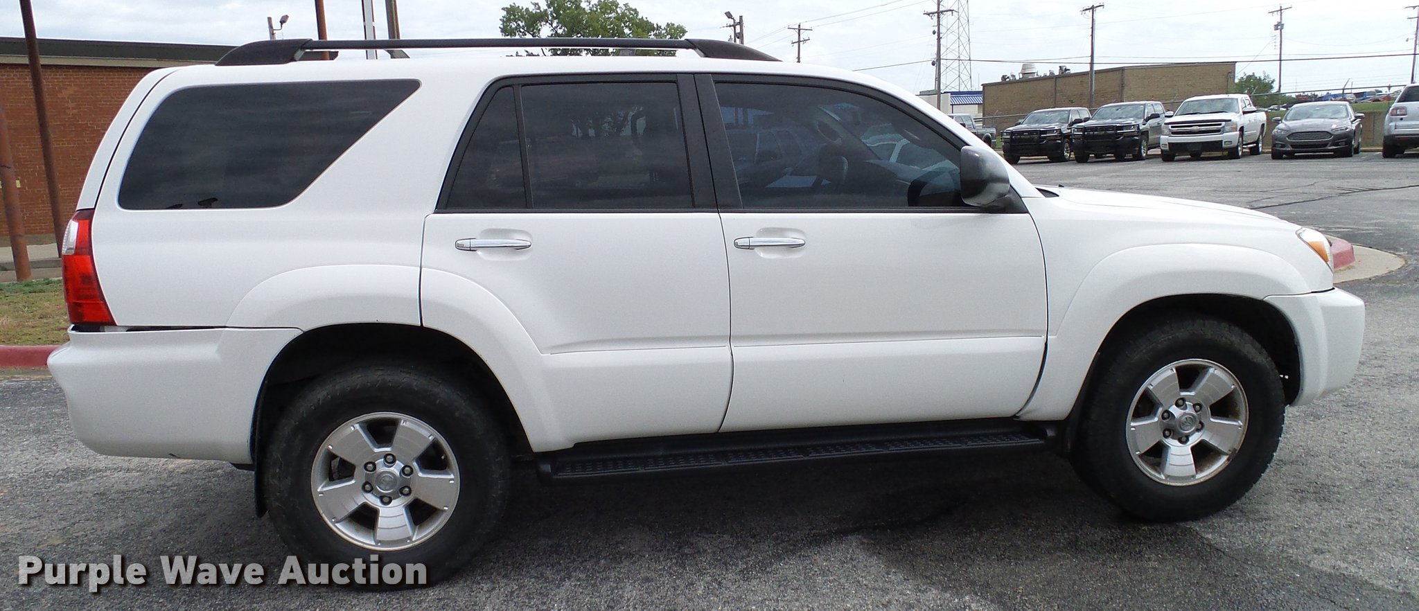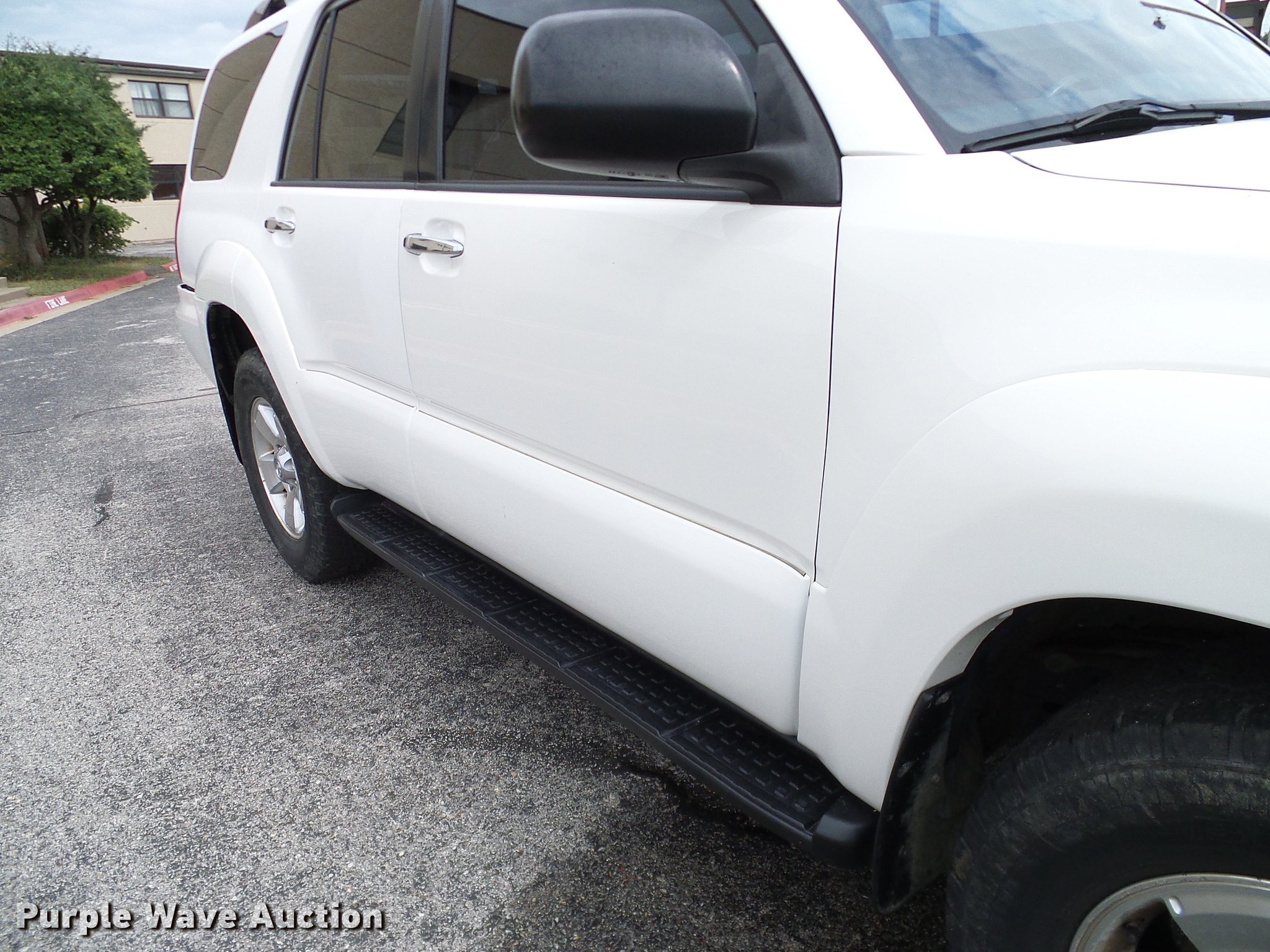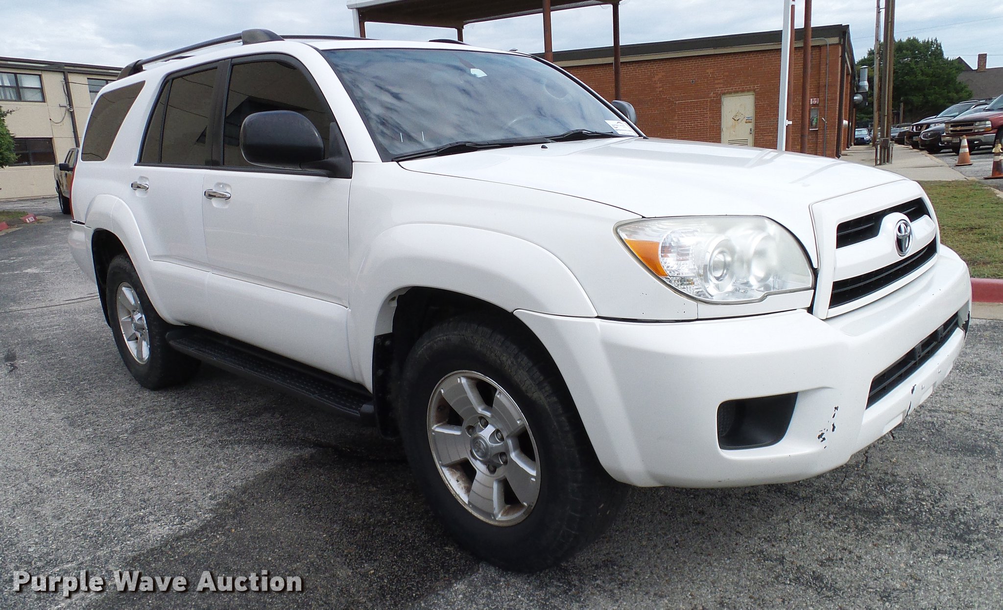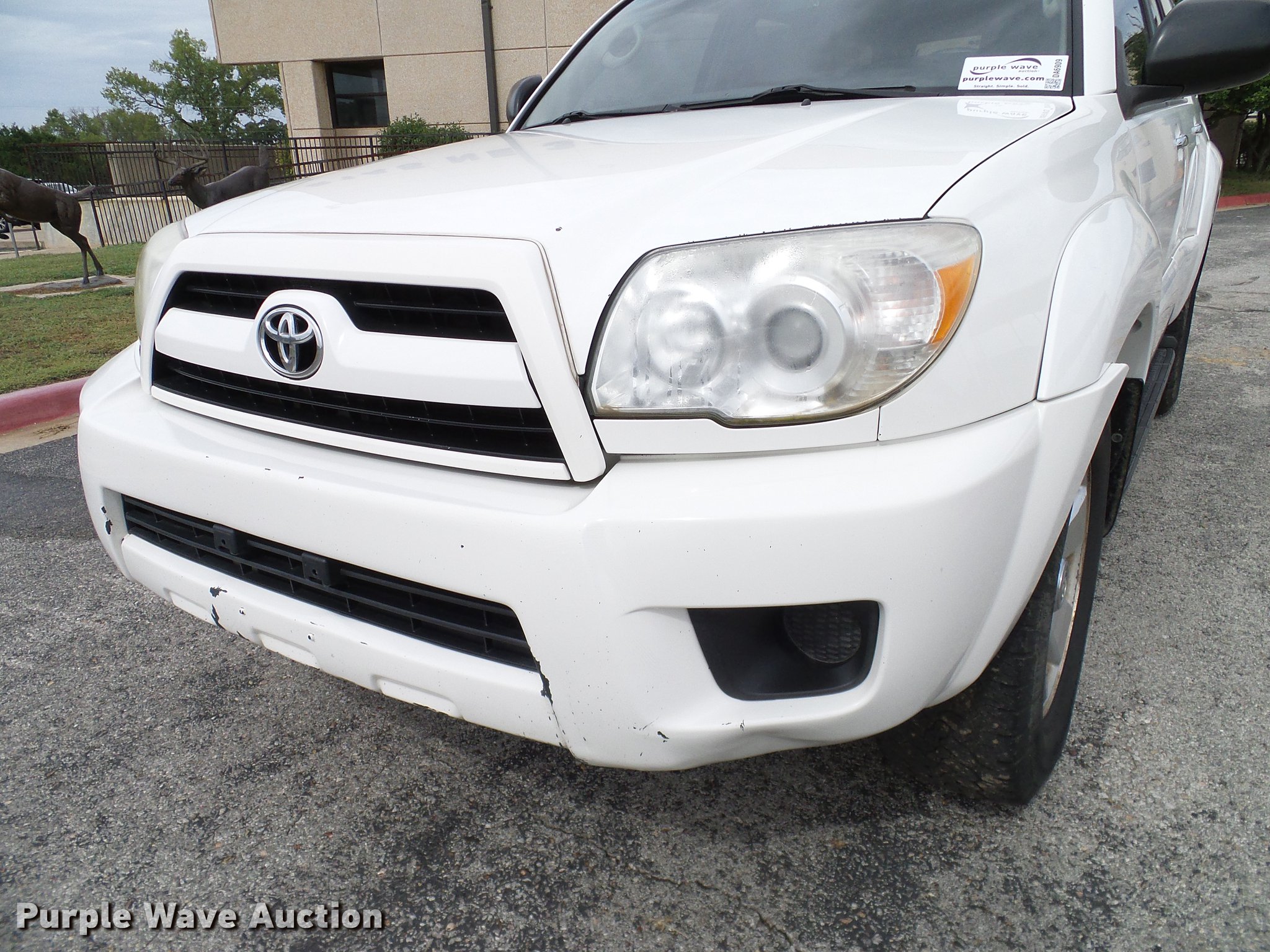Purple Wave is selling a used Passenger Vehicle in Oklahoma. This item is a 2006 Toyota 4Runner SR5 SUV with the following: 254,565 miles on odometer, 4.0L V6 DOHC 24V gas engine, Automatic transmission, Four wheel drive, AC and heat, Tilt, Cruise, AM/FM/CD, Power windows, locks, and mirrors, Cloth interior, Running boards, Receiver hitch, 265/70R17 tires, Cracked windshield, Left taillight broken