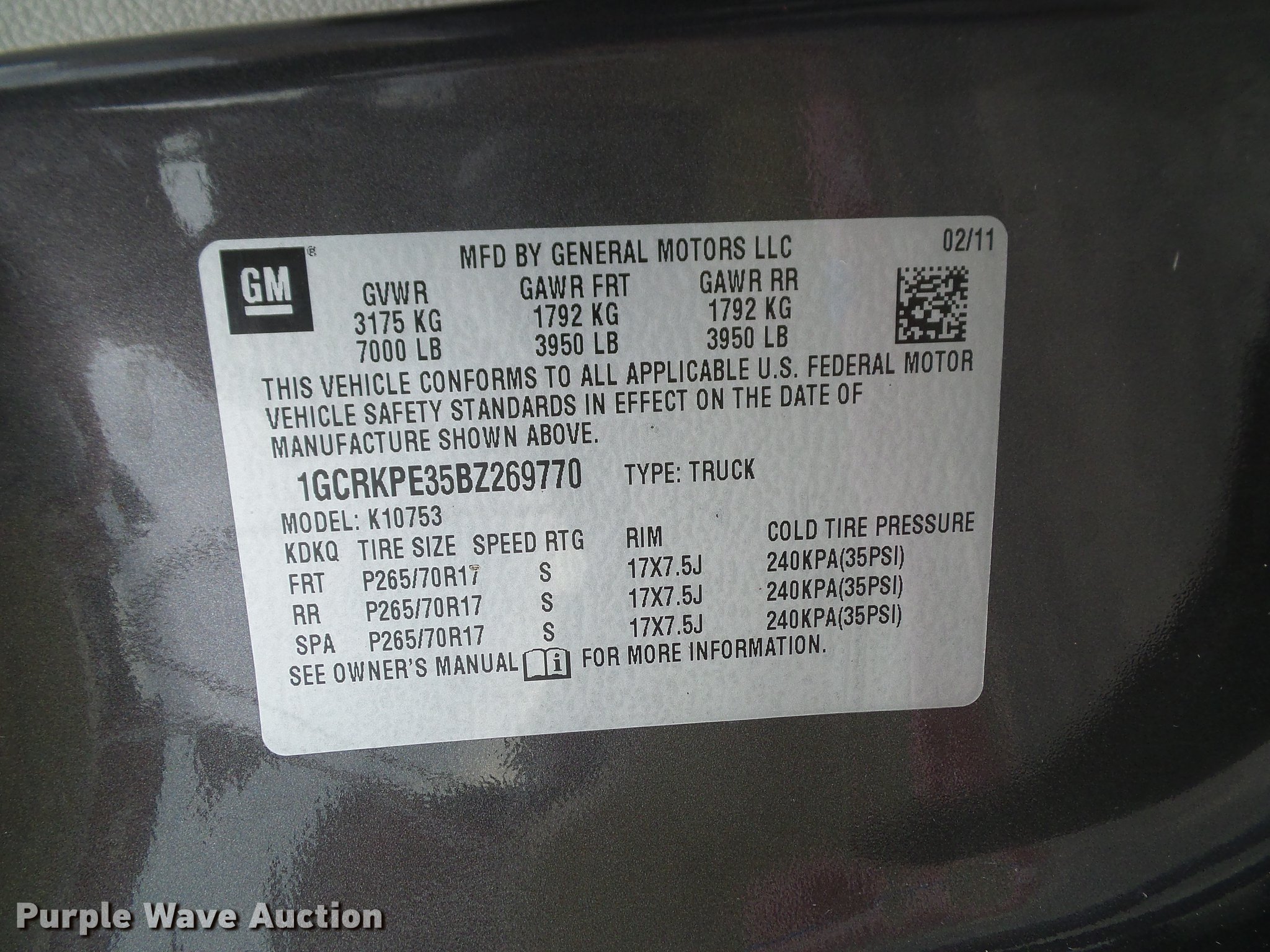 Purple Wave is selling a used 1/2 Ton Pickup or Van in Oklahoma. This item is a 2011 Chevrolet Silverado 1500 Ext. Cab pickup truck with the following: 137,541 miles on odometer, 5.3L V8 OHV 16V FFV gas engine, Automatic transmission, Four wheel drive, AC and heat, Tilt, AM/FM, Power windows, locks, and mirrors, Vinyl interior, Spotlight, Front tow hooks, Grill guard, Receiver hitch, Trailer wiring, 265/70R17 tires