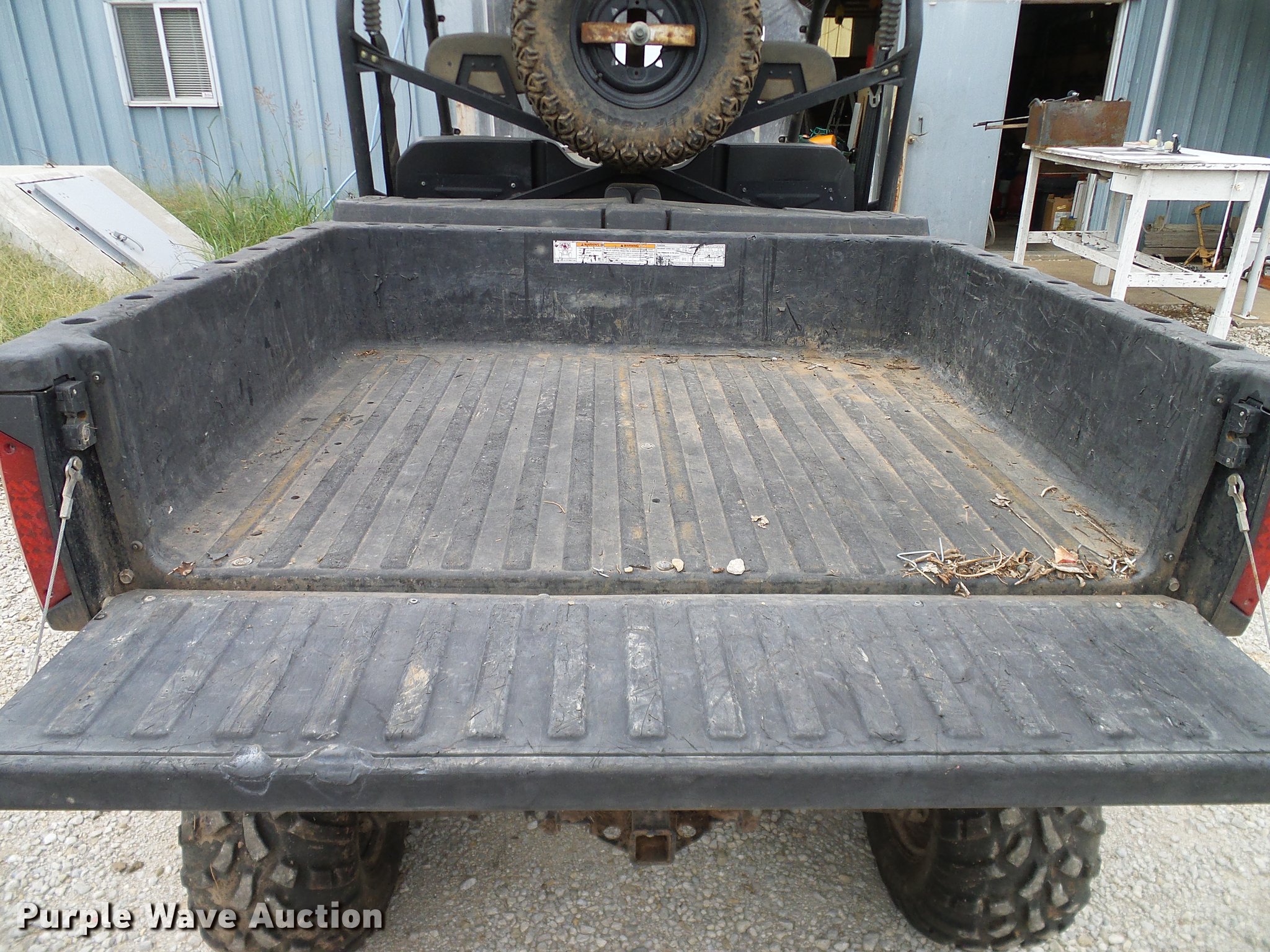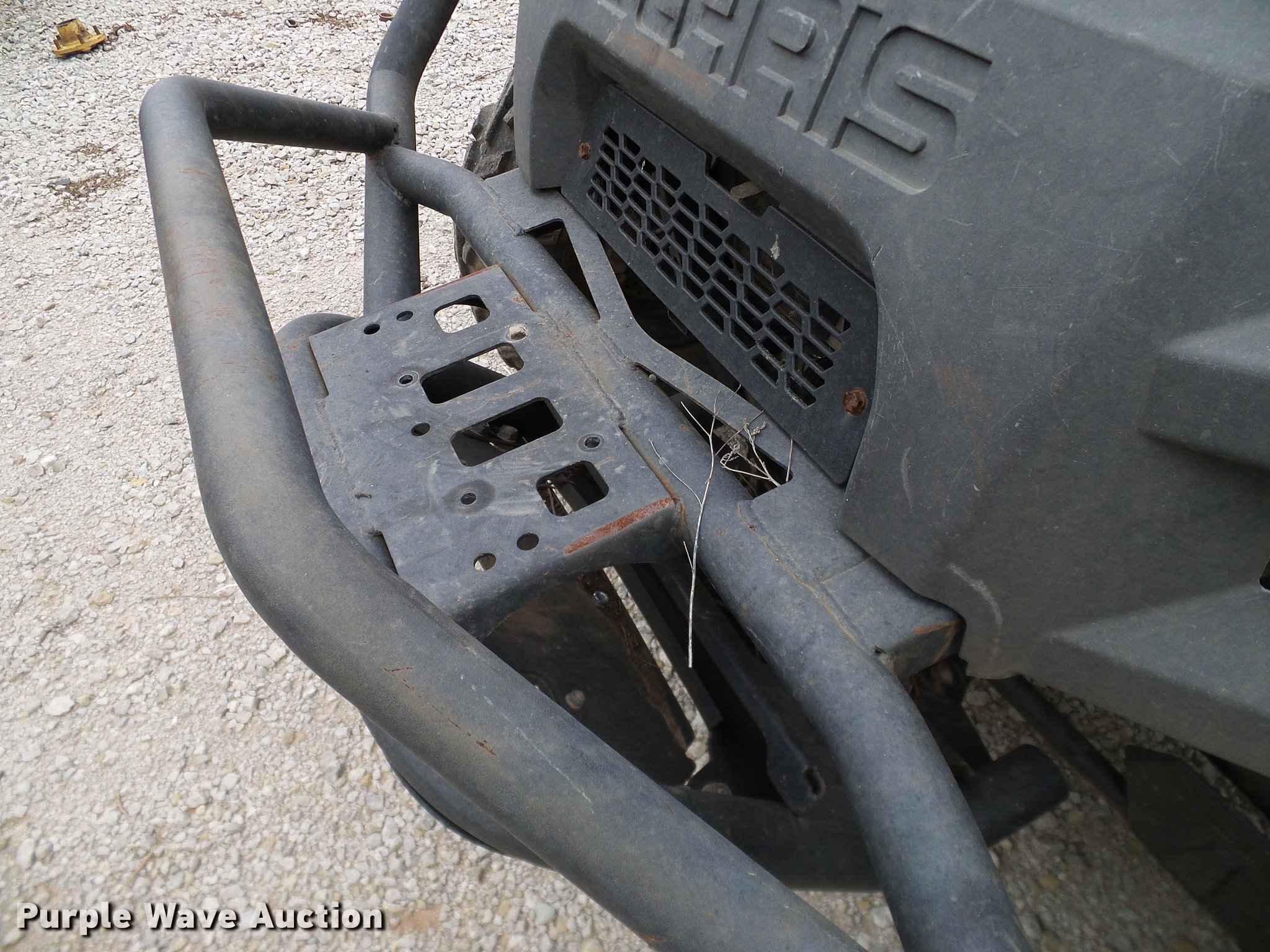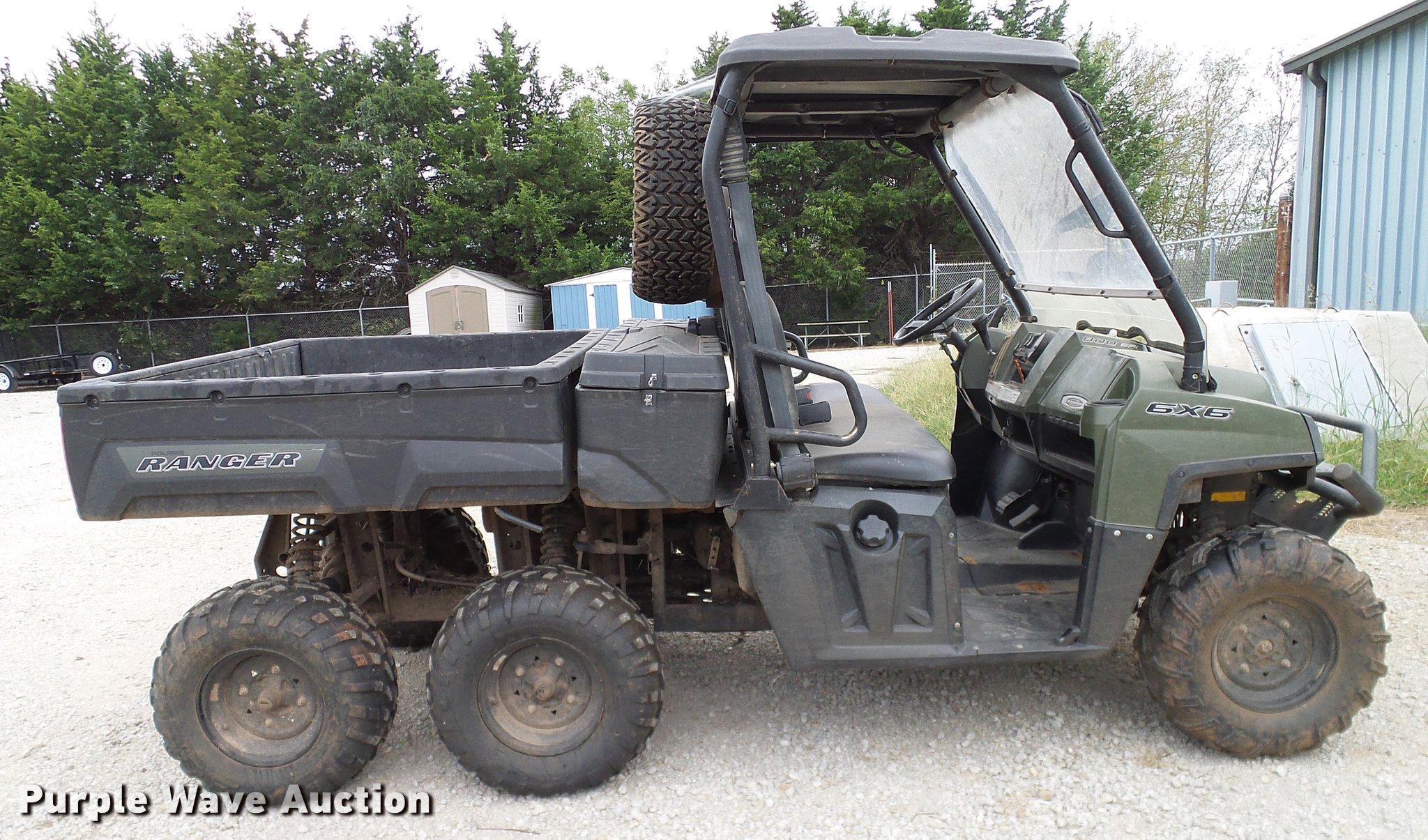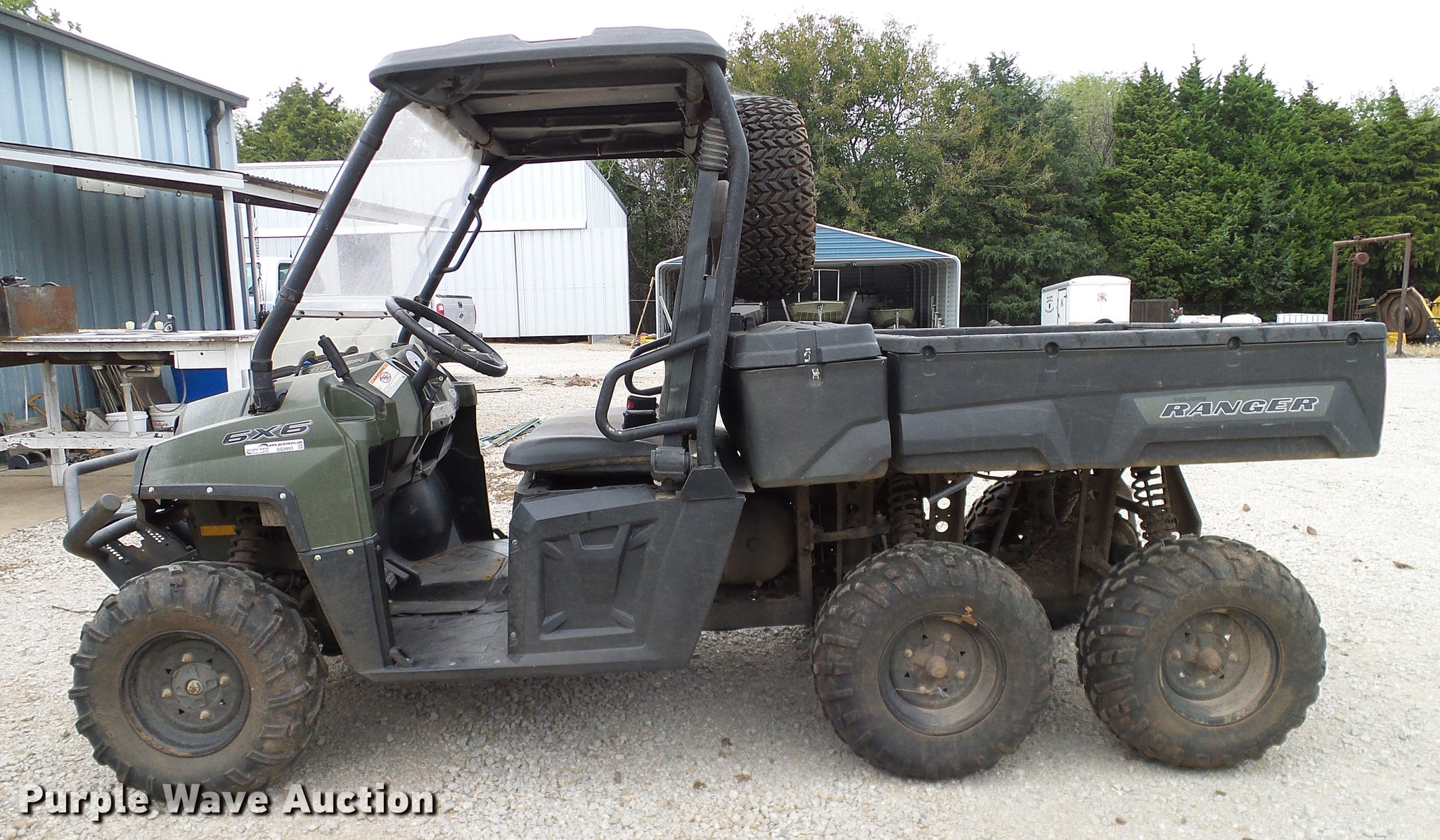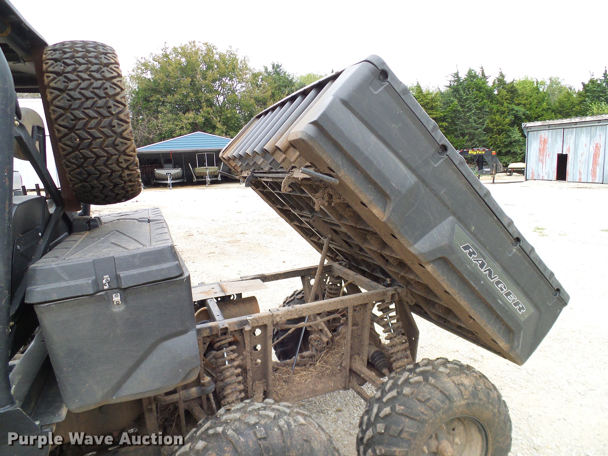 Purple Wave is selling a used Utility Vehicle in Oklahoma. This item is a 2012 Polaris Ranger 800 utility vehicle with the following: 1,177 miles on odometer, 240 hours on meter, Polaris 800 EFI two cylinder gas engine, Hydrostatic transmission, 2F-1R gears, Six wheel drive, OROPS canopy, Grill guard, Toolbox, Manual dump bed, Receiver hitch, 25x10.00-12 front tires, 25x11.00-12 rear tires, Non-operational transmission
