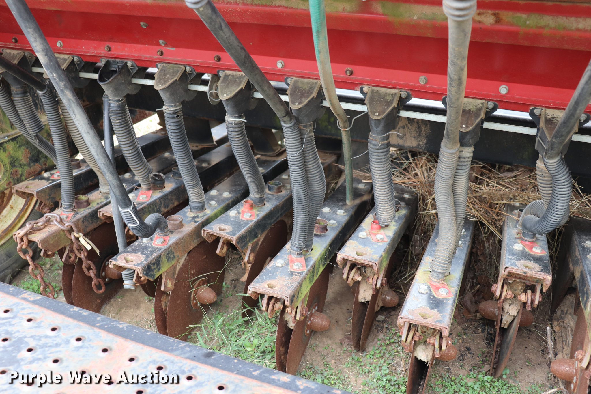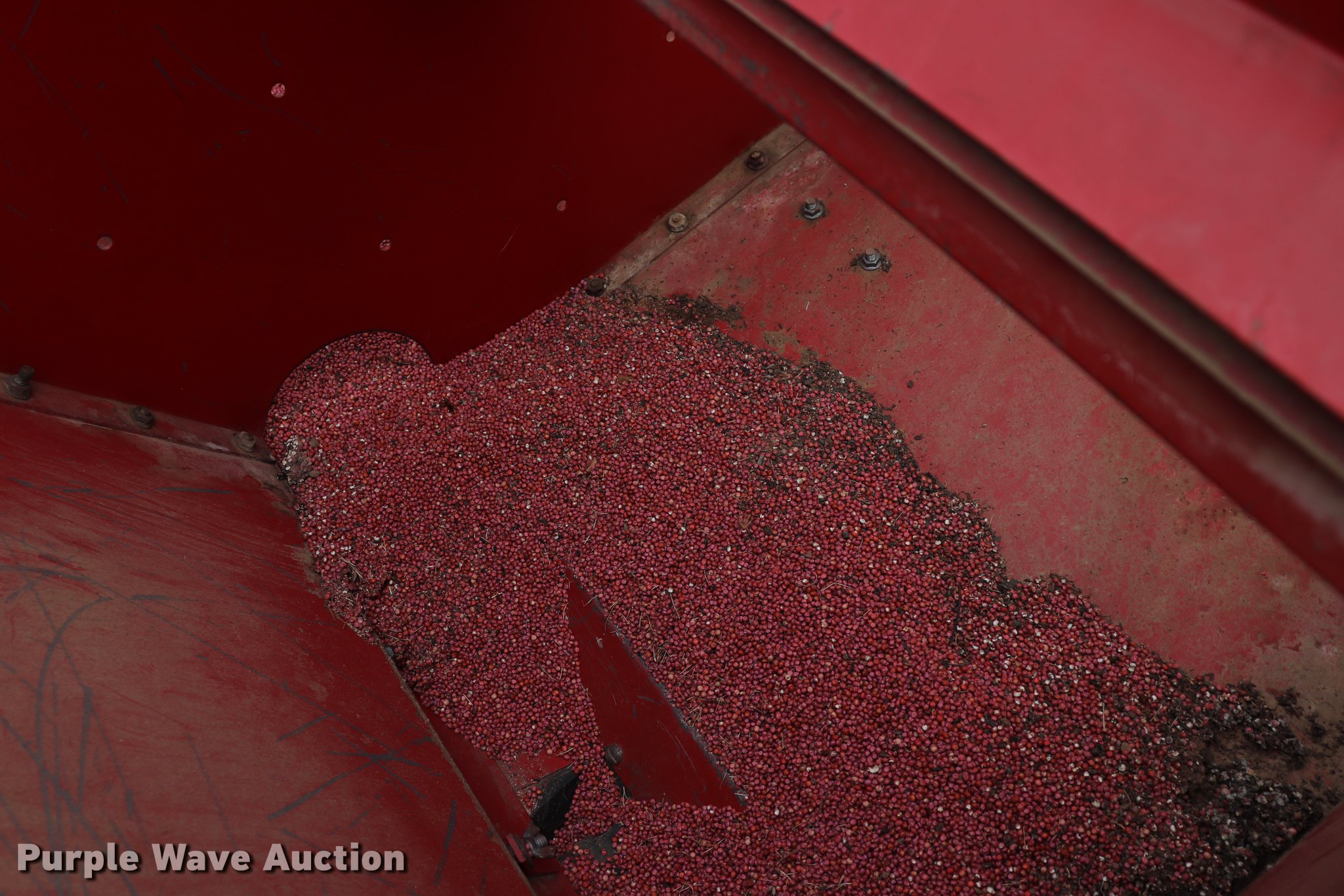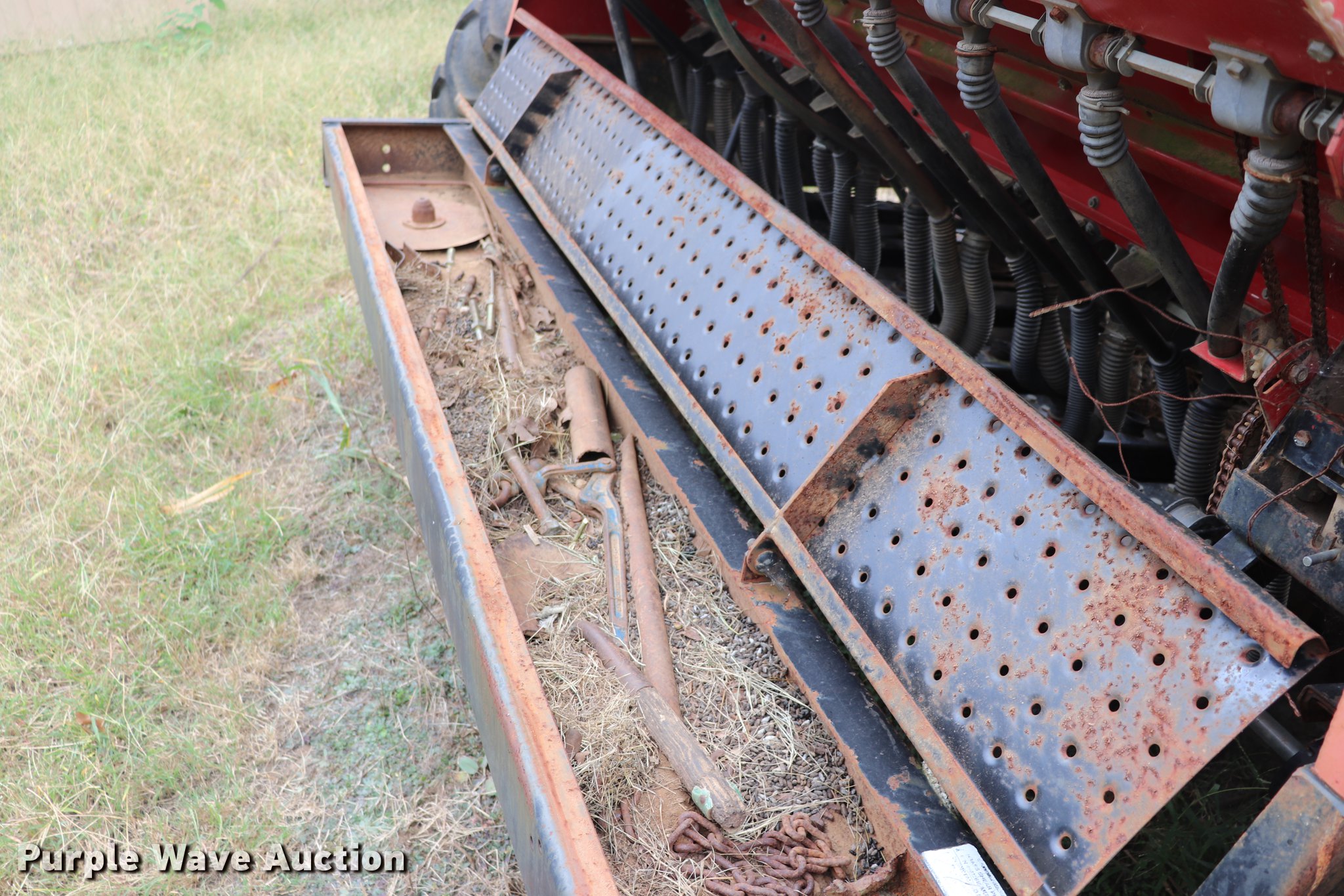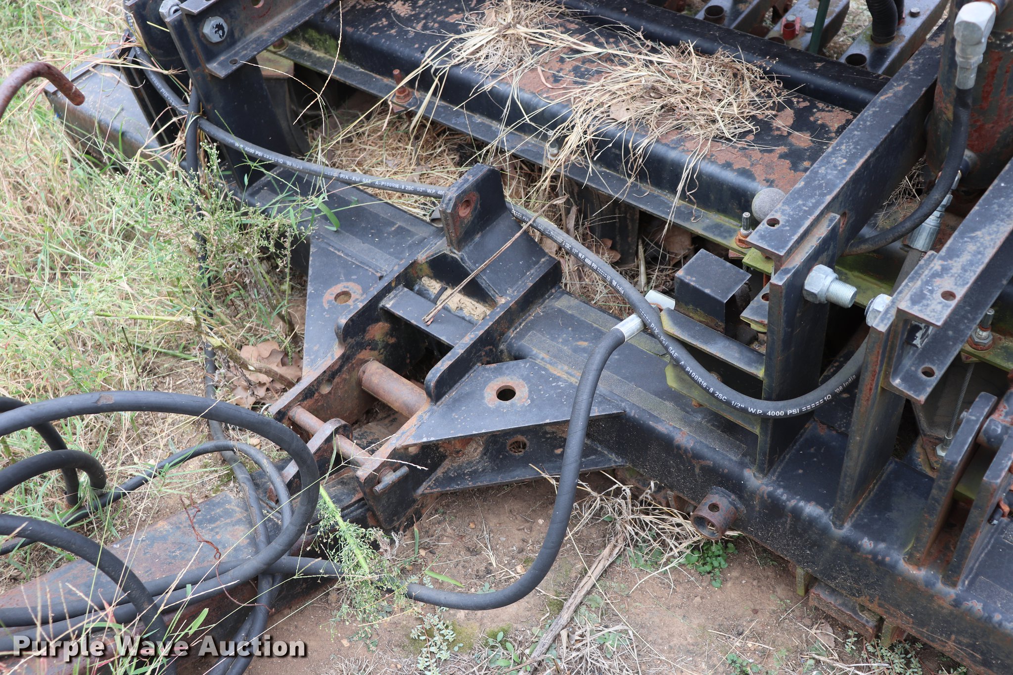 Bush Hog grain drill. 13 row units, 7.5" row spacing, Bulk fill system, Double disk openers, Hydraulic lift, Pin hitch, Single leg landing jack, (2) 12.4-24 transport tires, One row unit missing, Seed tubes and Brojen missing, Disk openers missing, Unknown operating condition. Oklahoma Department of Wildlife Conservation. 27932 S Burnt Cabin Rd. Tahlequah, OK 74464
