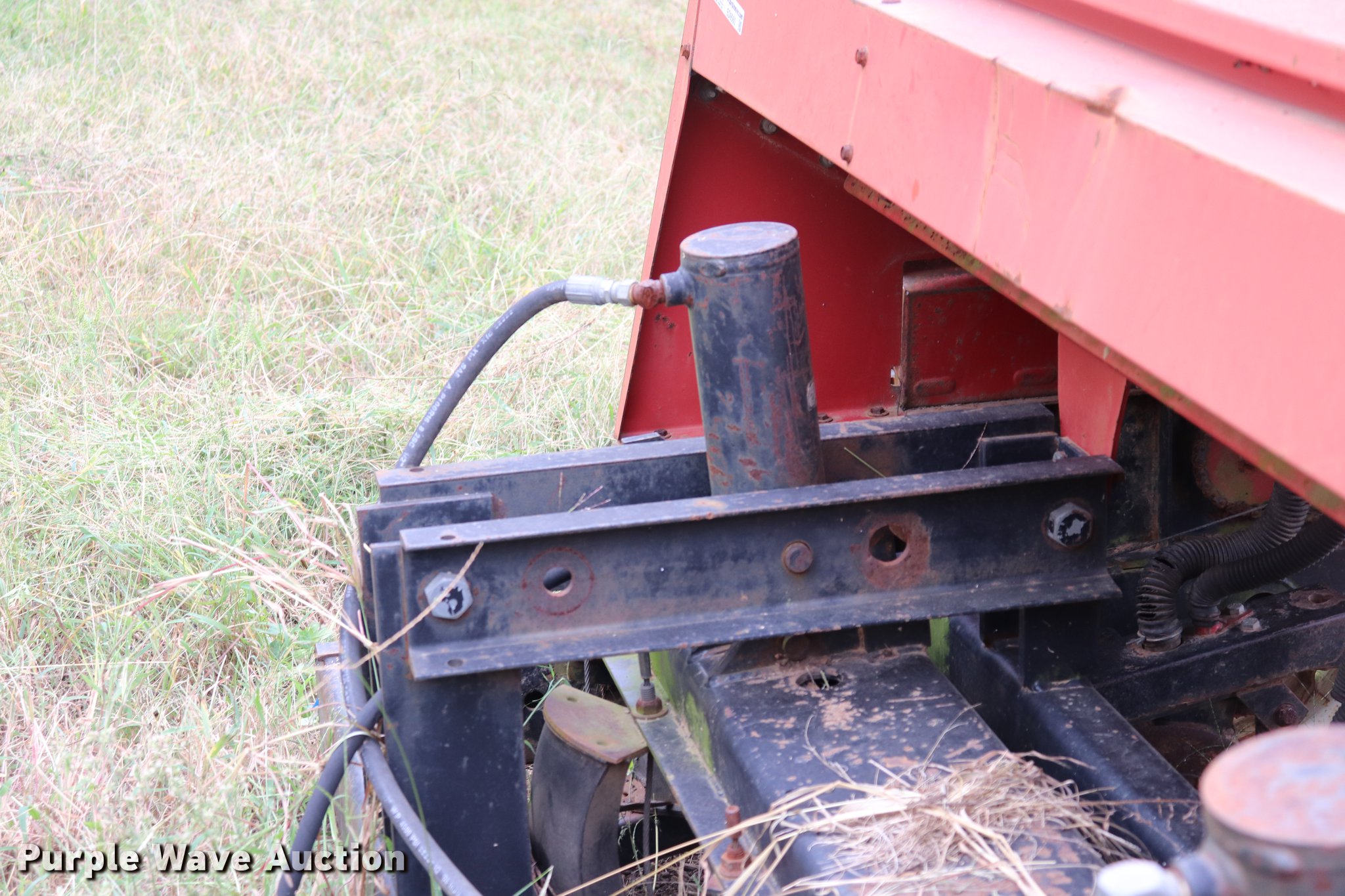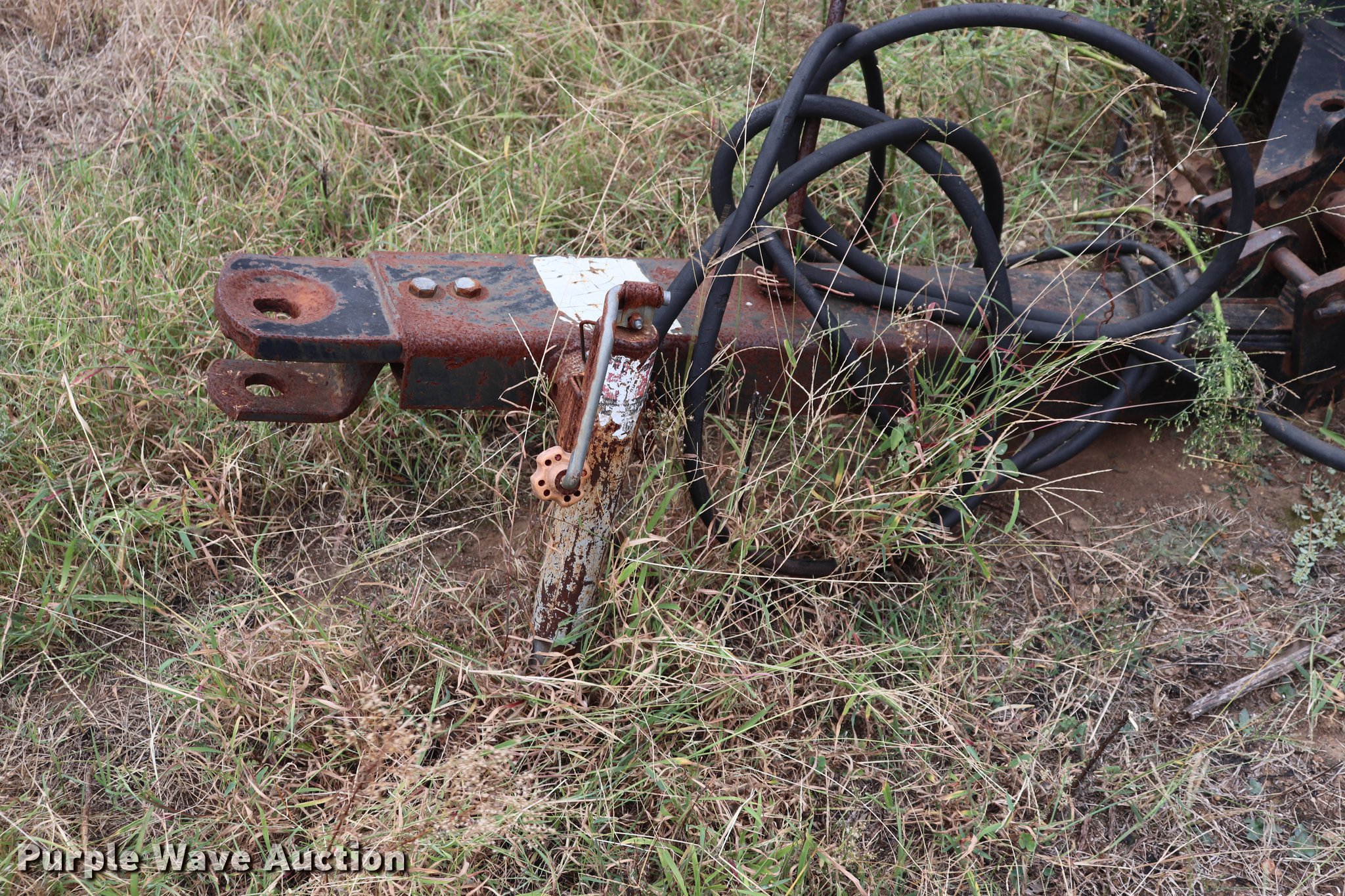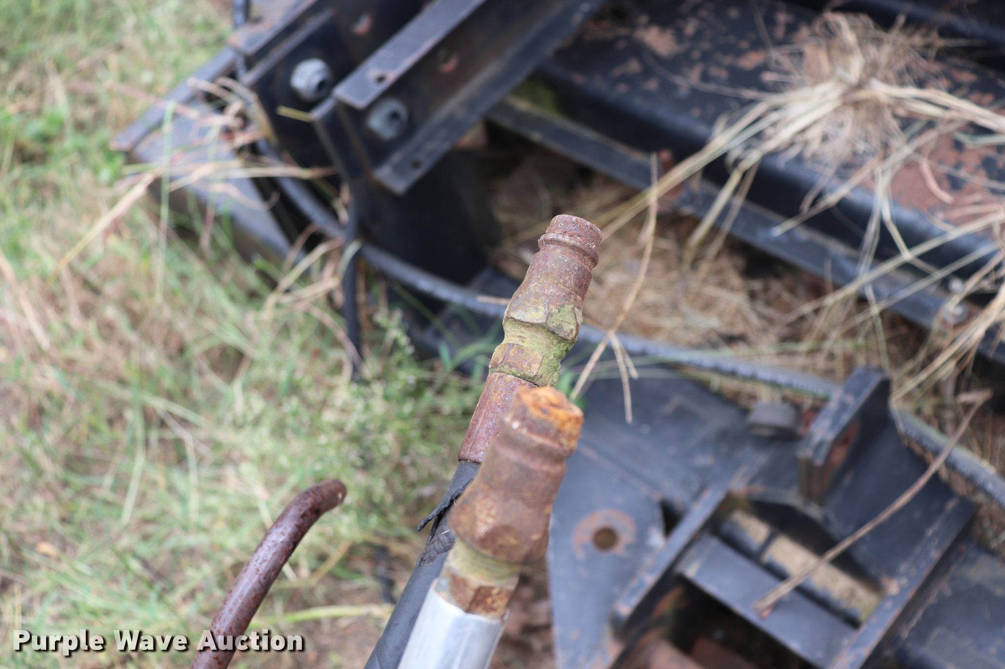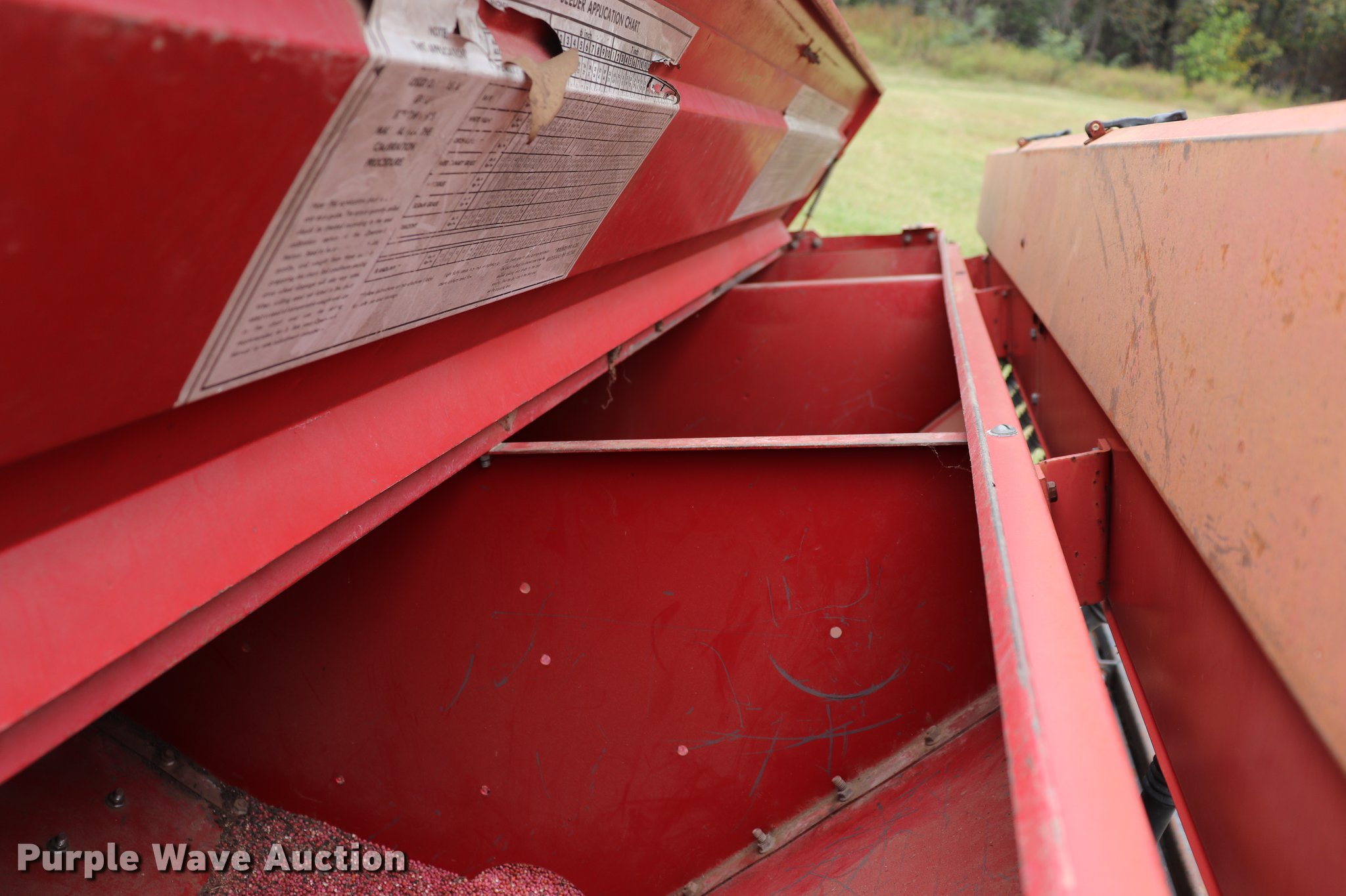 Bush Hog grain drill. 13 row units, 7.5" row spacing, Bulk fill system, Double disk openers, Hydraulic lift, Pin hitch, Single leg landing jack, (2) 12.4-24 transport tires, One row unit missing, Seed tubes and Brojen missing, Disk openers missing, Unknown operating condition. Oklahoma Department of Wildlife Conservation. 27932 S Burnt Cabin Rd. Tahlequah, OK 74464