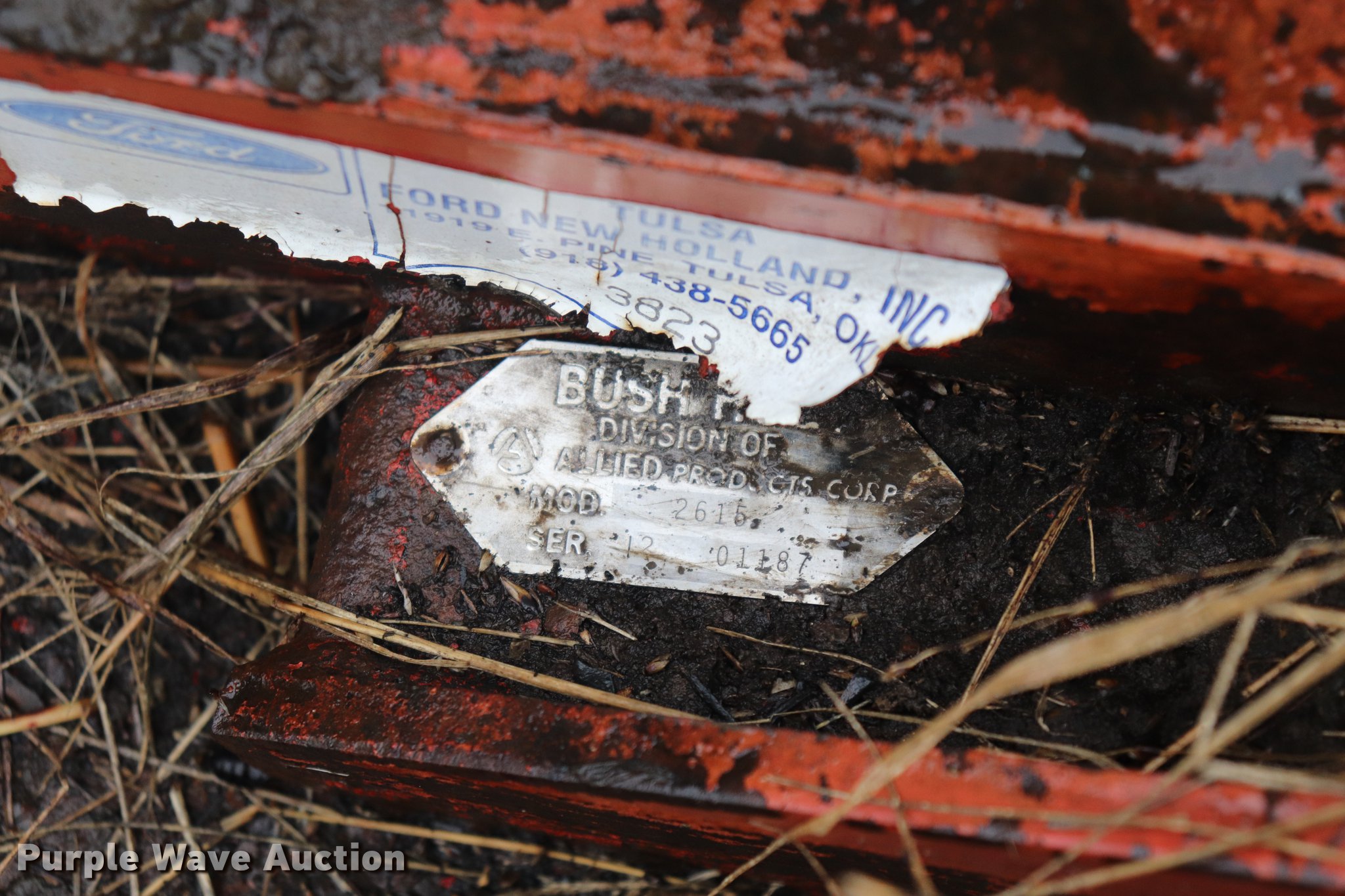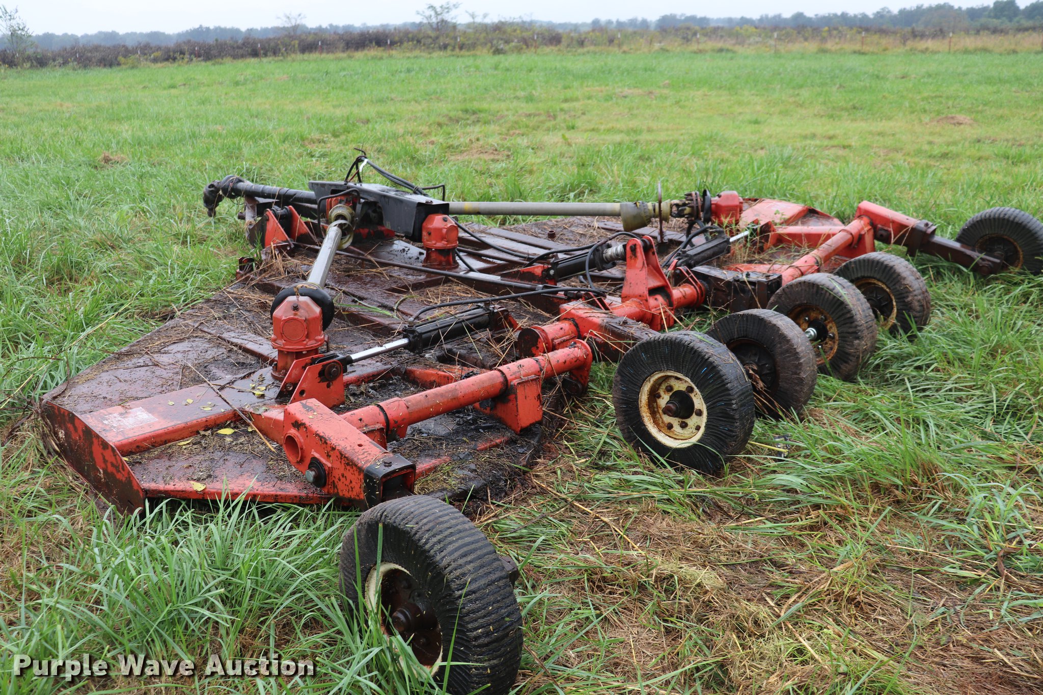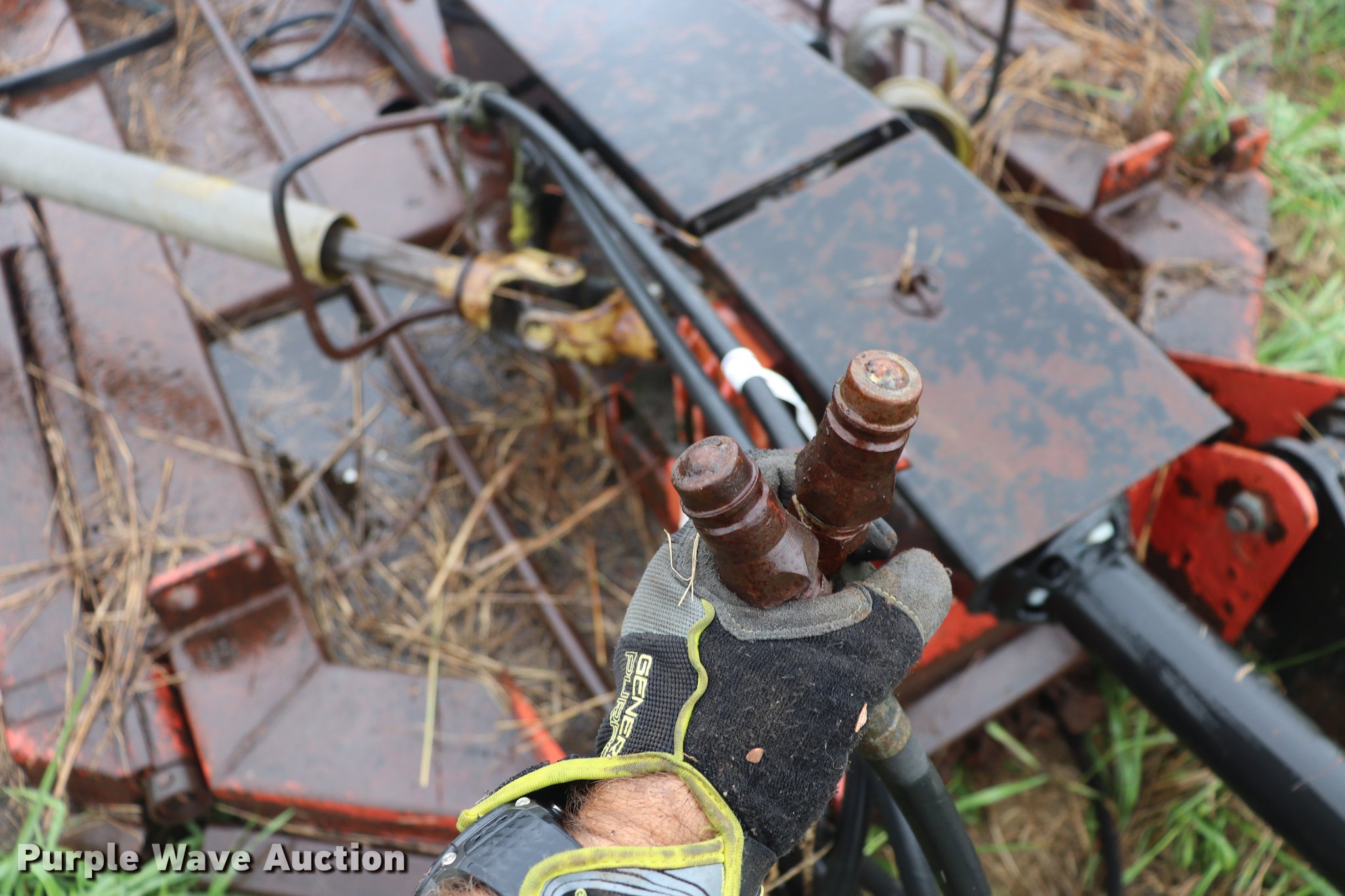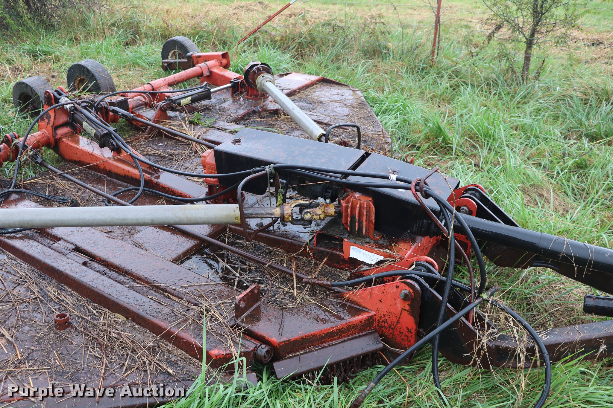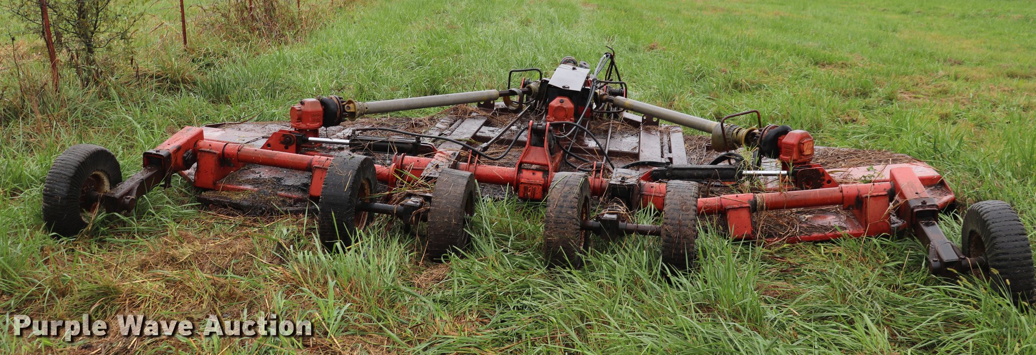 Purple Wave is selling a used Mower, Cutter, Shredder in Oklahoma. This item is a Bush Hog 2615 batwing rotary mower with the following: 15'W, Hydraulic lift and fold, 540 PTO, Pin hitch, Safety chains, (6) 19" solid tires, Unknown operating condition, Serial 1201187