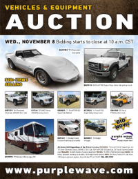 Payments must be made by 4 p.m. CST on the second business day following the auction. Purple Wave reserves the right to charge the credit card on file the total purchase price, $30.00 late payment fee for invoices not paid within our terms. Business hours are Monday through Friday 8 a.m. to 5 p.m CST. Cash and wire transfers (wire instructions) in any amount will be accepted. Checks up to $10,000.00 will be accepted without a bank guaranty letter. Checks of $10,000.00 or greater will be accepted only with a bank guaranty letter (letter requirements) or with prior approval from Purple Wave's credit department. MasterCard or Visa will be accepted only for charges up to $2,000.00, and only after authorization (via website or email) or in-person signatures are obtained from the cardholder. Purple Wave reserves the right to hold assets and/or certificates of title until funds availability is confirmed.