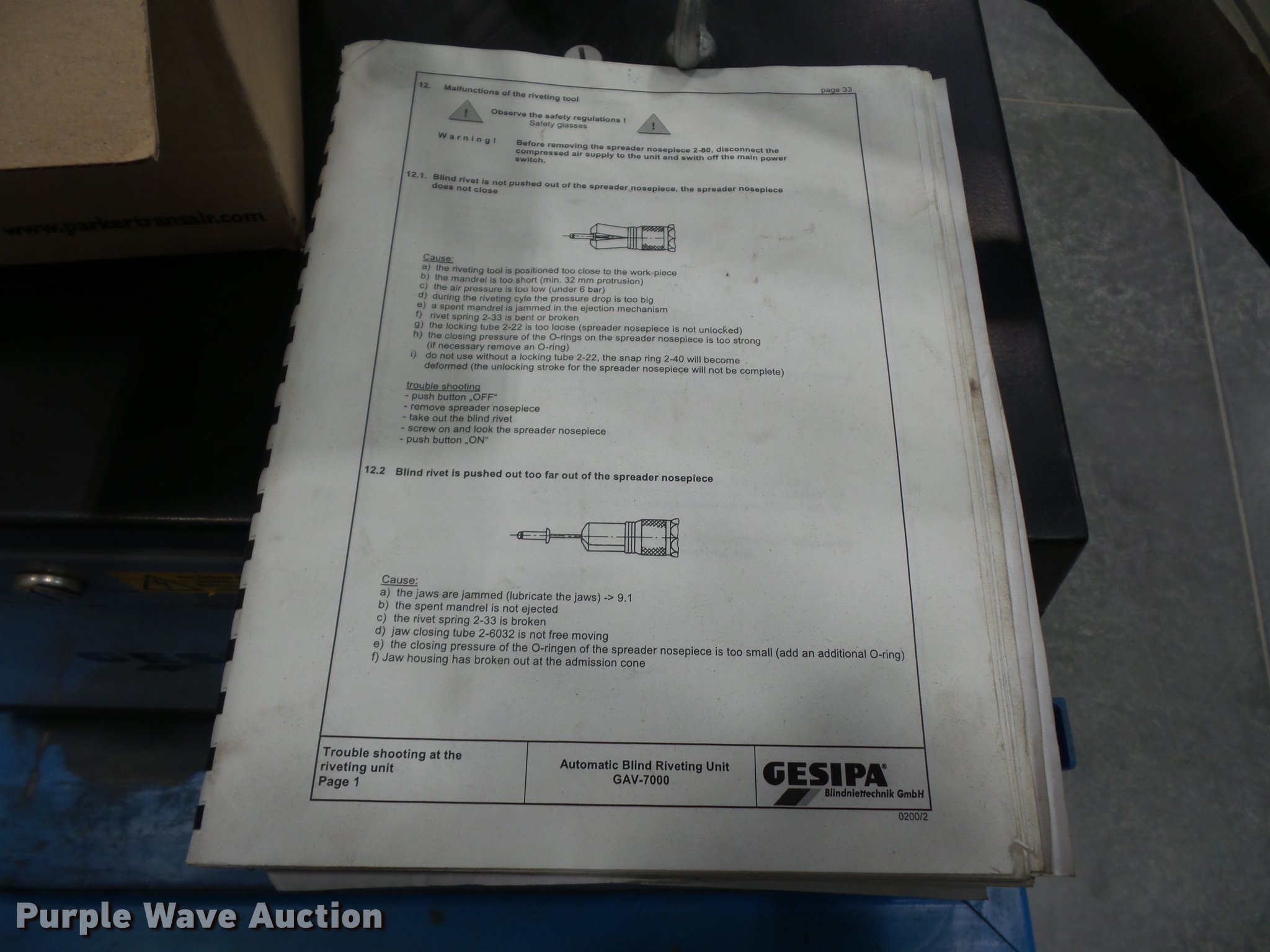 Purple Wave is selling a used Machine Shop Tools and Equip. in Missouri. This item is a Gesipa 7000 automatic rivet machine with the following: 110V, Serial 537807