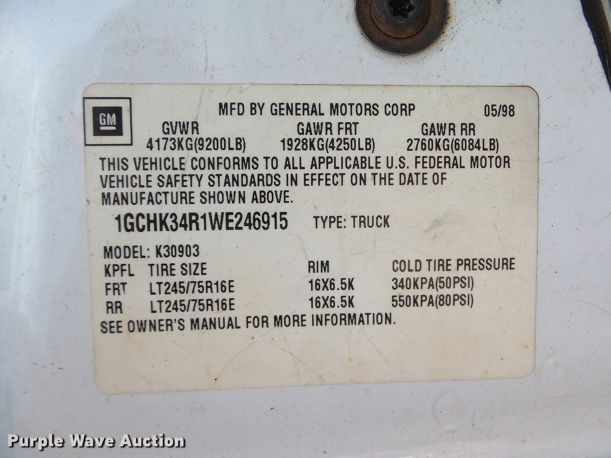 Purple Wave is selling a used 3/4 or 1 Ton Pickup or Van in Oklahoma. This item is a 1998 Chevrolet Silverado 3500 pickup truck with the following: 158,028 miles on odometer, 5.7L V8 OHV 16V gas engine, Five speed manual transmission, Four wheel drive, AC and heat, Tilt, Cruise, AM/FM/CD, Power windows, locks, and mirrors, Cloth interior, Brake controller, Front tow hooks, Gooseneck ball, Receiver hitch, Trailer wiring, LT245/75R16 tires