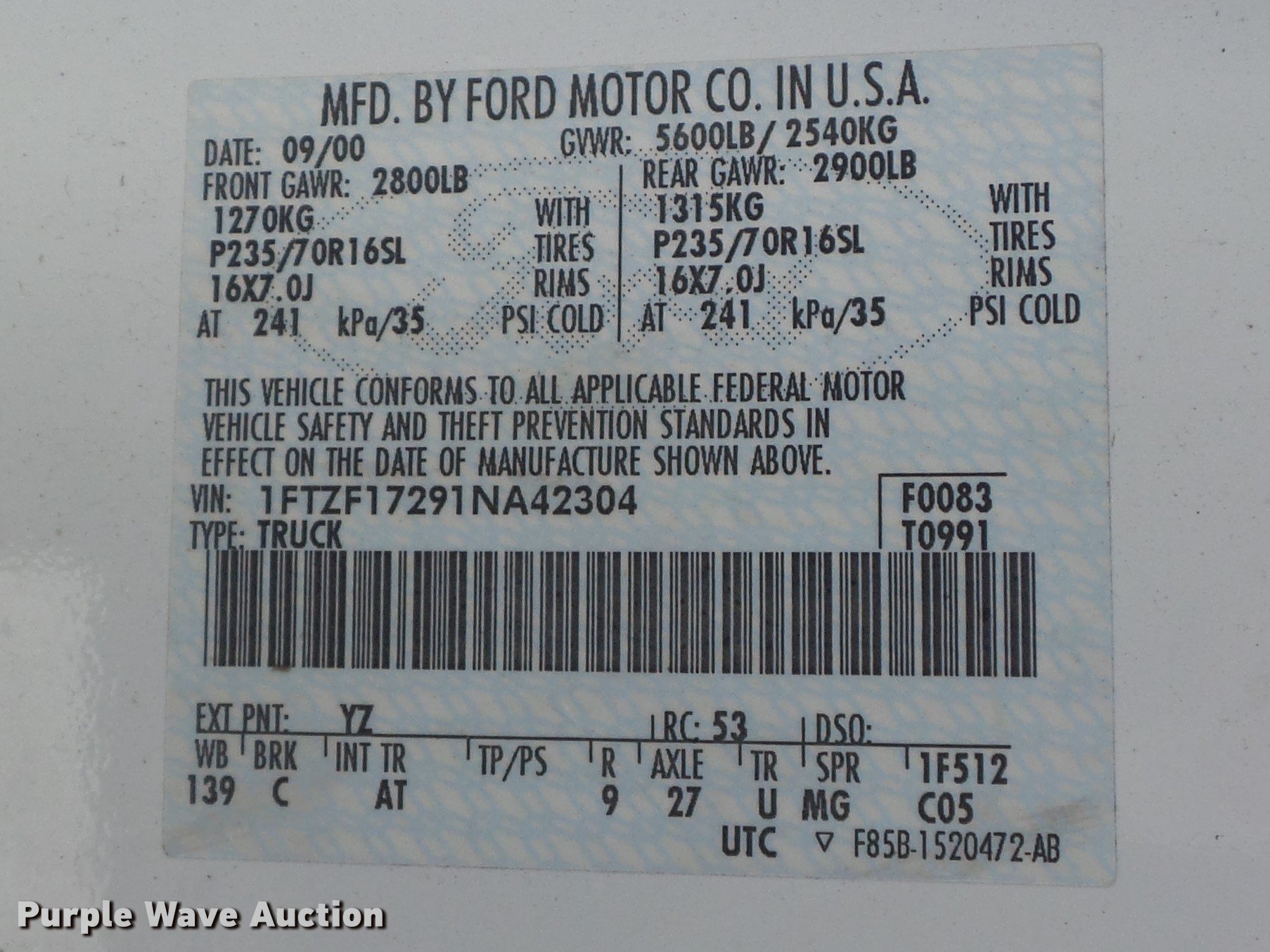 Purple Wave is selling a used 1/2 Ton Pickup or Van in Missouri. This item is a 2001 Ford F150 XL pickup truck with the following: Unknown miles on odometer, 4.2L V6 OHV 12V gas engine, Automatic transmission, AC and heat, AM/FM/CD, Manual windows and locks, Vinyl interior, Long bed, Bed liner, 225/70R16 tires, Cracked windshield, Tailgate missing