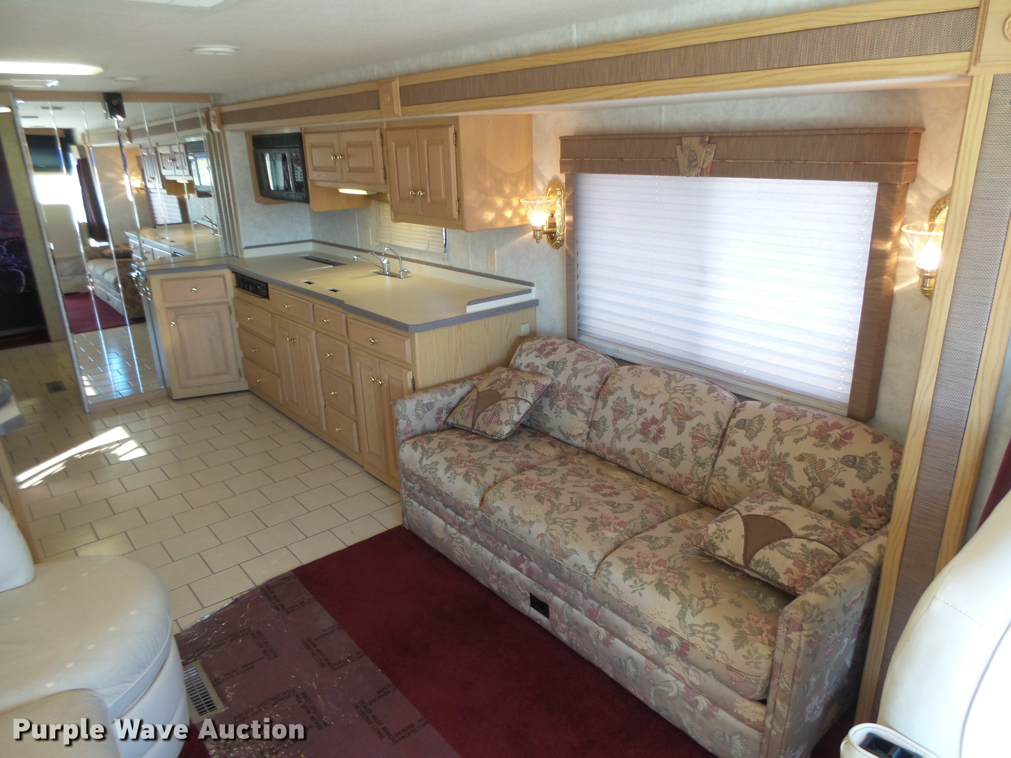 Purple Wave is selling a used RV in Oklahoma. This item is a 1999 Monaco Monocoque RV with the following: 31,532 miles on odometer, Cummins ISB 5.9L L6 turbo diesel engine, Allison automatic transmission, AC and heat, AM/FM/CD, CB radio, Power mirrors, Air suspension seat, Backup camera, Ronco trailer brake controller, 38'L, Dual flat screen televisions, Samsung speakers, Slide out, Sharp microwave, Dual sinks, Coffee pot, Wedgewood three burner oven, Norcold refrigerator/freezer, Shower, Washer and dryer connections, Double bed, Confort control Duo-therm heating and air system, Panasonic Jet-Flow vacuum, Dual roof top AC units, Roof mounted satellite, Carefree roll-out awning, Generator, Under carriage storage, Receiver hitch, Trailer wiring, Air suspension, Air brakes, Michelin 255/70R22.5 tires, GVWR 29,000 lbs