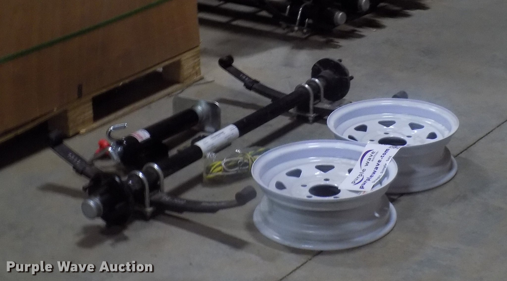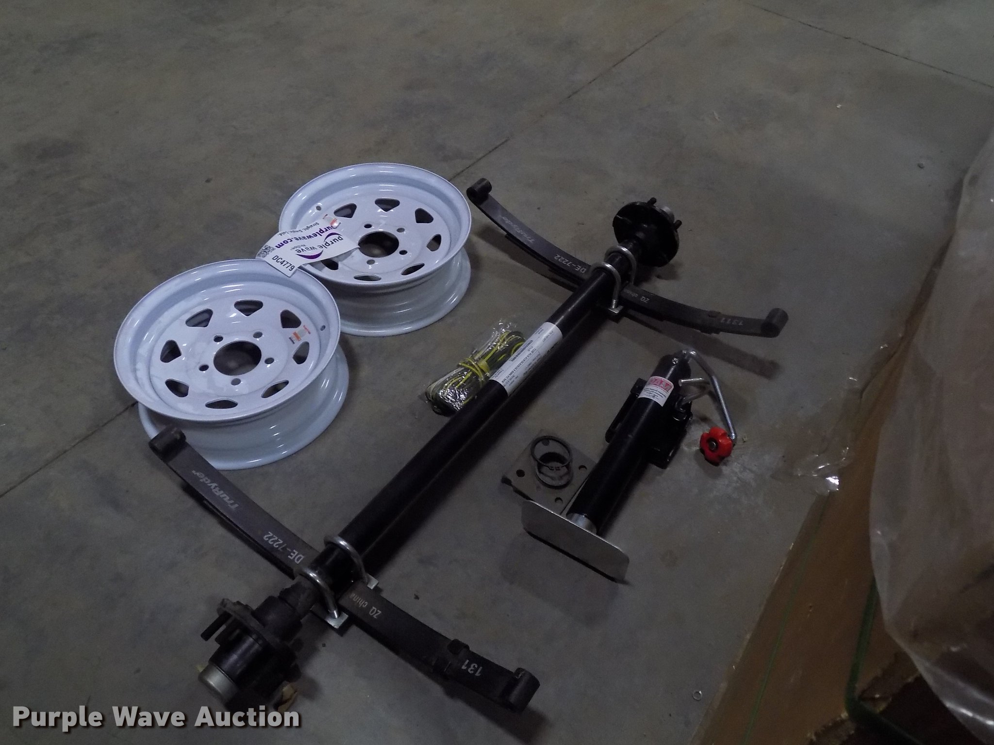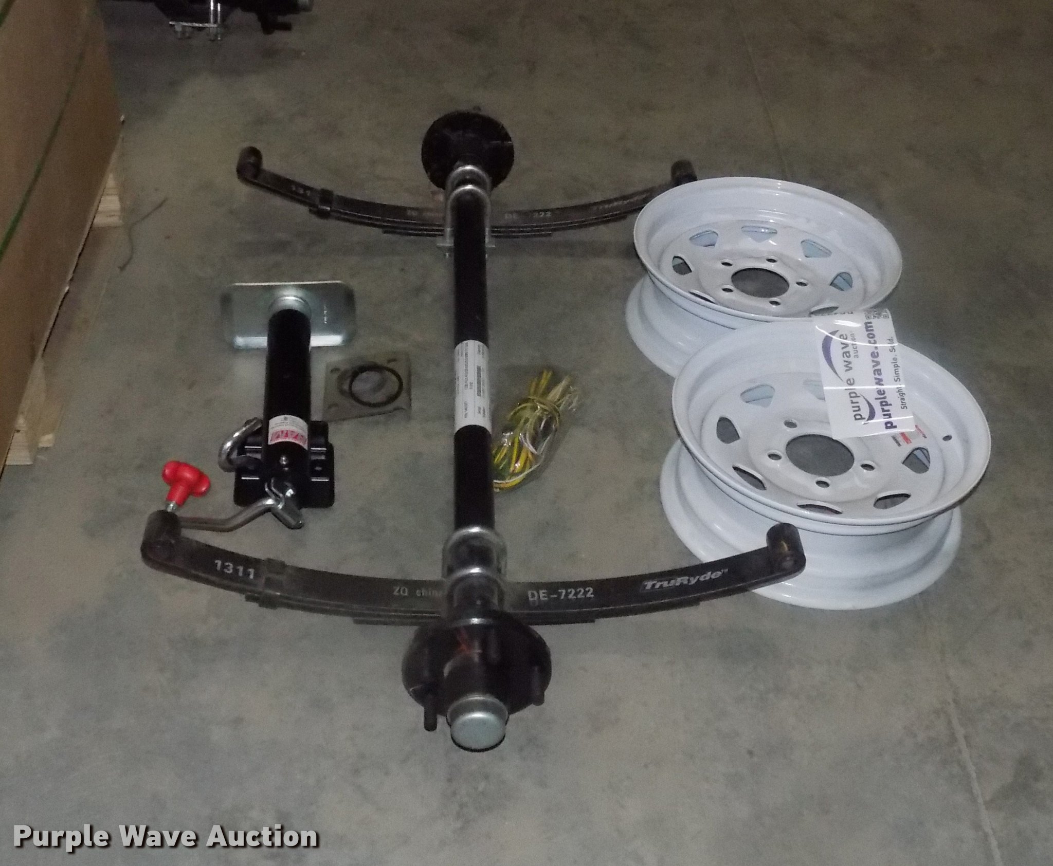 Purple Wave is selling a used Trailer Other in Iowa. This item is a Utility trailer axle kit with the following: TruRyde spring, DE-7222, 22,000 lbs capacity, Serial 10-88667-088667-1-1-008, Ram jack, 3,000 lbs support capacity, 2,000 lbs lift capacity, Wiring harness, (2) 13" steel wheels