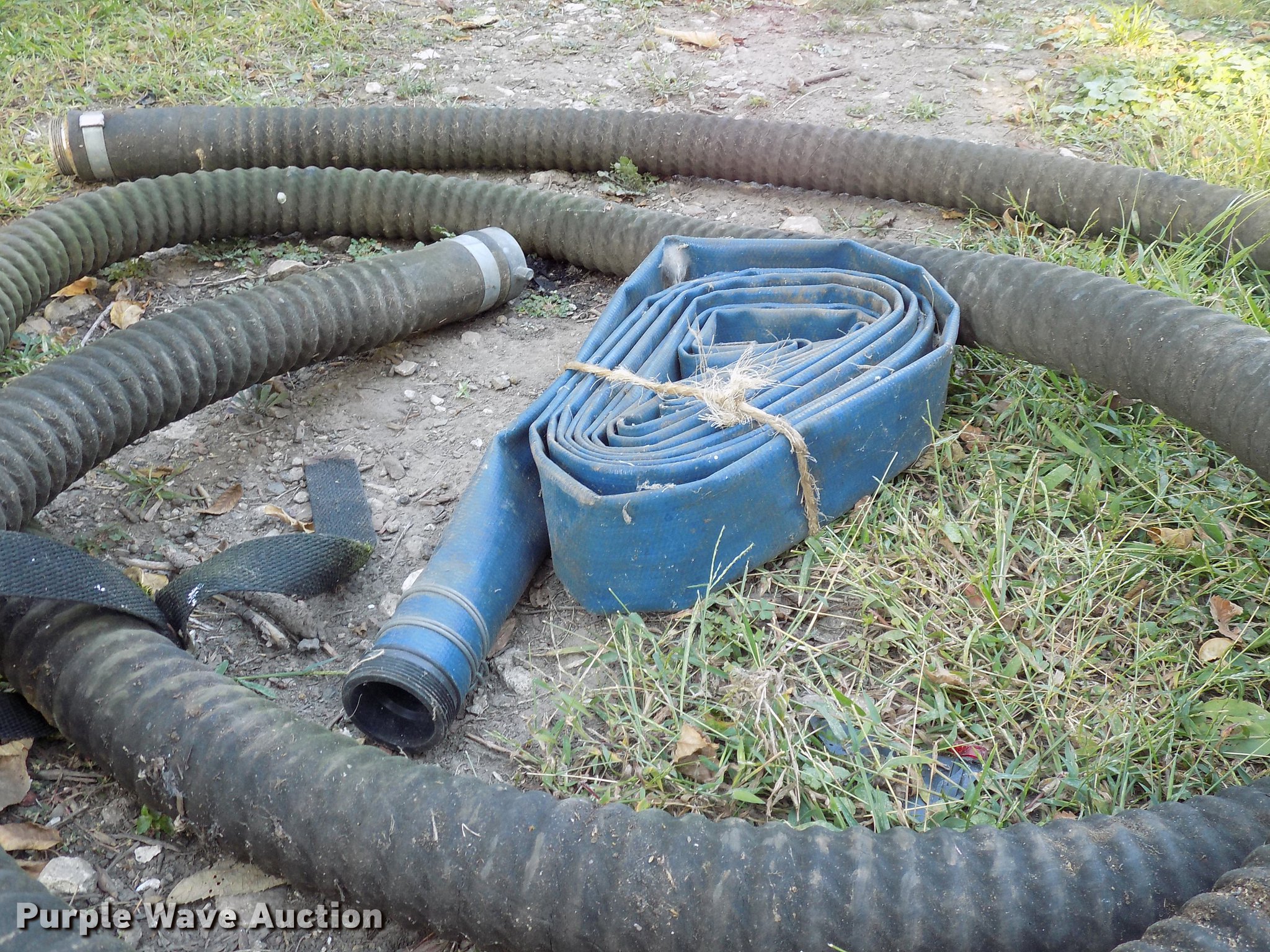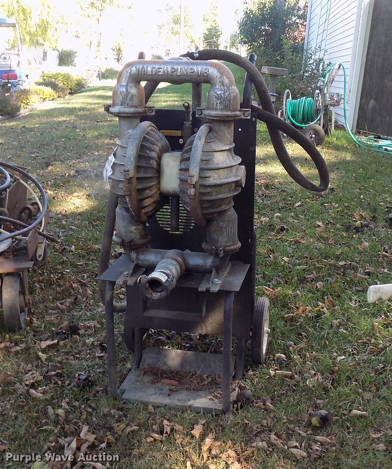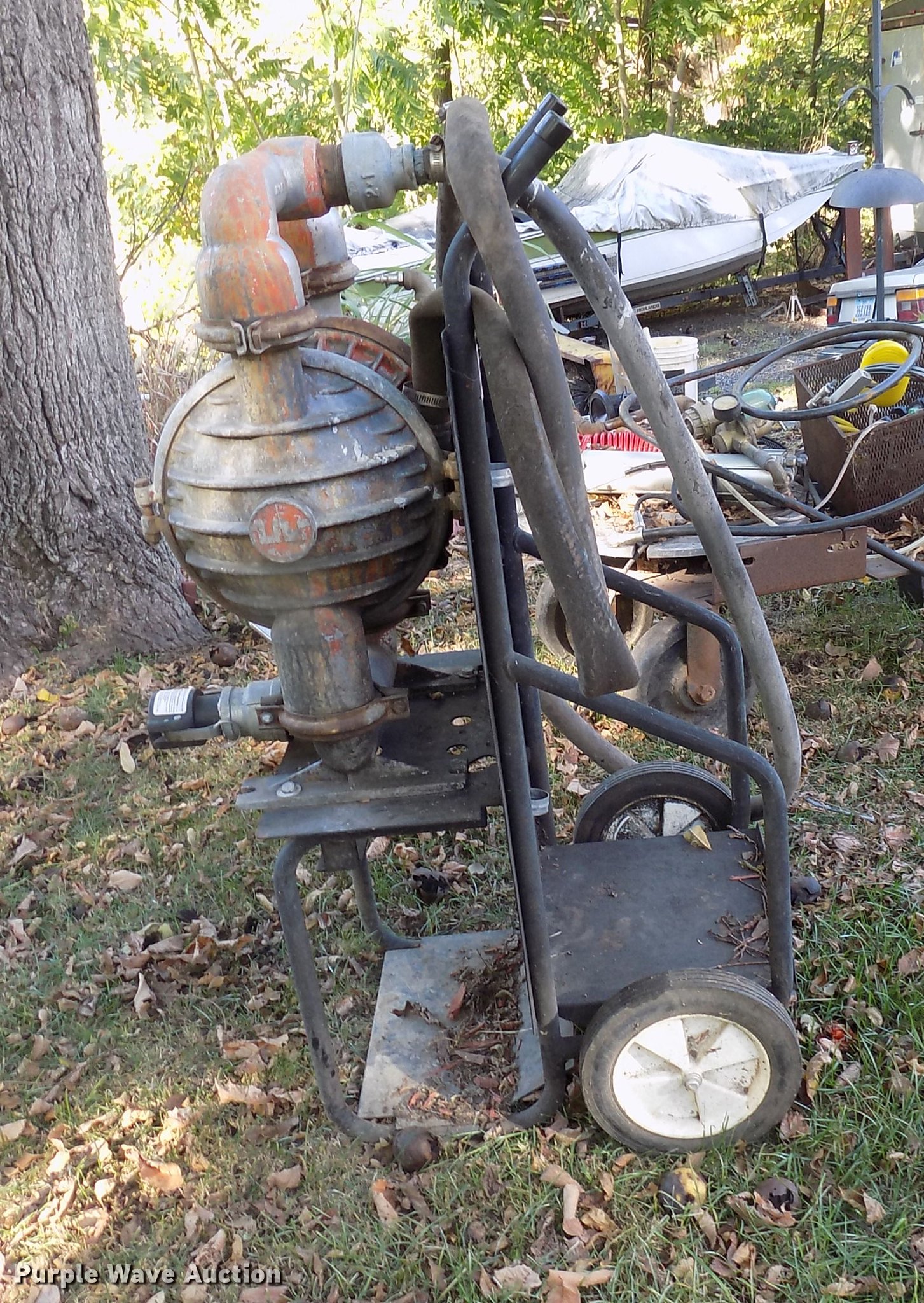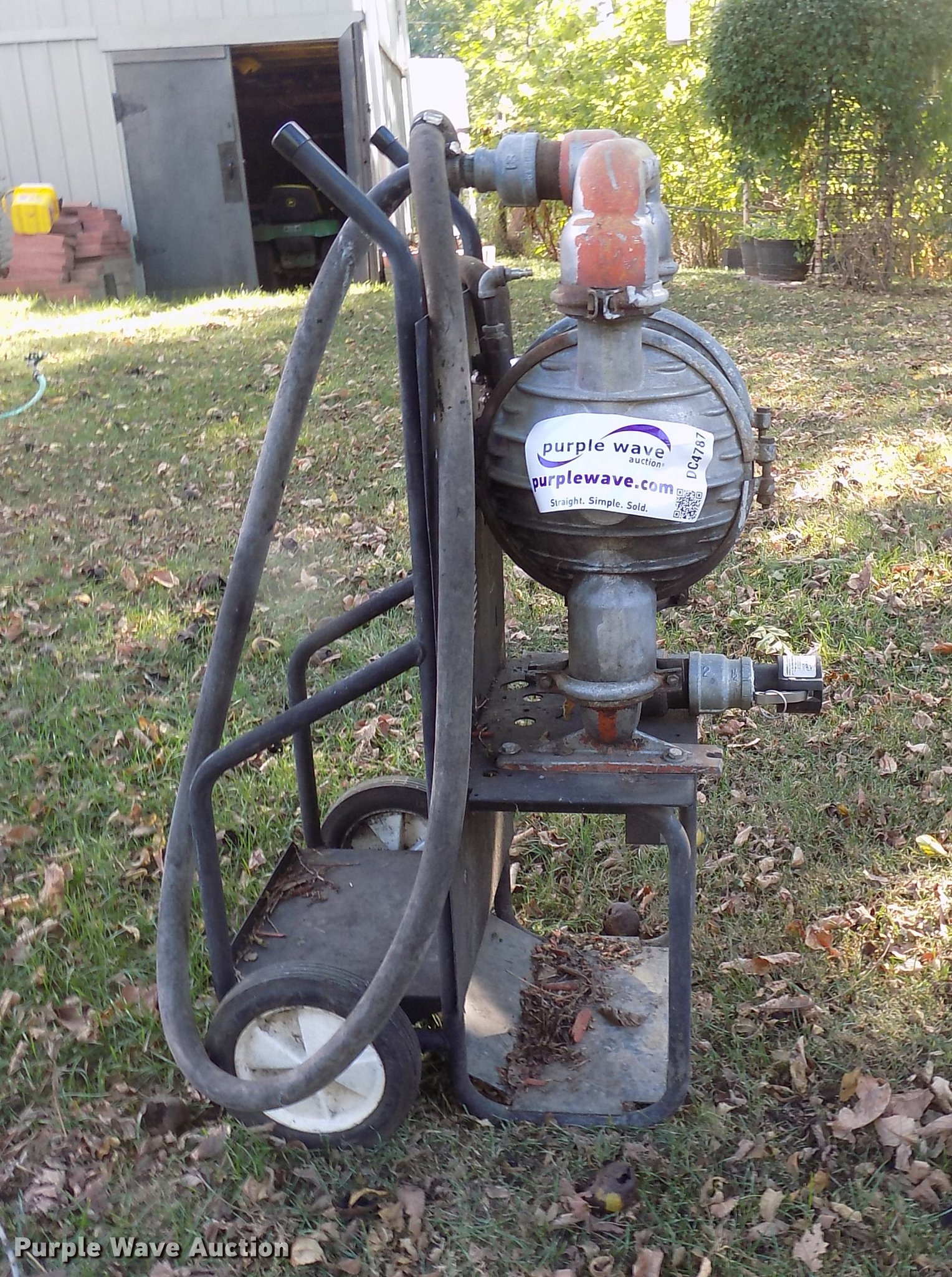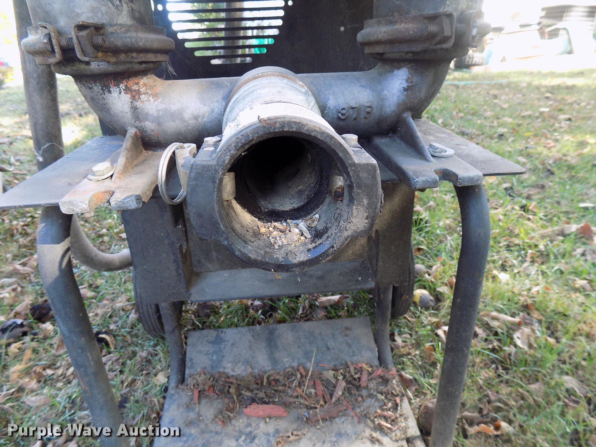 Purple Wave is selling a used Pump in Iowa. This item is a Pneumatic trash pump with the following: 2" outlet, Wheel dolly, (2) additional hoses