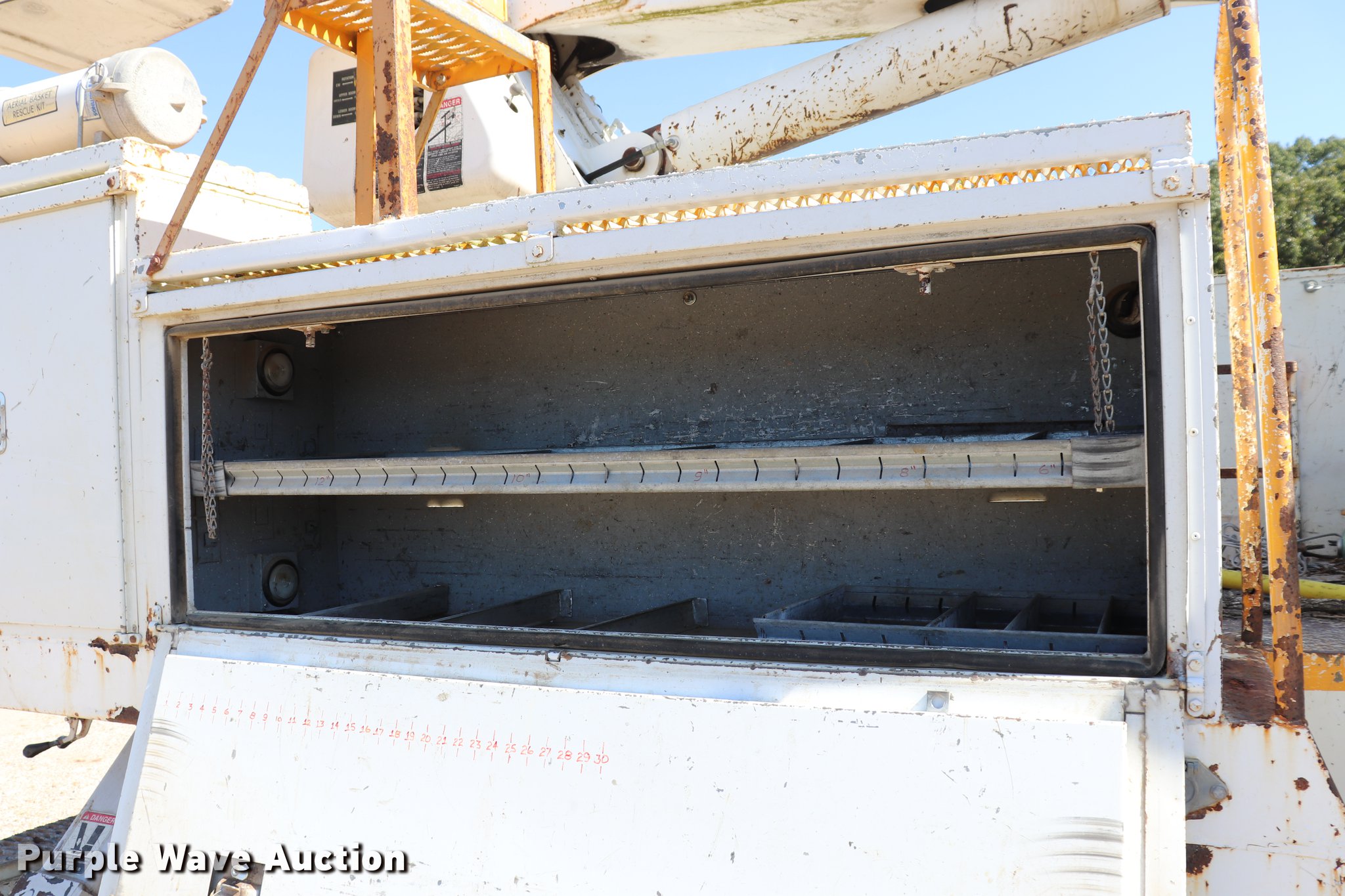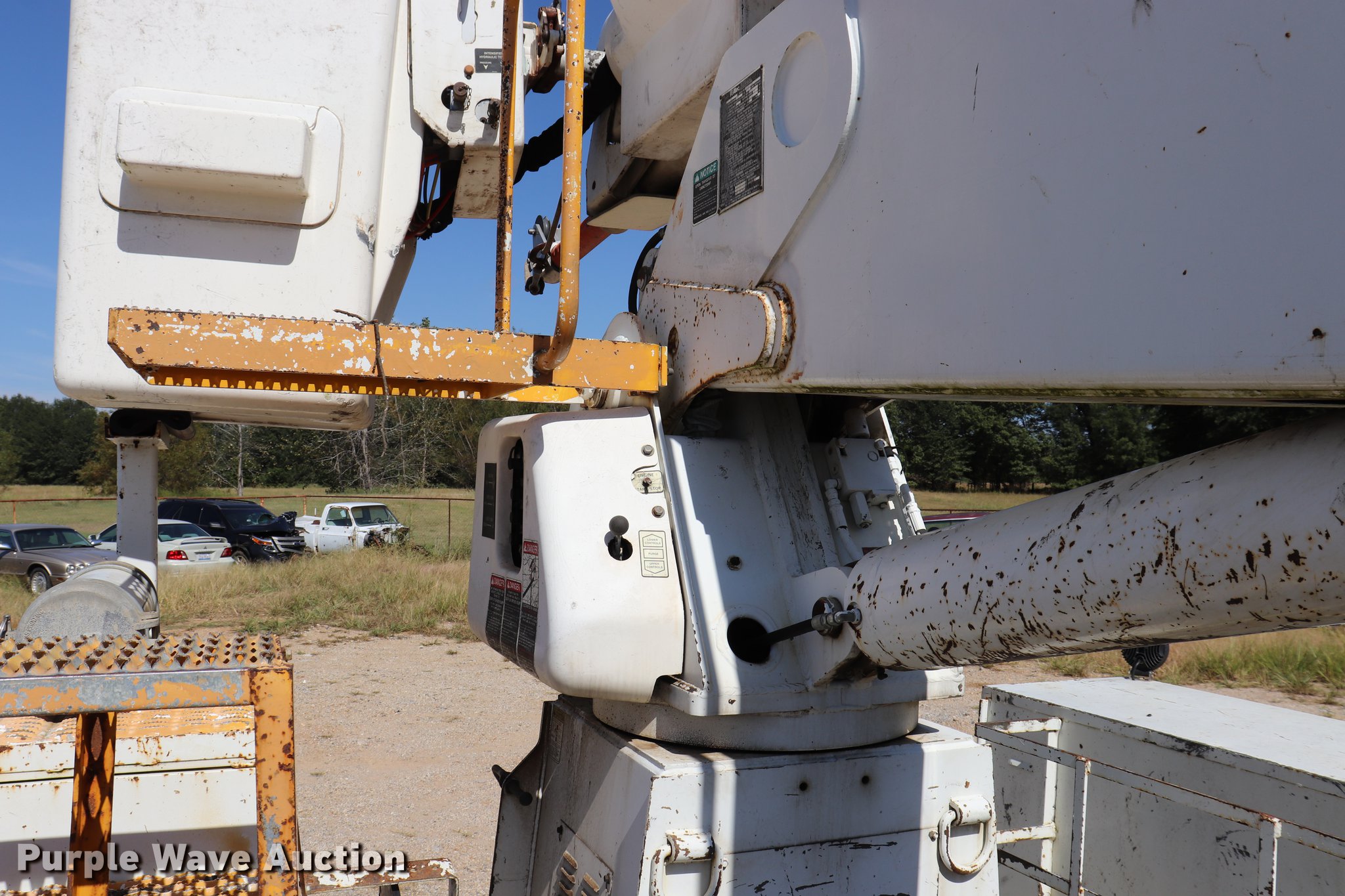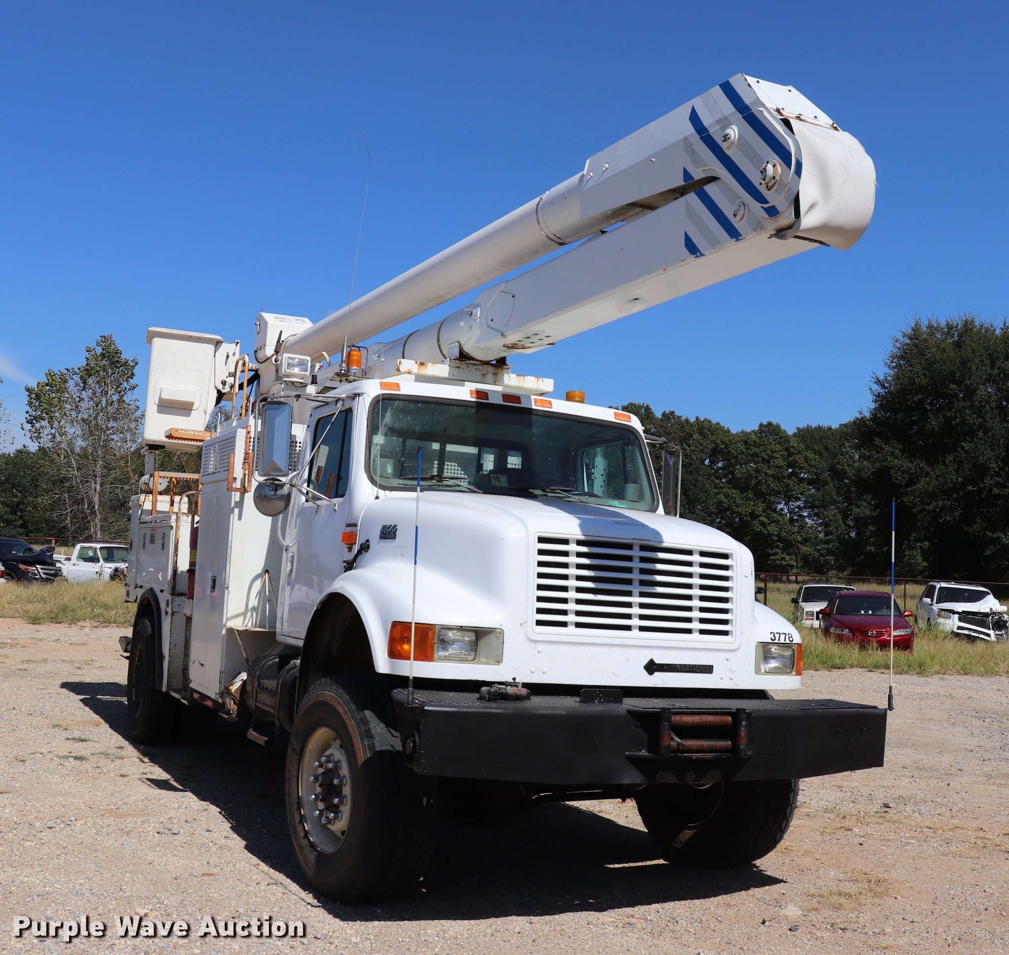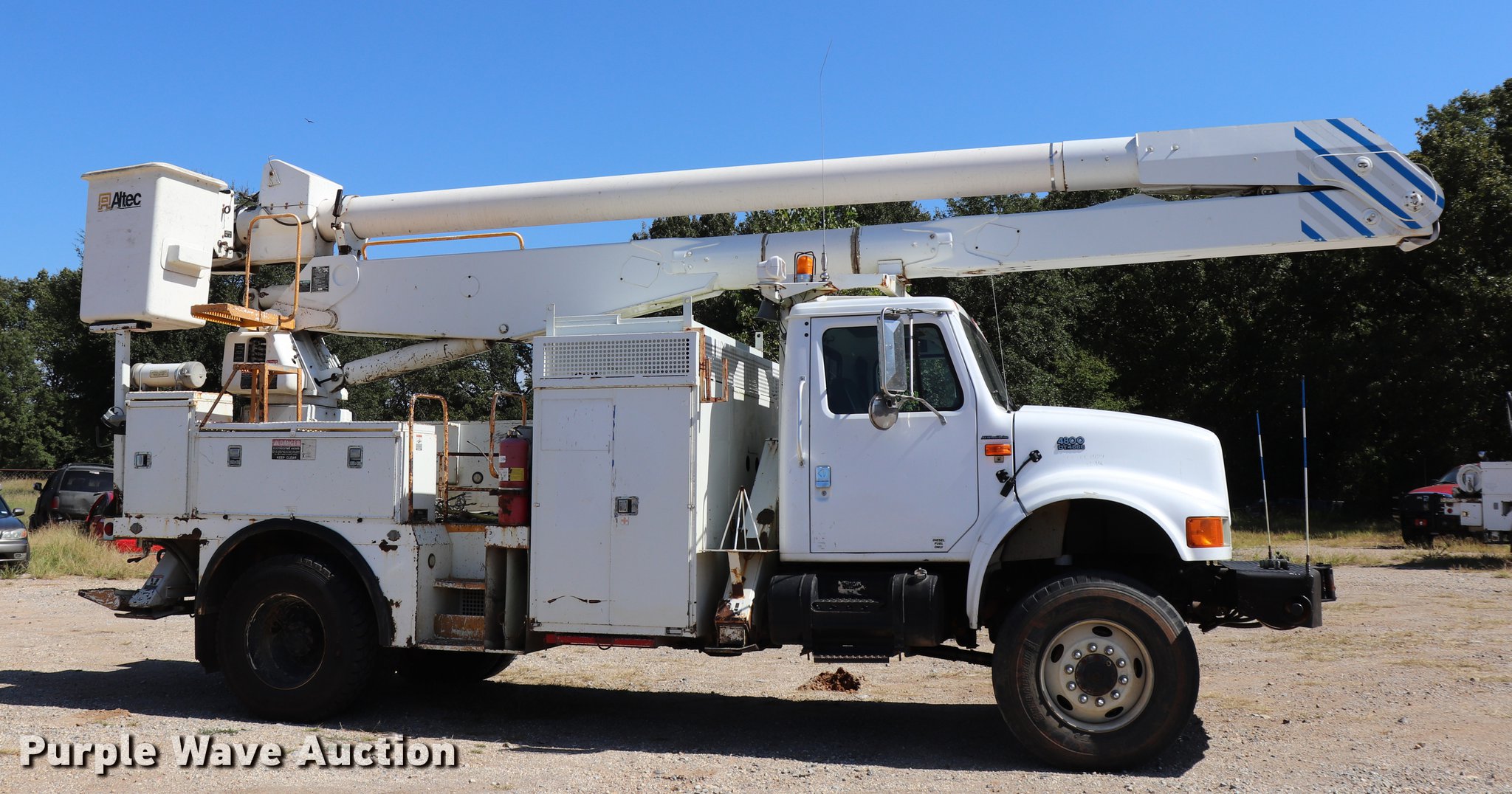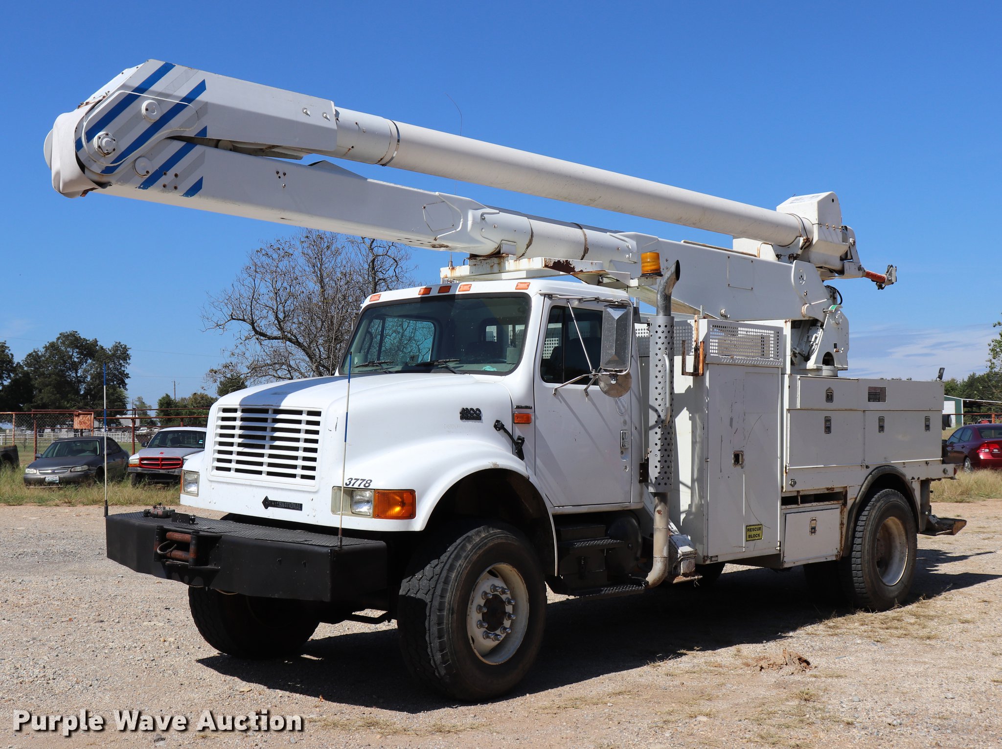 Purple Wave is selling a used Bucket Truck in Oklahoma. This item is a 2001 International 4800 bucket truck with the following: 185,644 miles on odometer, 13,973 hours on meter, International DT466E 7.6L L6 turbo diesel engine, Automatic transmission, All wheel drive, AC and heat, Cruise, AM/FM, Single exhaust stack, Adkins 12495FTV40 service bed, 175"L, Shelving, Slide-out drawers, Compartment lights, Front work lights, Serial 6278100, Altec AA755L boom, 55' boom length, 400 lbs max platform capacity, Man basket, 55' max lift height, 1,500 lbs max jib capacity, Ground and platform controls, Boom rotation, Articulating boom, Cable material handler, (4) outriggers, Serial 1199BZ0951, Single fuel tank, Spring suspension, Air brakes, 190" wheelbase, 385/65R22.5 front tires, 11R22.5 rear tires
