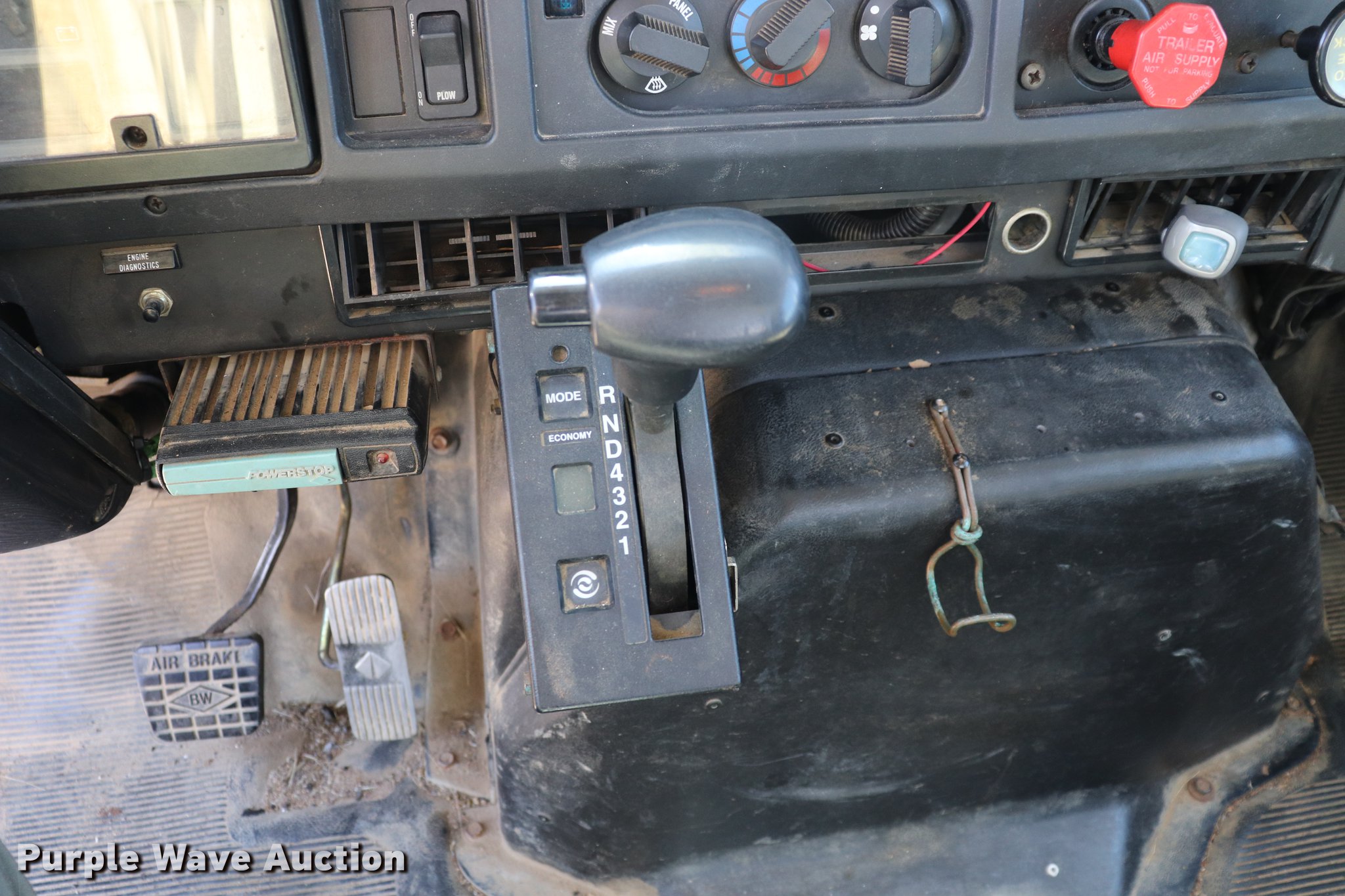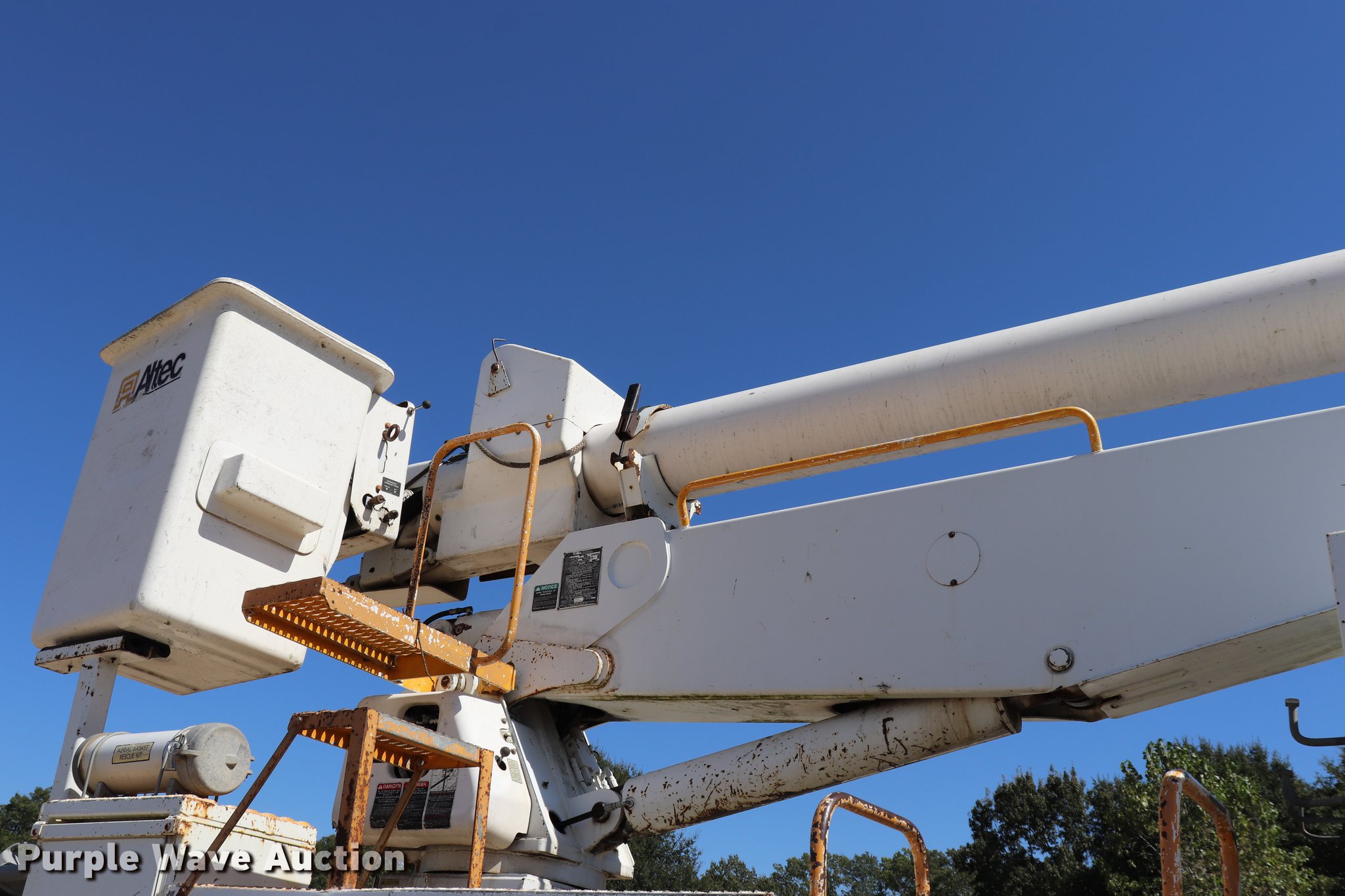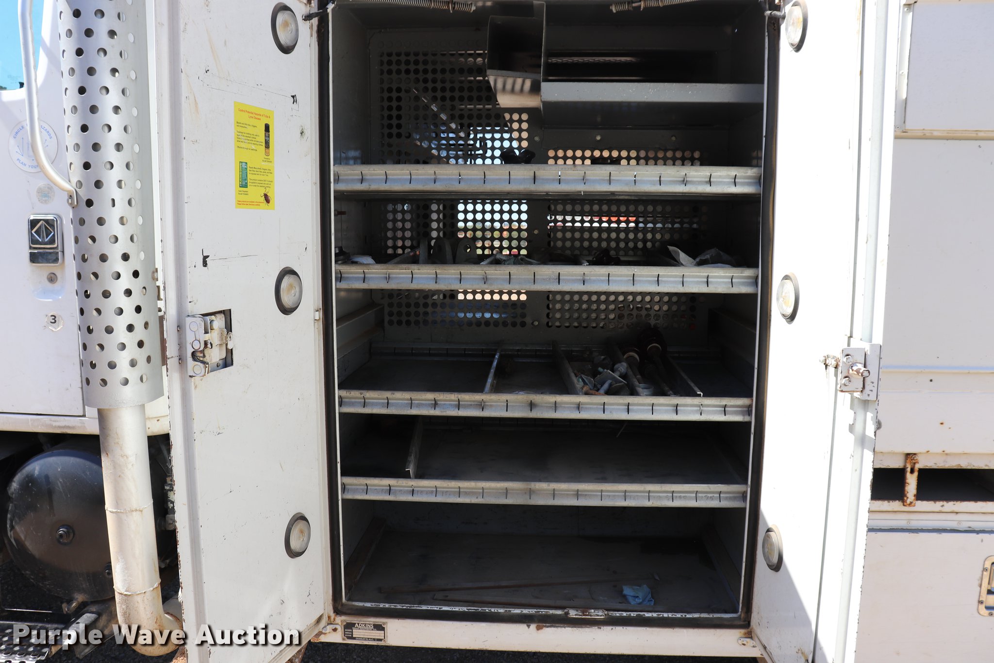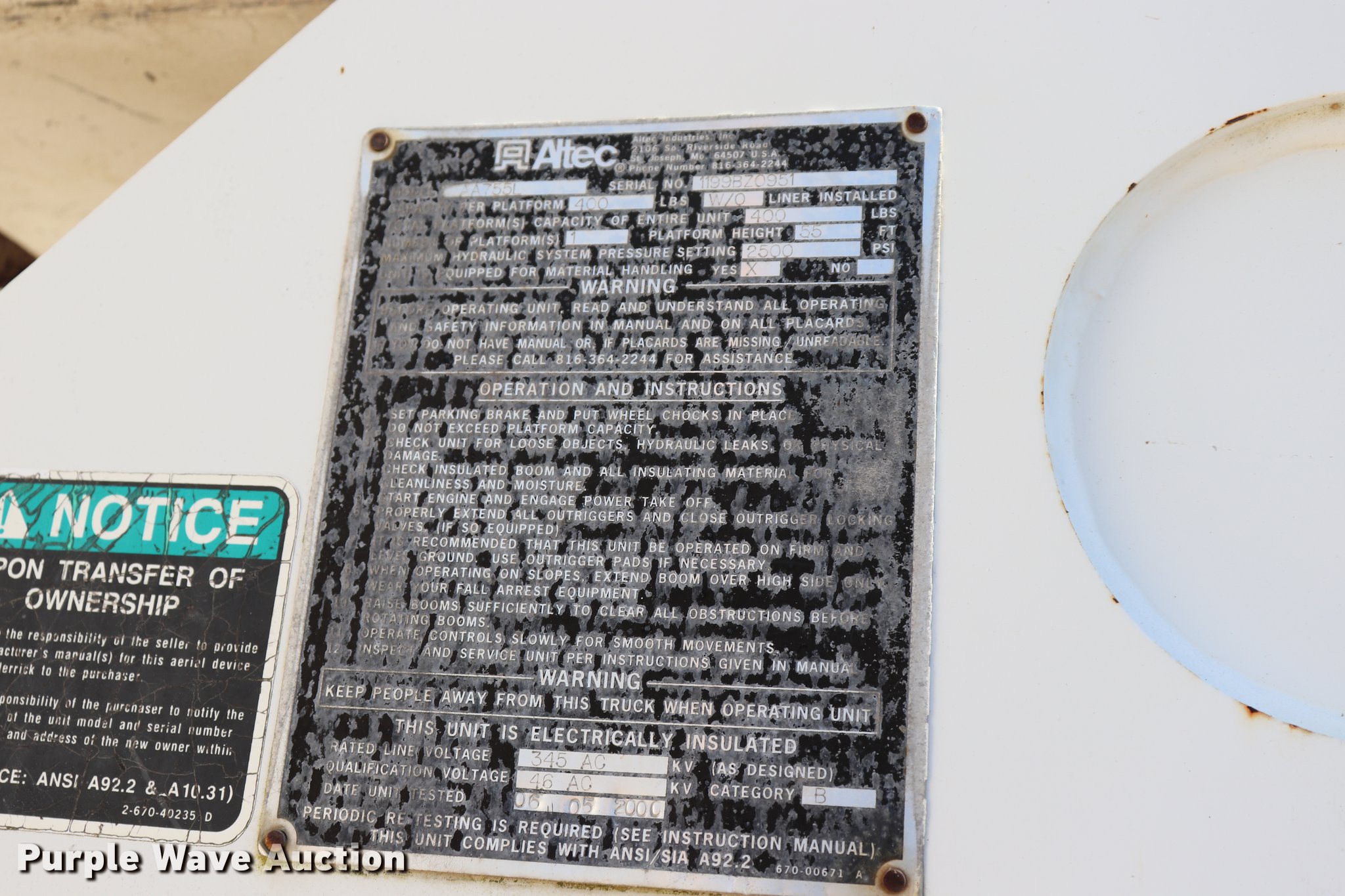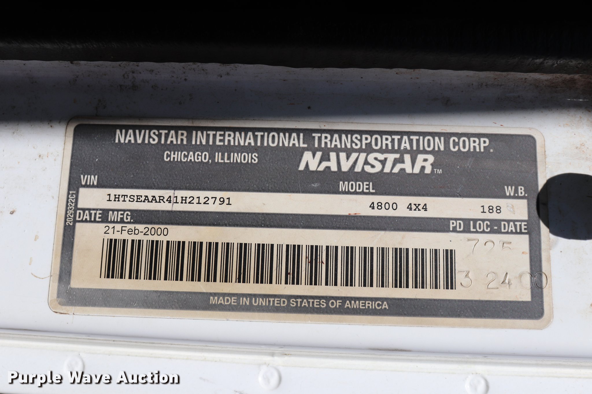 Purple Wave is selling a used Bucket Truck in Oklahoma. This item is a 2001 International 4800 bucket truck with the following: 185,644 miles on odometer, 13,973 hours on meter, International DT466E 7.6L L6 turbo diesel engine, Automatic transmission, All wheel drive, AC and heat, Cruise, AM/FM, Single exhaust stack, Adkins 12495FTV40 service bed, 175"L, Shelving, Slide-out drawers, Compartment lights, Front work lights, Serial 6278100, Altec AA755L boom, 55' boom length, 400 lbs max platform capacity, Man basket, 55' max lift height, 1,500 lbs max jib capacity, Ground and platform controls, Boom rotation, Articulating boom, Cable material handler, (4) outriggers, Serial 1199BZ0951, Single fuel tank, Spring suspension, Air brakes, 190" wheelbase, 385/65R22.5 front tires, 11R22.5 rear tires