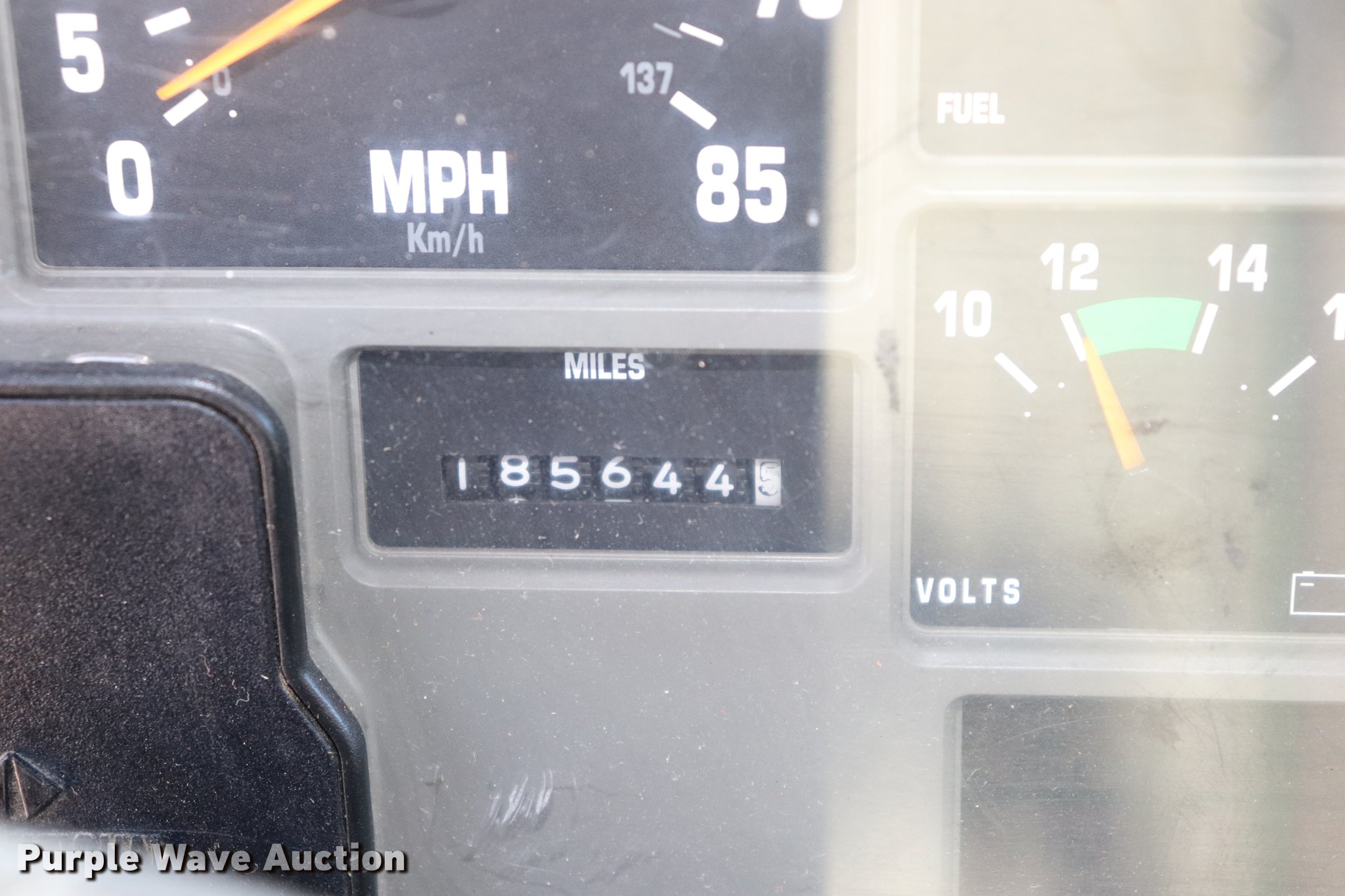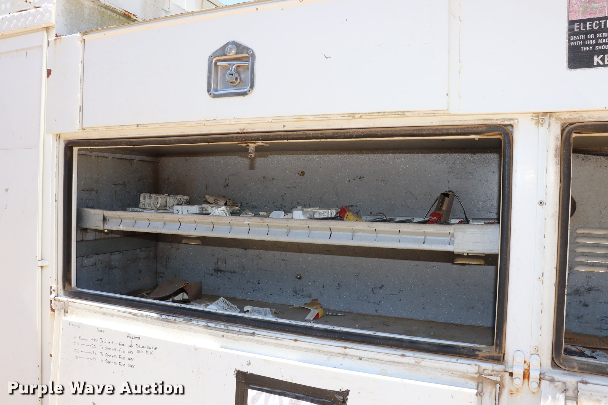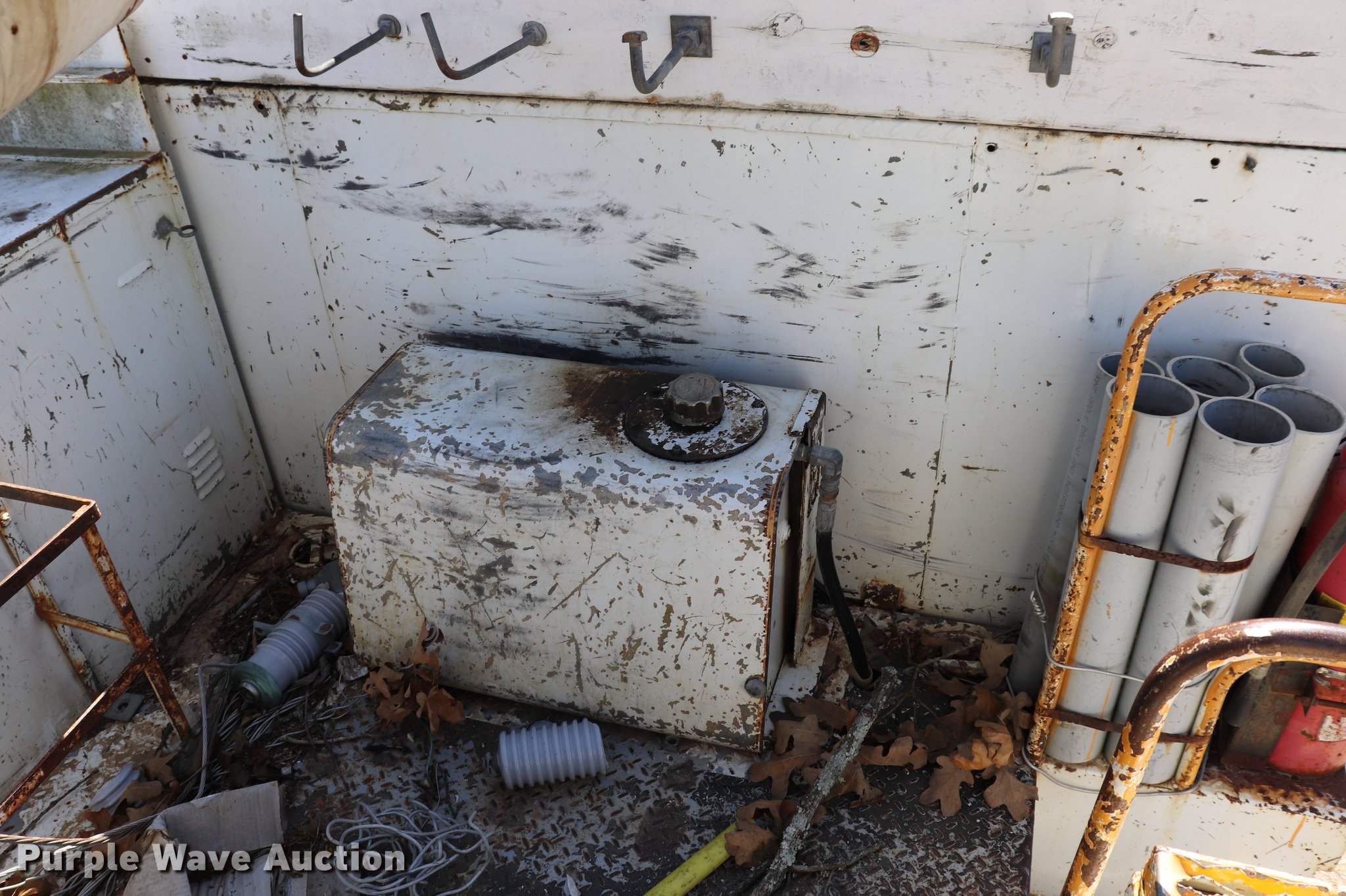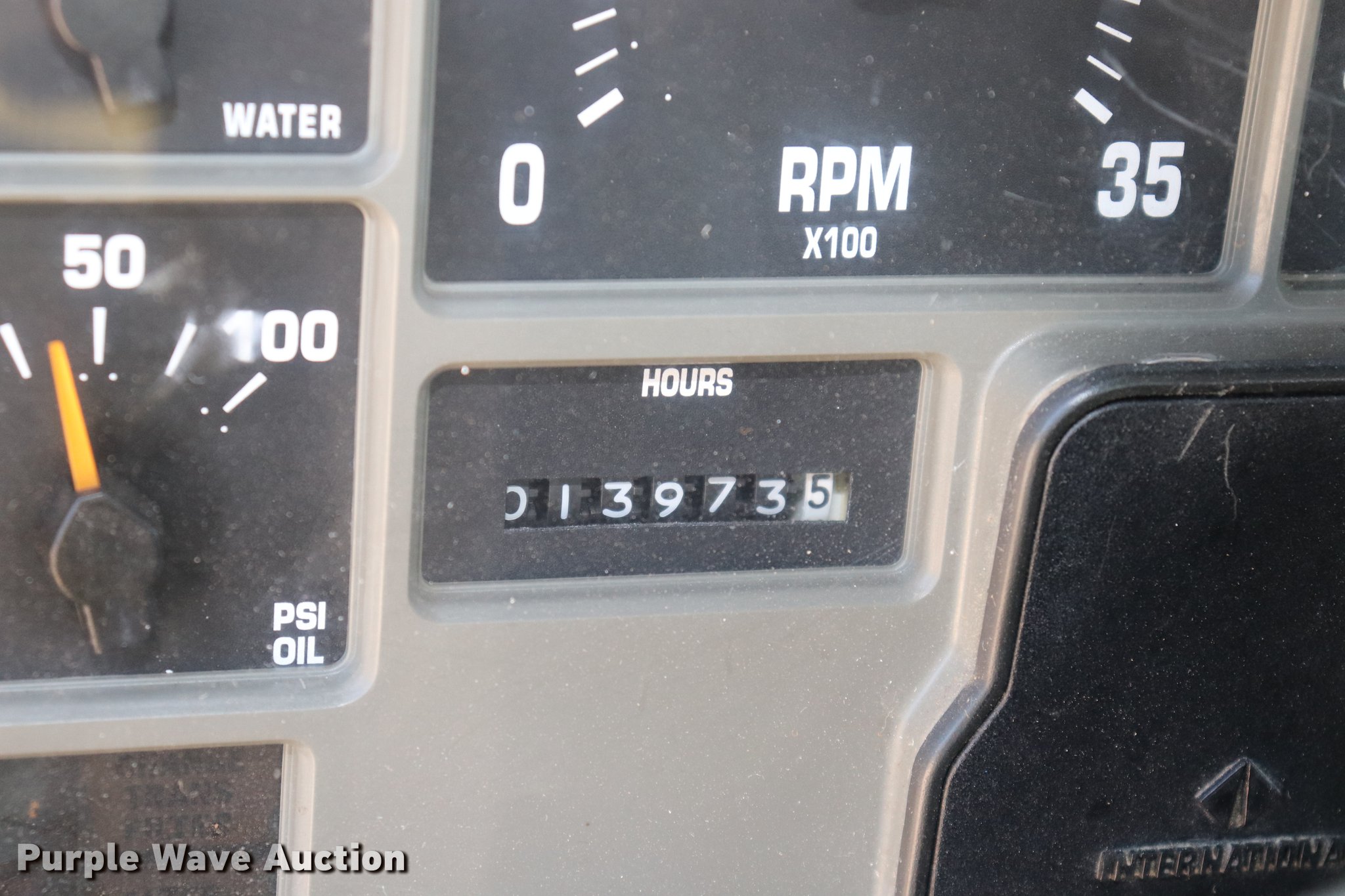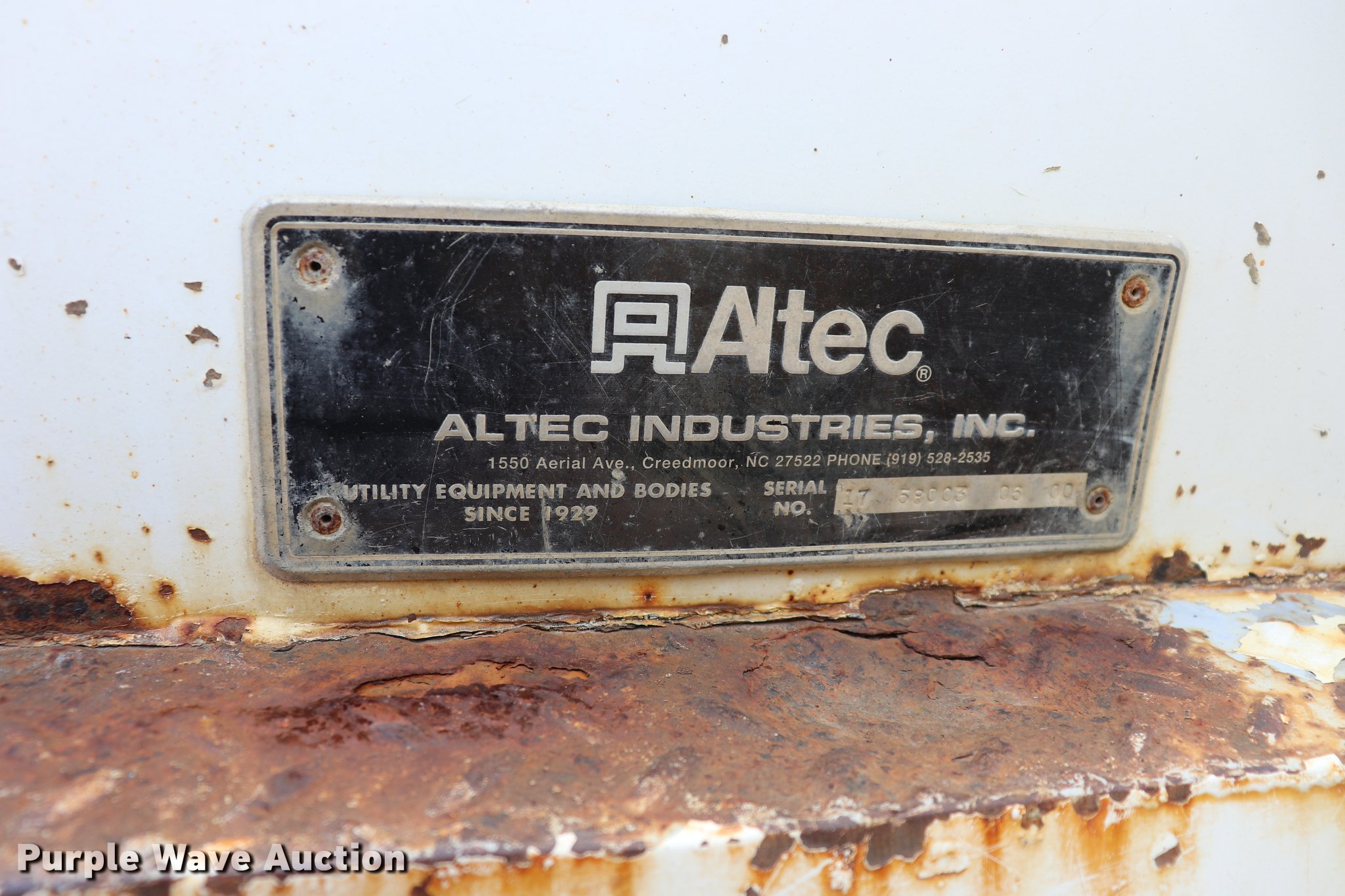 Purple Wave is selling a used Bucket Truck in Oklahoma. This item is a 2001 International 4800 bucket truck with the following: 185,644 miles on odometer, 13,973 hours on meter, International DT466E 7.6L L6 turbo diesel engine, Automatic transmission, All wheel drive, AC and heat, Cruise, AM/FM, Single exhaust stack, Adkins 12495FTV40 service bed, 175"L, Shelving, Slide-out drawers, Compartment lights, Front work lights, Serial 6278100, Altec AA755L boom, 55' boom length, 400 lbs max platform capacity, Man basket, 55' max lift height, 1,500 lbs max jib capacity, Ground and platform controls, Boom rotation, Articulating boom, Cable material handler, (4) outriggers, Serial 1199BZ0951, Single fuel tank, Spring suspension, Air brakes, 190" wheelbase, 385/65R22.5 front tires, 11R22.5 rear tires