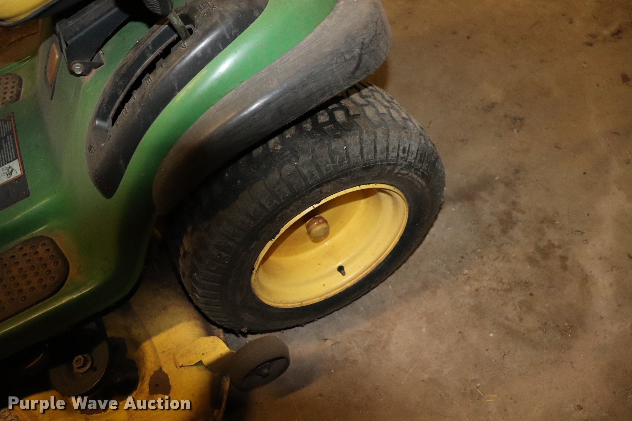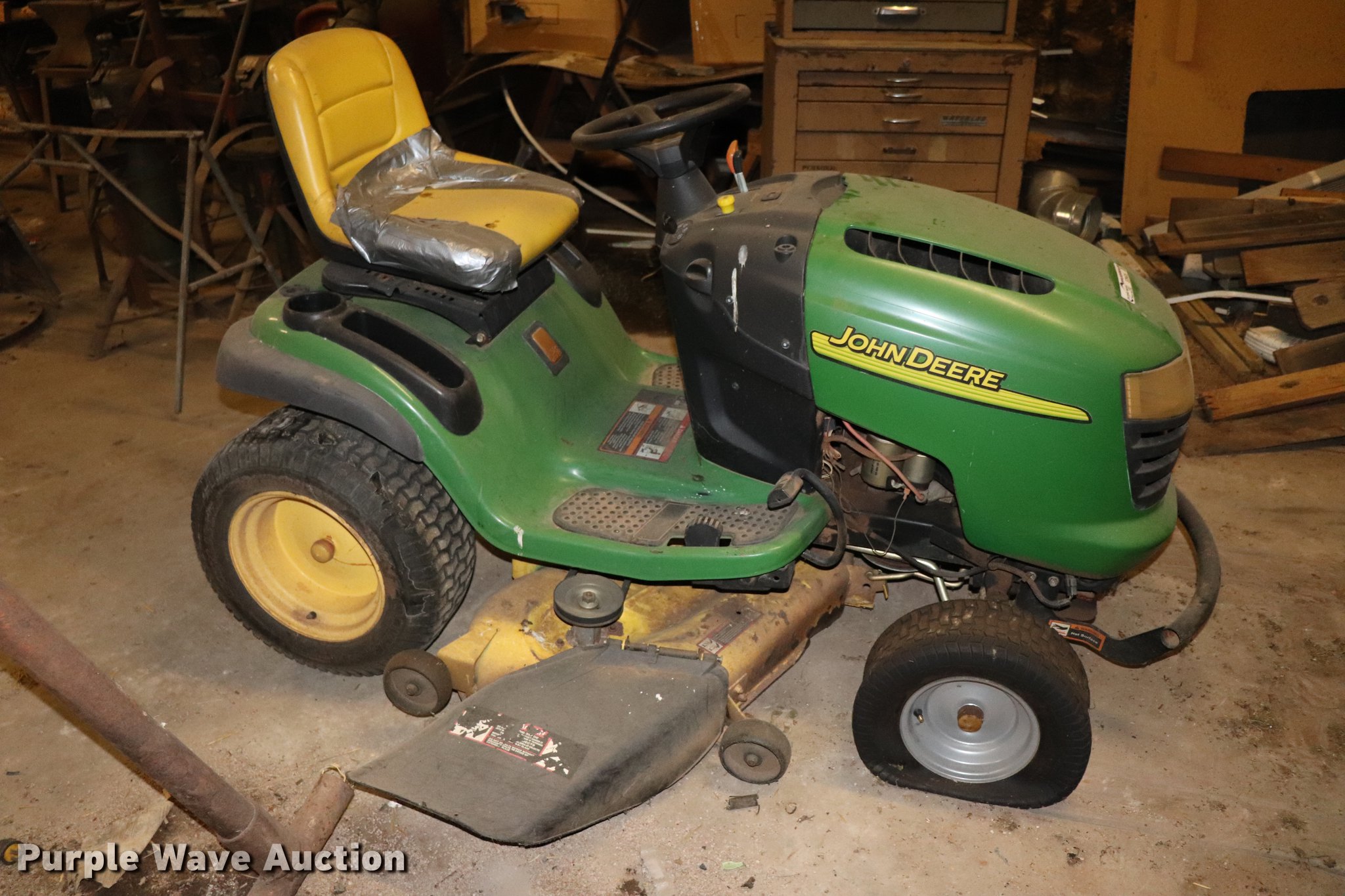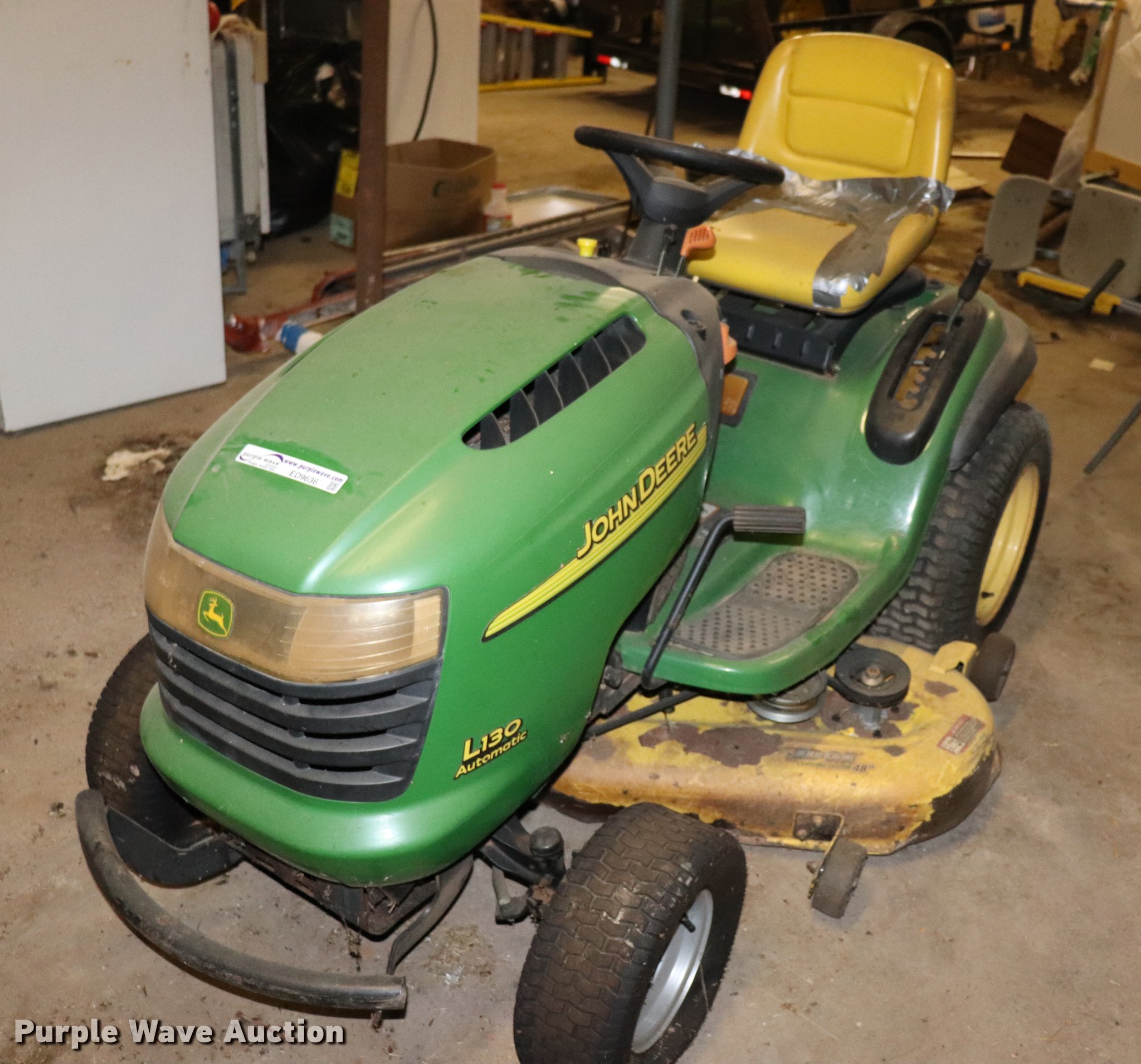 Purple Wave is selling a used Lawn Mower in Oklahoma. This item is a (2) lawn mowers with the following: John Deere L130AT lawn mower, 48"W deck, V-twin gas engine, 23 HP, Hydrostatic transmission, Pin hitch, 16.00 x 9.50-8 front ties, 22.00 x 9.50 rear tires, Serial 072403, John Deere 445 lawn mower, 54"W deck, V-twin gas engine, 22 HP, Hydrostatic transmission, (2) sets hydraulics, 2" ball hitch, 8 x 8.50 front tires, 26.00 x 12.00 rear tires, Serial M00445C097484, Deck issue