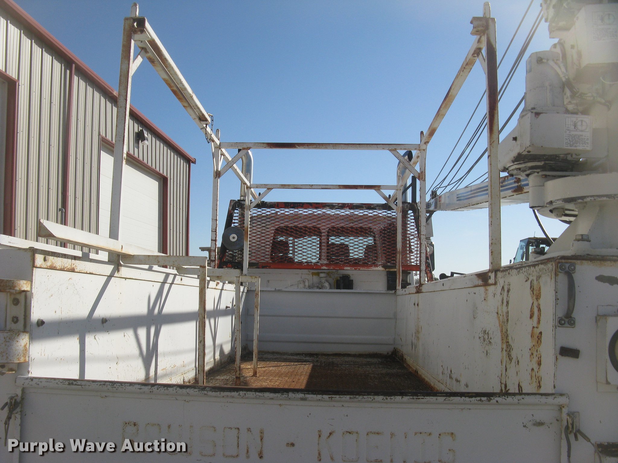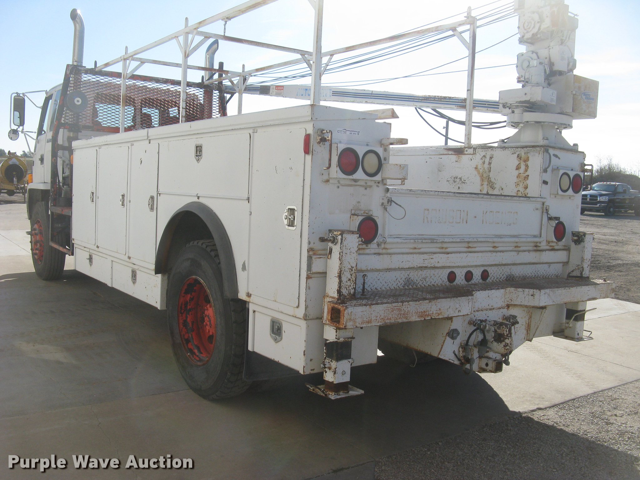 Purple Wave is selling a used Truck Part and Attach. in Kansas. This item is a RKI DA4211 utility bed with the following: 14'L x 8'W, (16) side compartments, (4) top box tool trays, Ladder racks, Step-up bumper, (2) outriggers, Pintle hitch, Receiver hitch, Trailer wiring, Glad hand connections, Bed will be removed from chassis prior to auction, Crane selling separately as item AR9760, Serial A10901