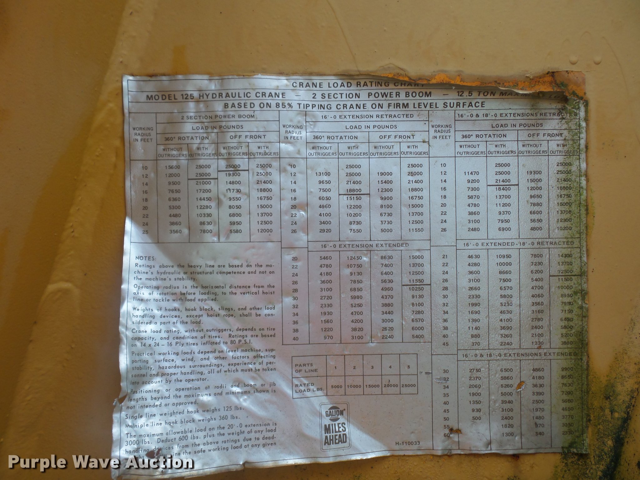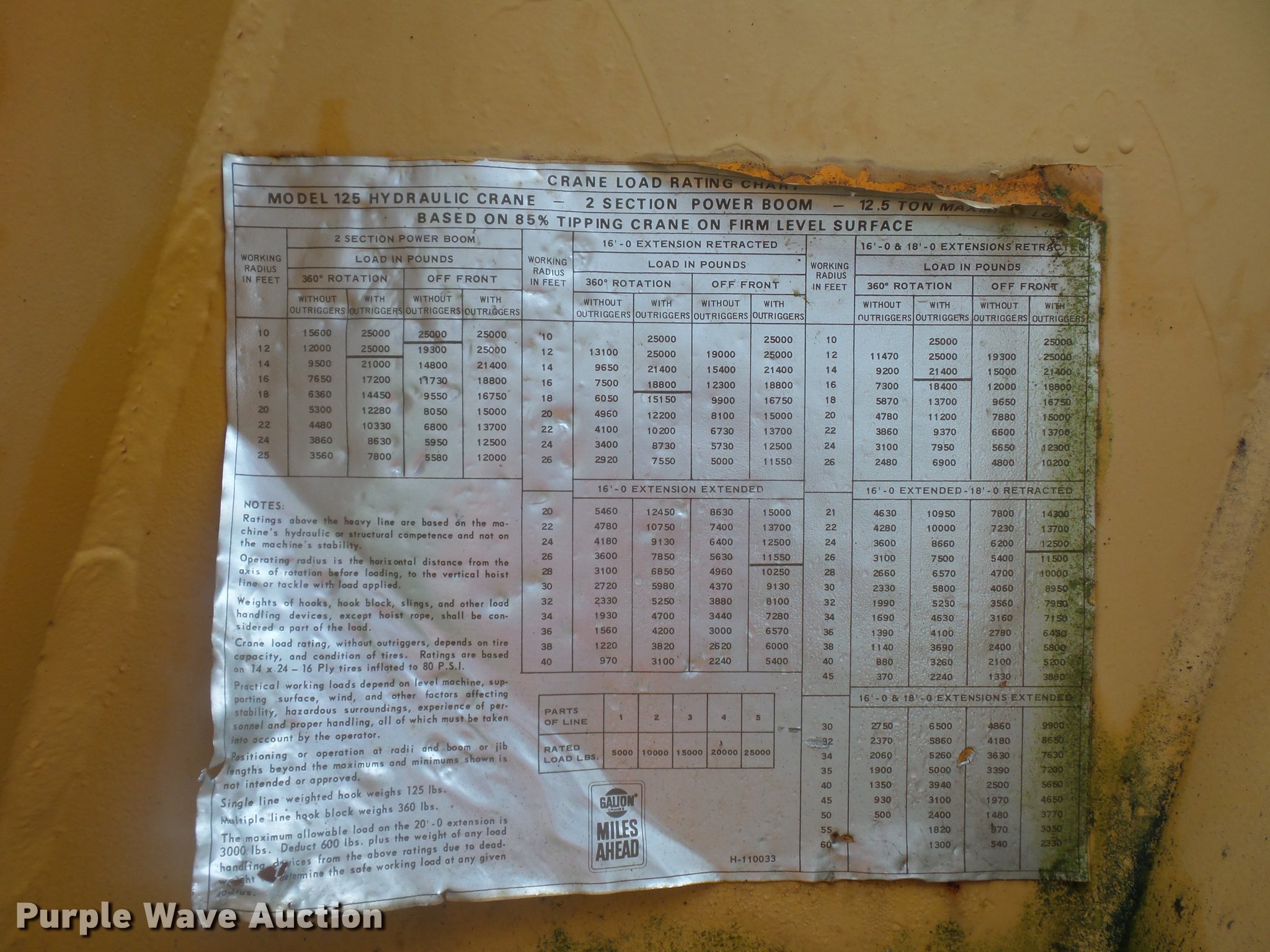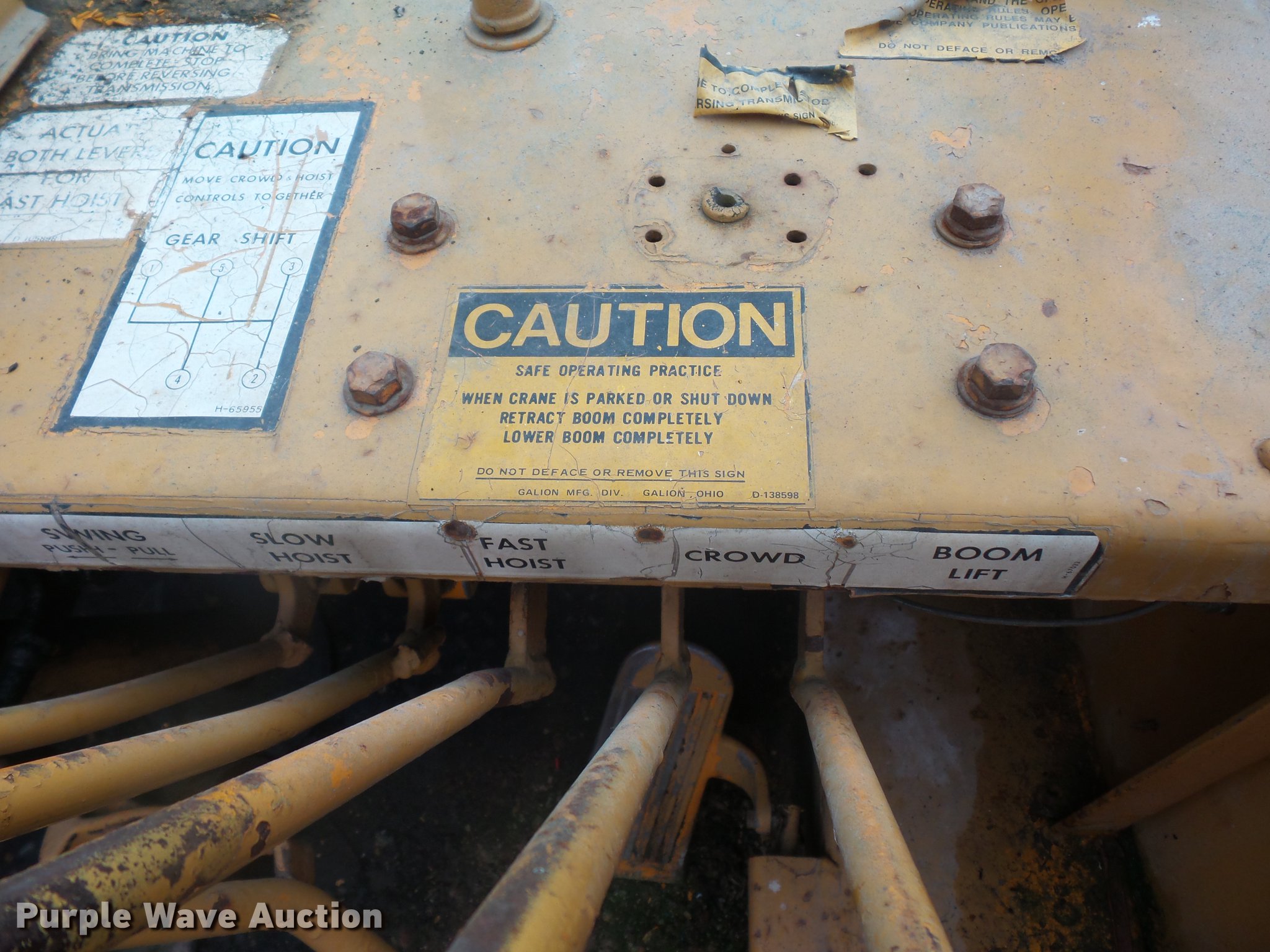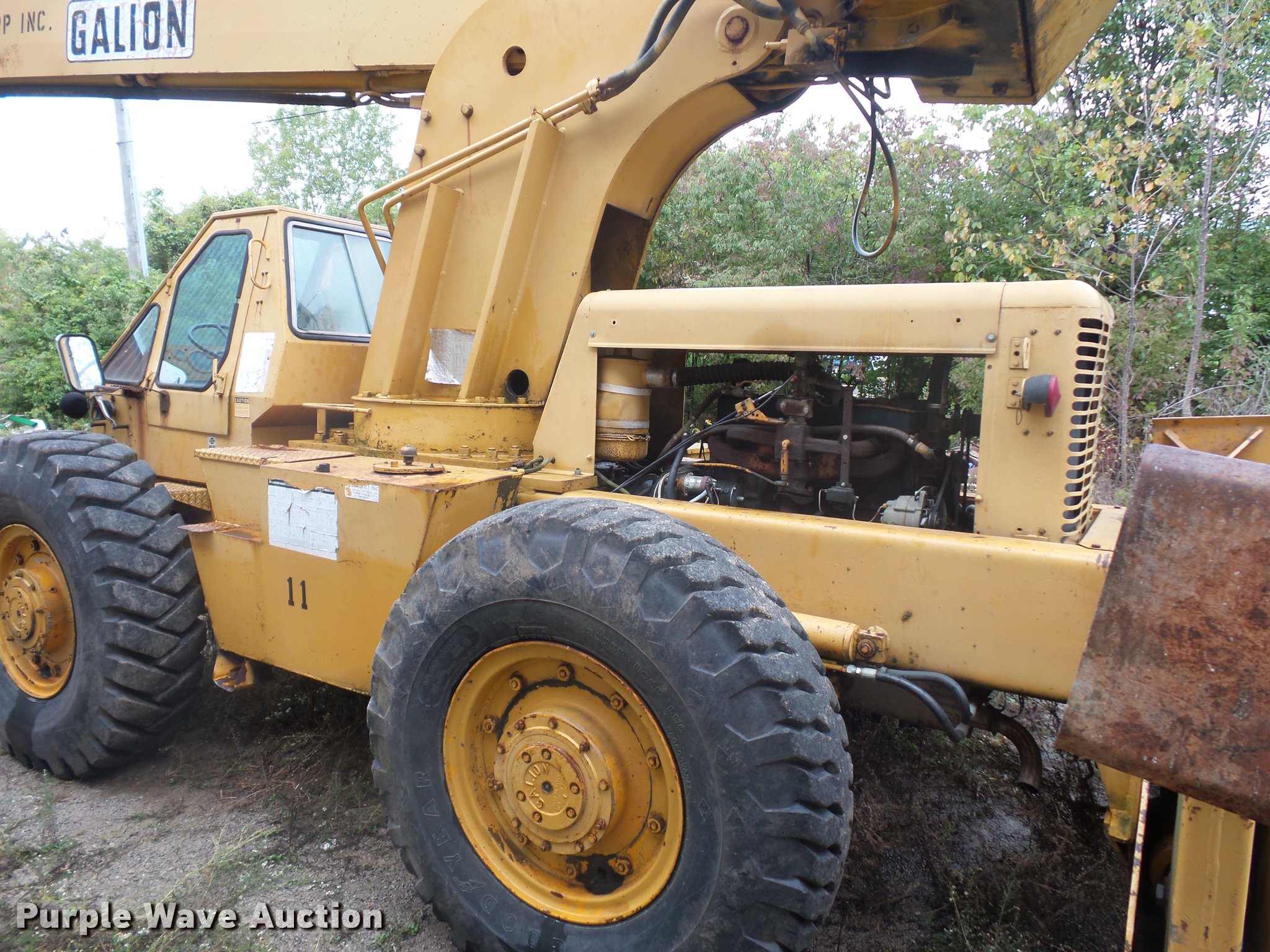 Purple Wave is selling a used Rough or All Terrain Crane in Missouri. This item is a Galion KC10 crane with the following: 3,848 hours on meter, Six cylinder gas engine, Manual transmission, 12.5 ton capacity, Hydraulic outriggers, 14-24 tires, Serial 8124114