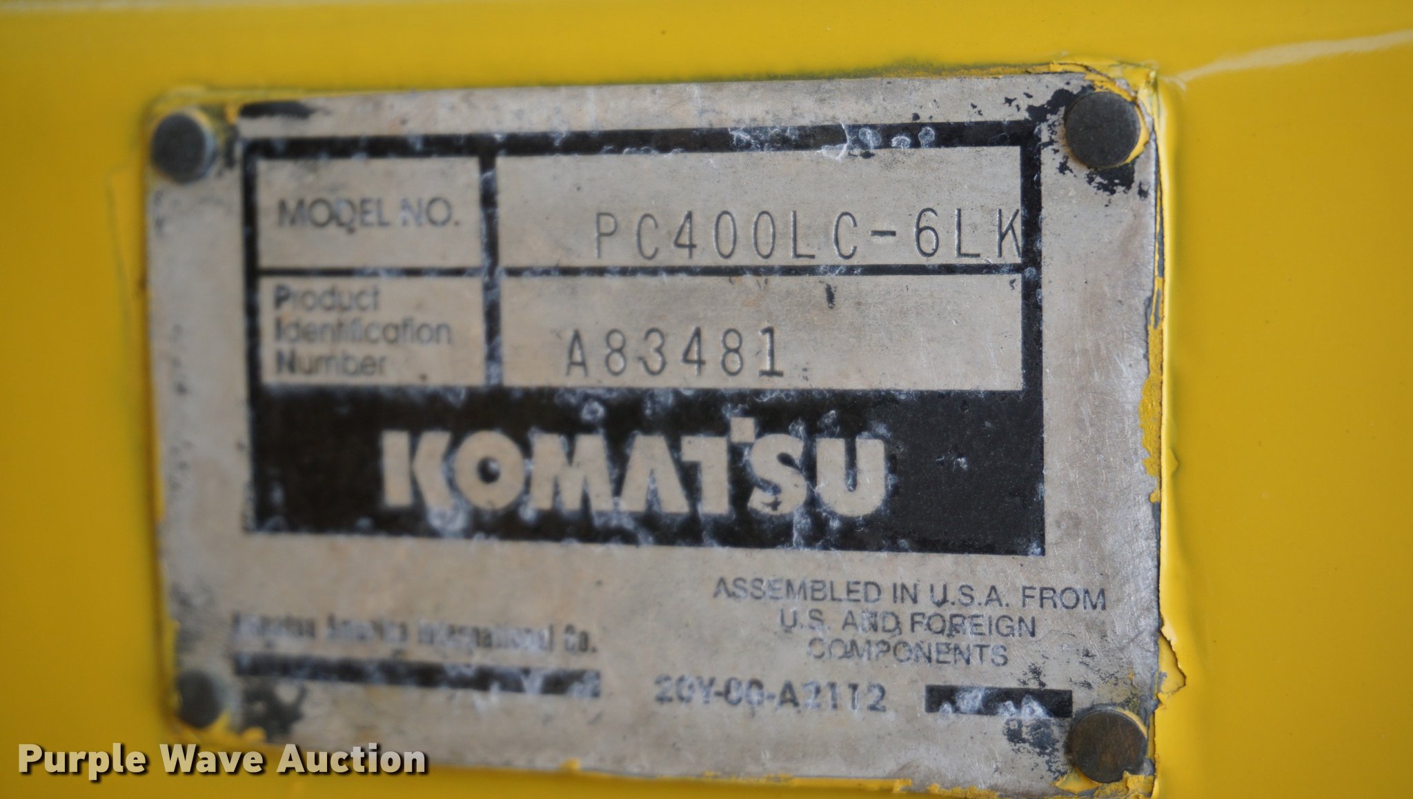 Purple Wave is selling a used Hydraulic Excavator in Kansas. This item is a 2000 Komatsu PC400LC-6LK excavator with the following: 15,539 hours on meter, Komatsu 11.0L six cylinder turbo diesel engine, 305 HP, Three speed hydrostatic transmission, EROPS, AC and heat, AM/FM, Suspension seat, Front work lights, Standard boom, 13'1" stick length, JRB hydraulic quick coupler, 35.5"W steel triple grouser track pads, Serial A83481